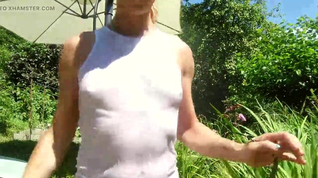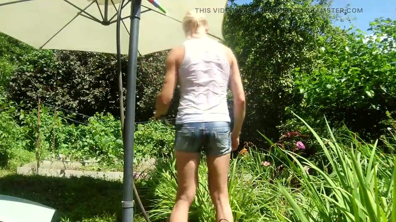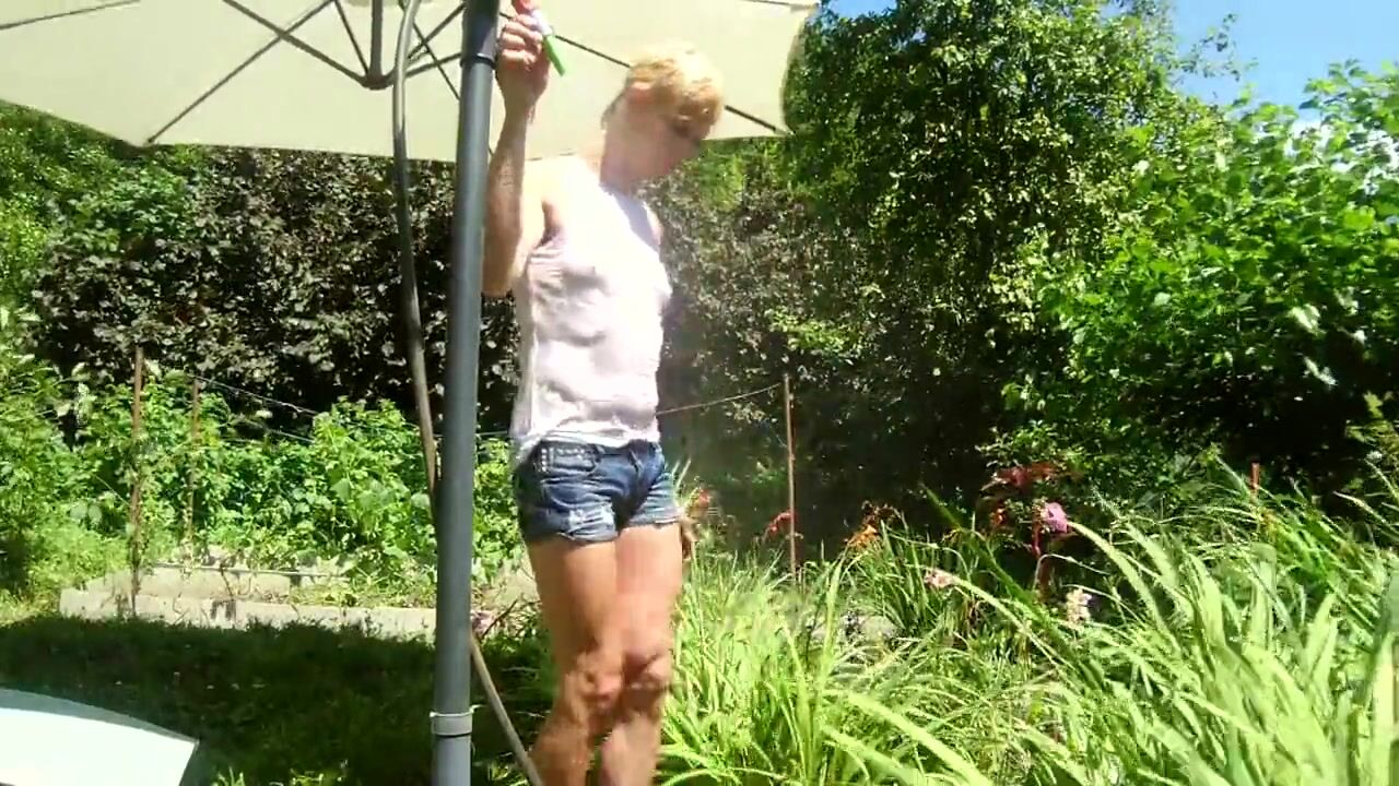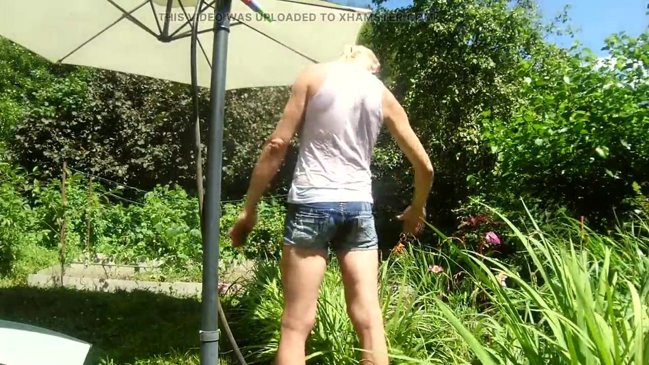 Alexa Cosmic trans girl wetting & wetlook in the garden in white t-shirt and denim shorts under water from a hose...