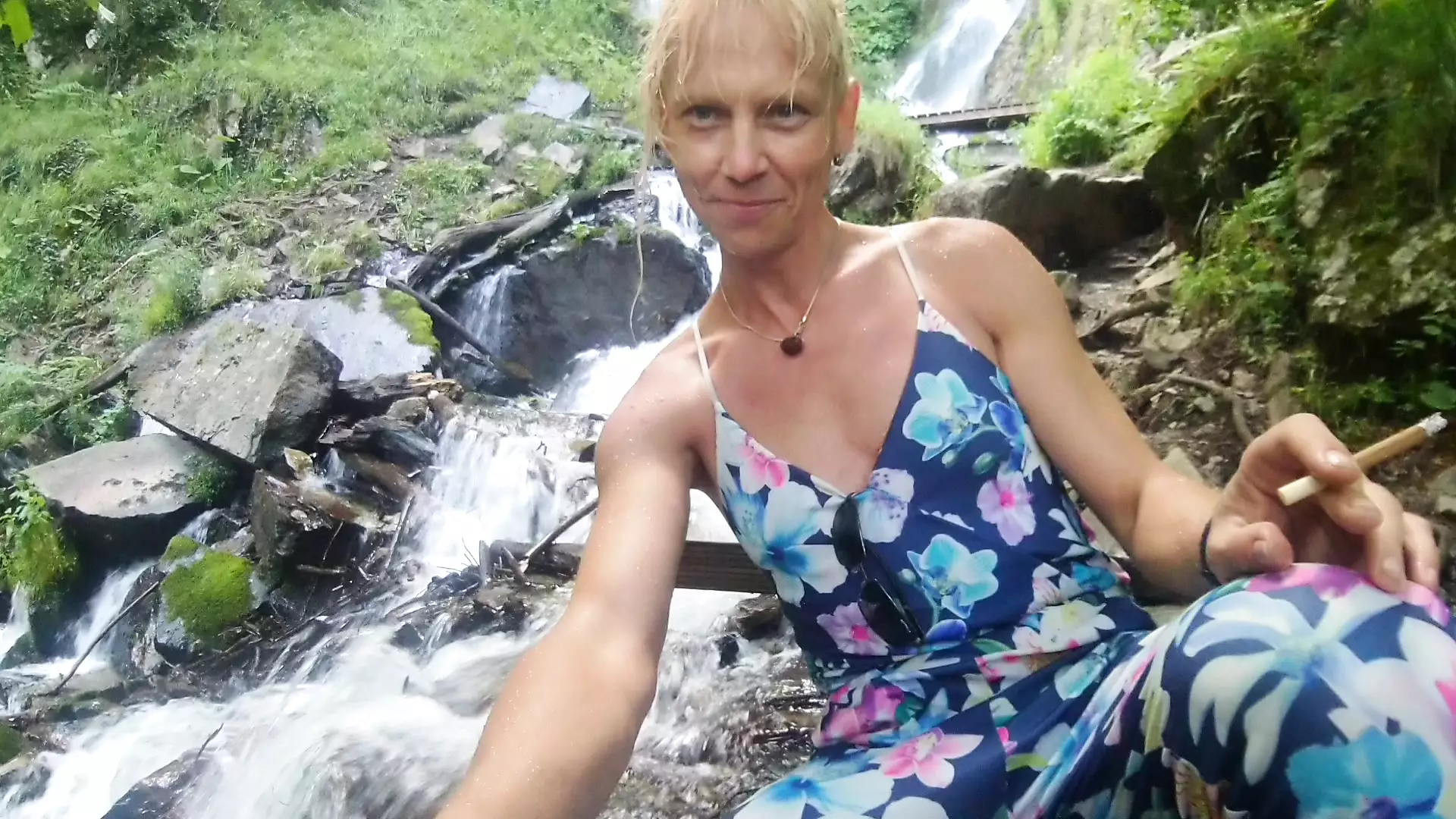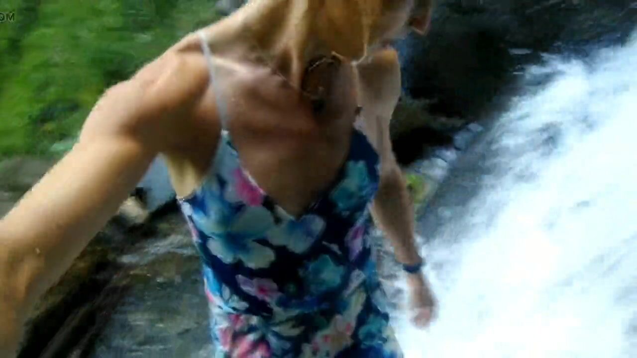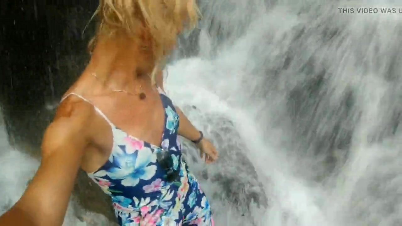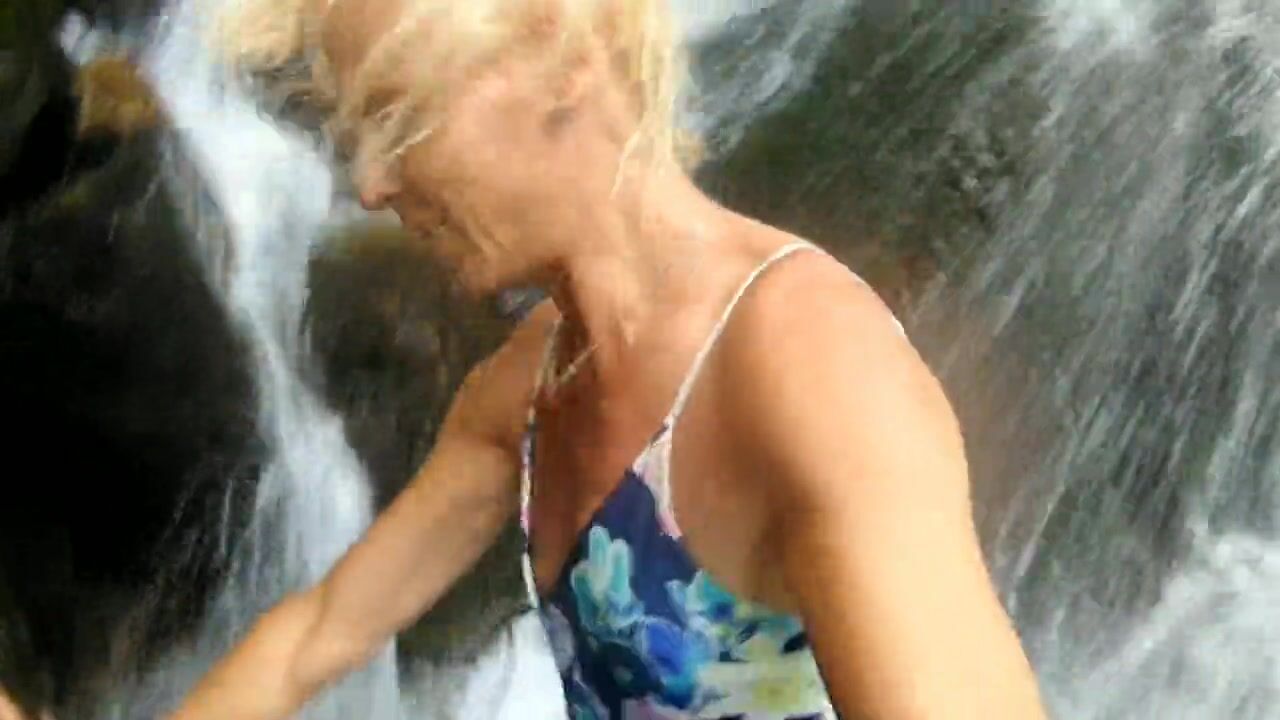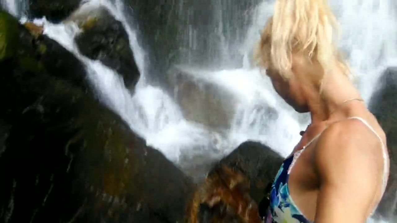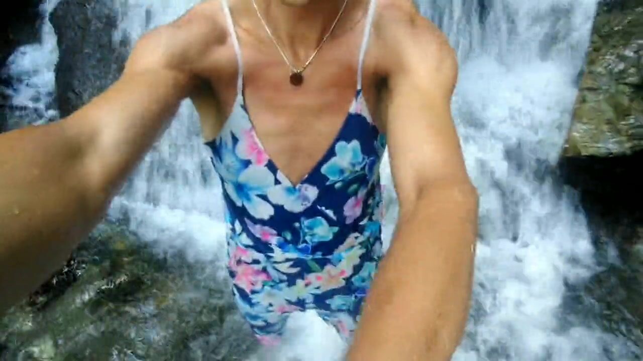 Alexa Cosmic swimming in beautiful waterfall wearing colorful combi dress...