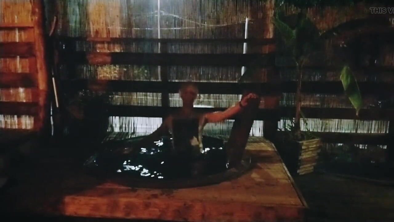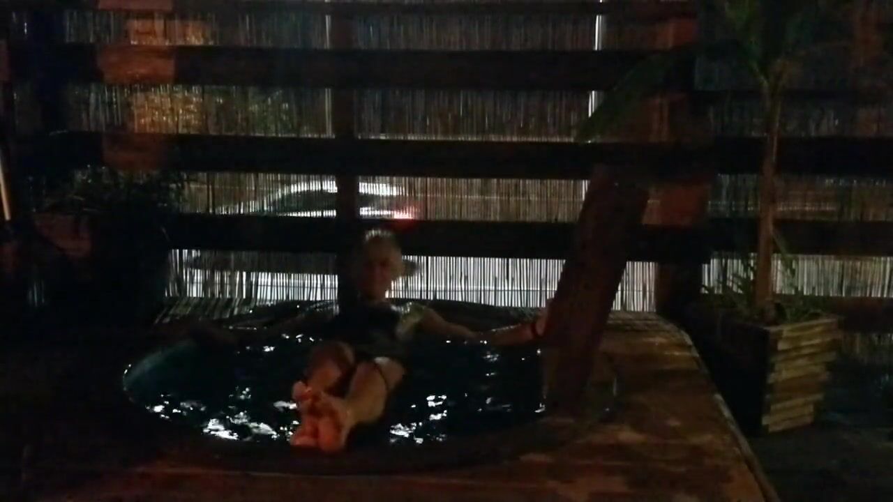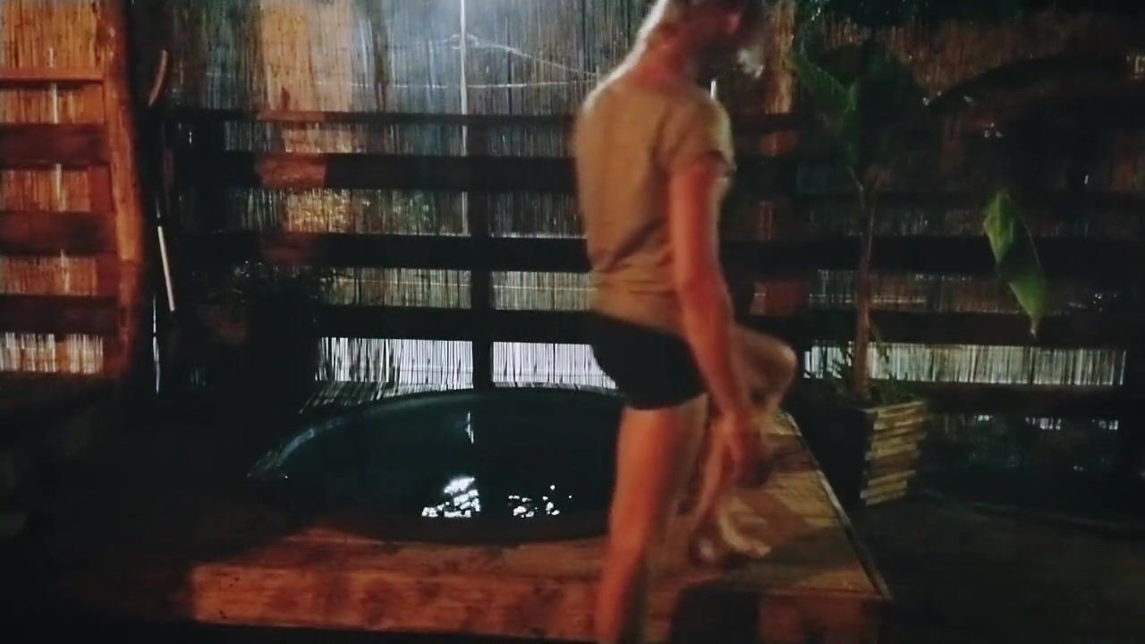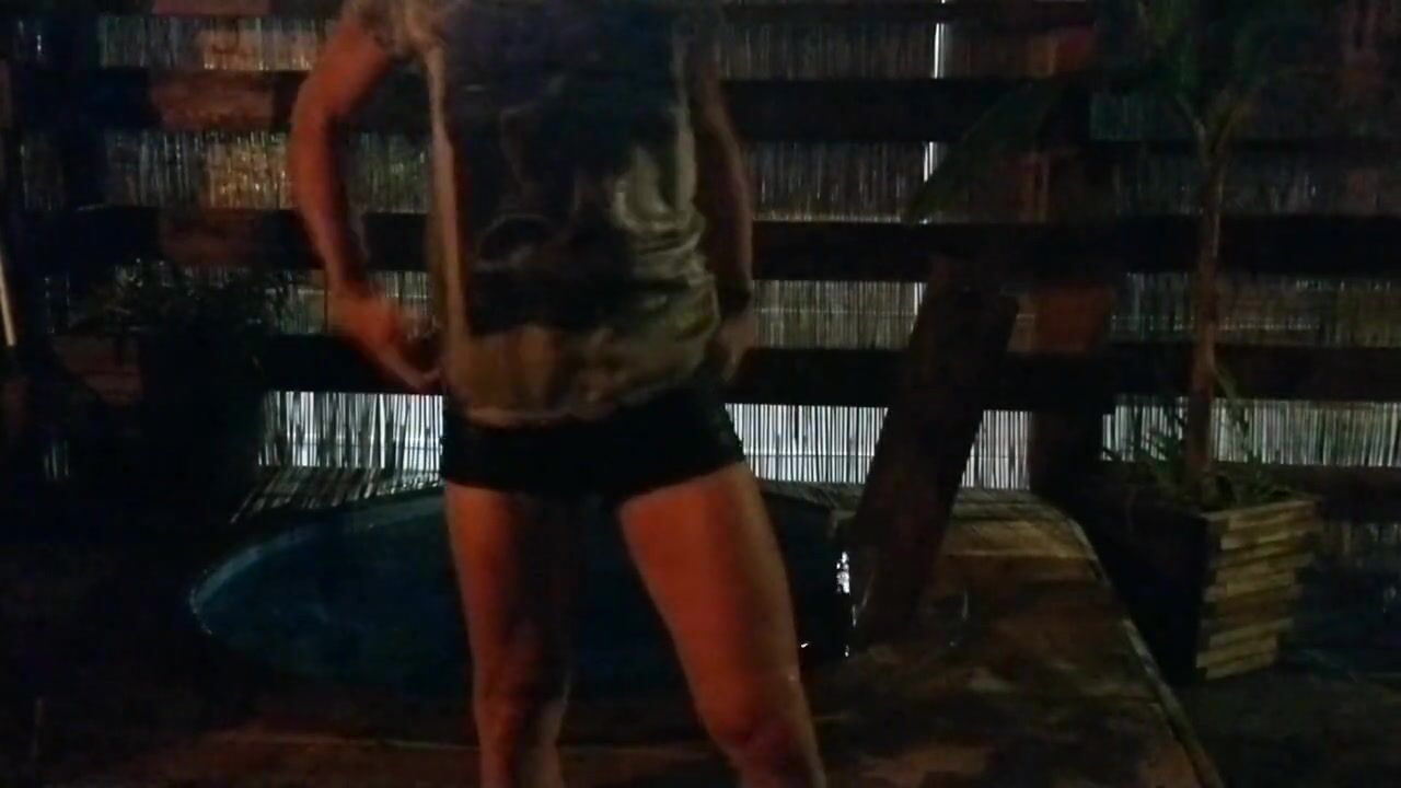 Alexa Cosmic swimming in pool after sauna in new t-shirt and black short sexy shorts. Wetlook in sauna.