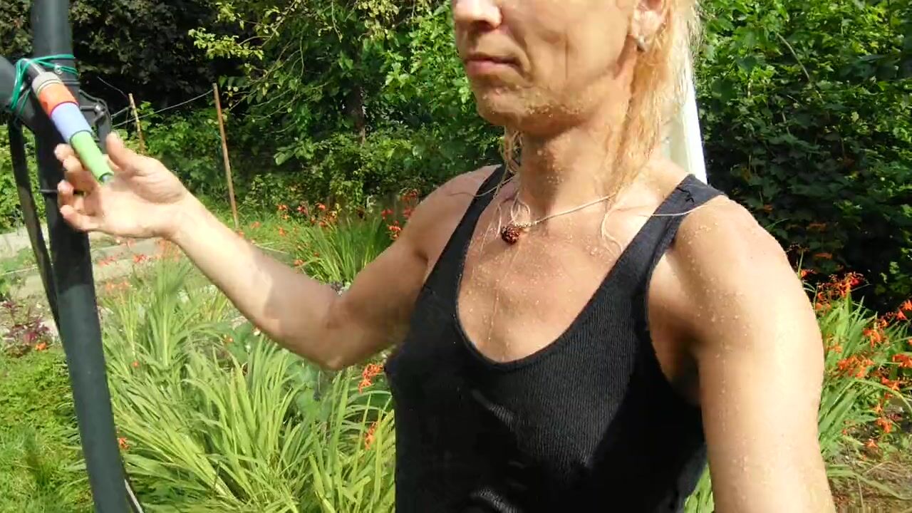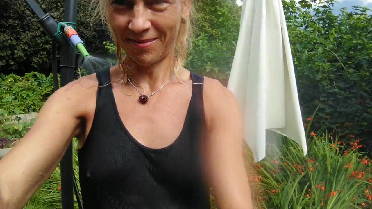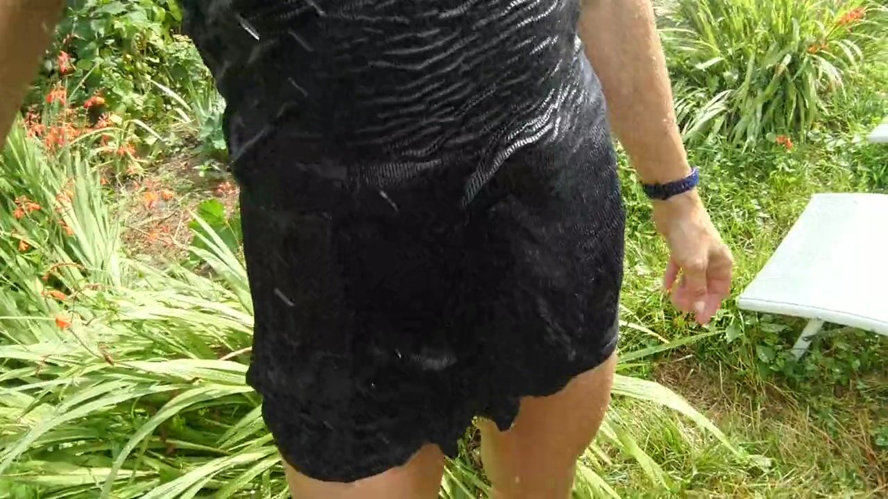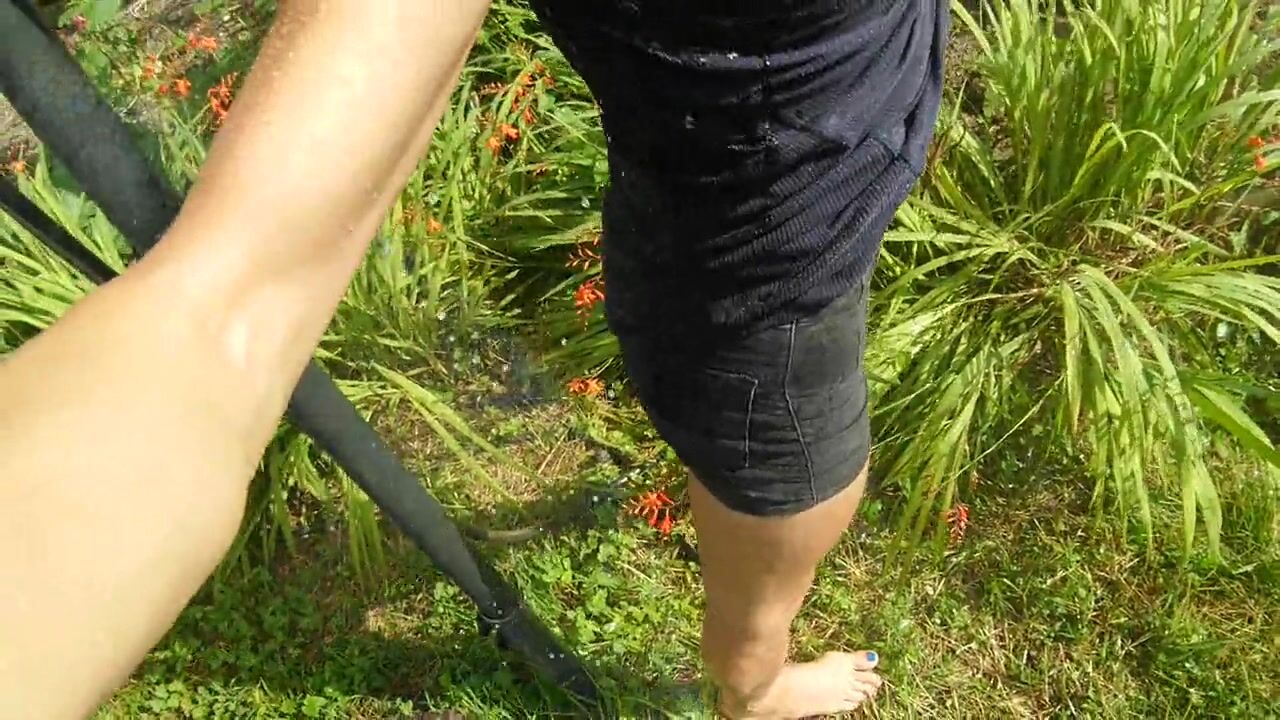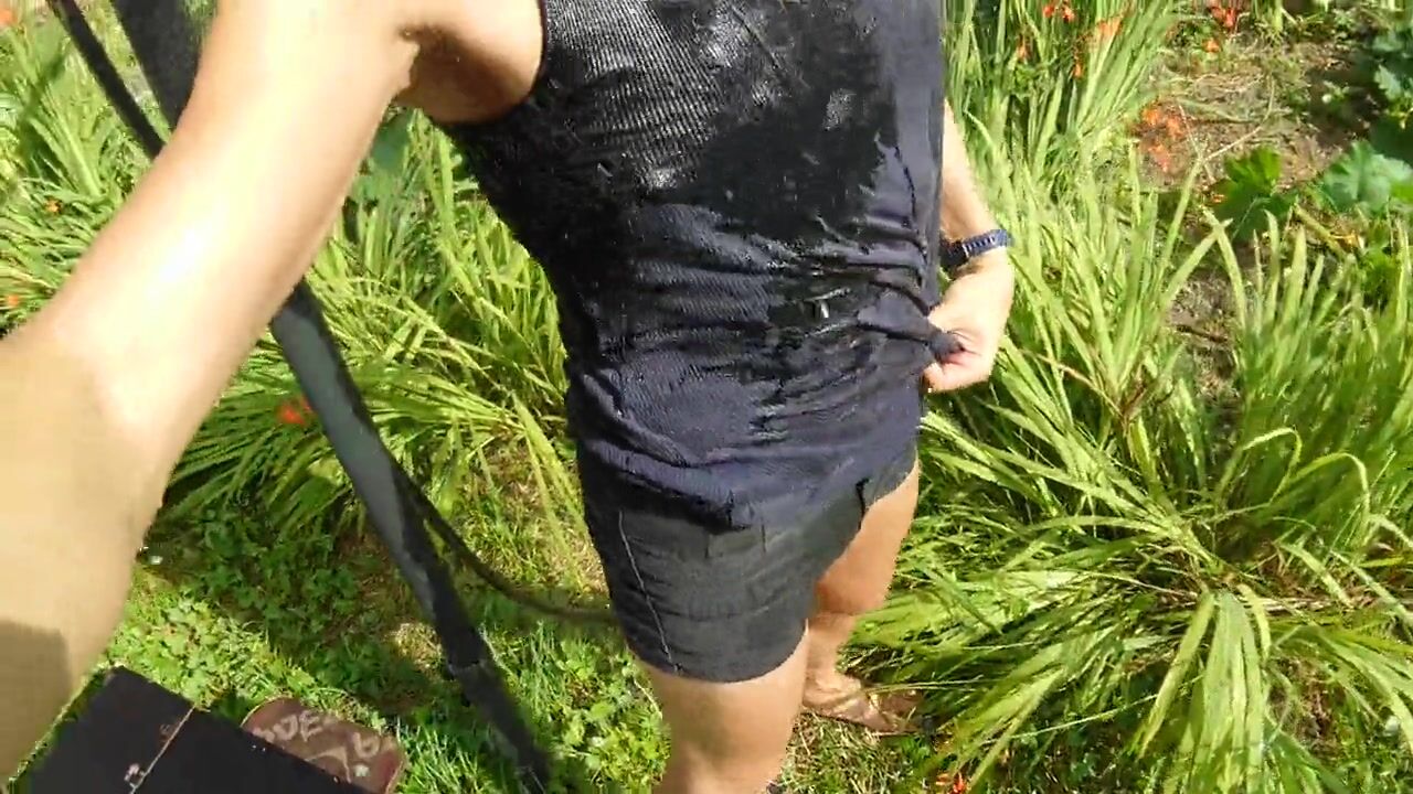 Refreshing & wetting t-shirt and black shorts in hose in the garden...