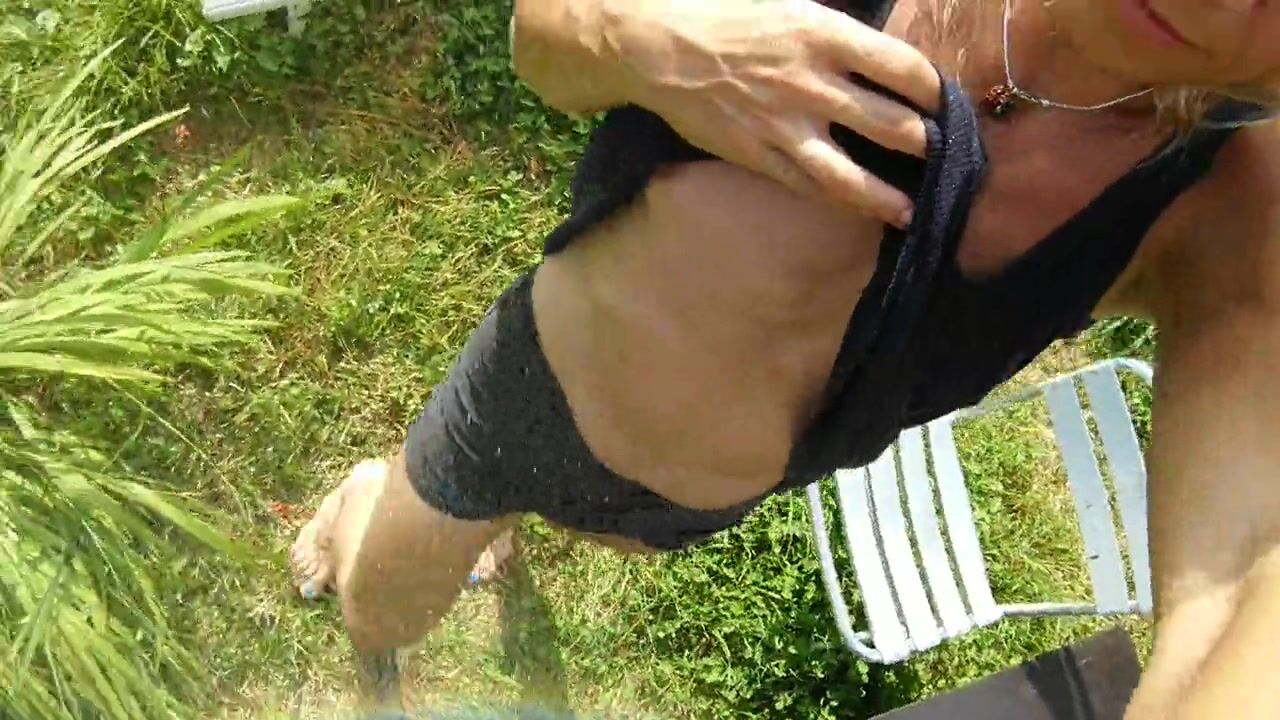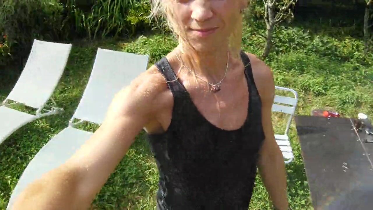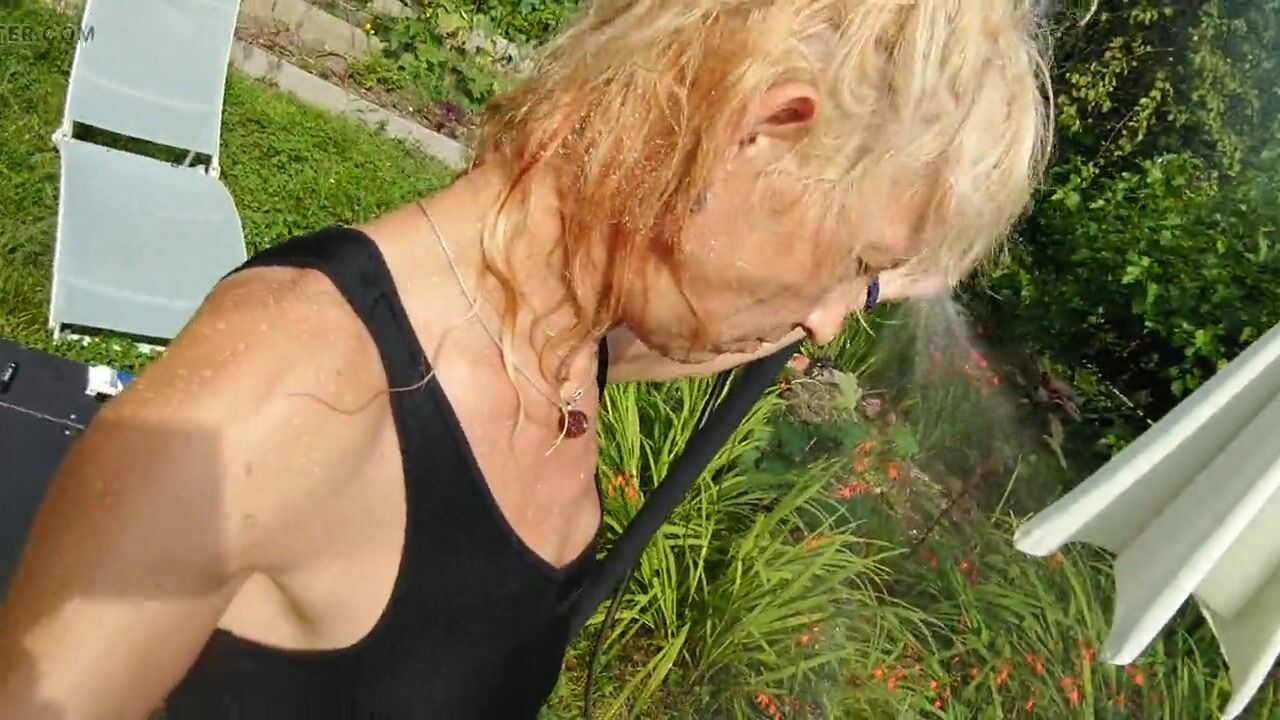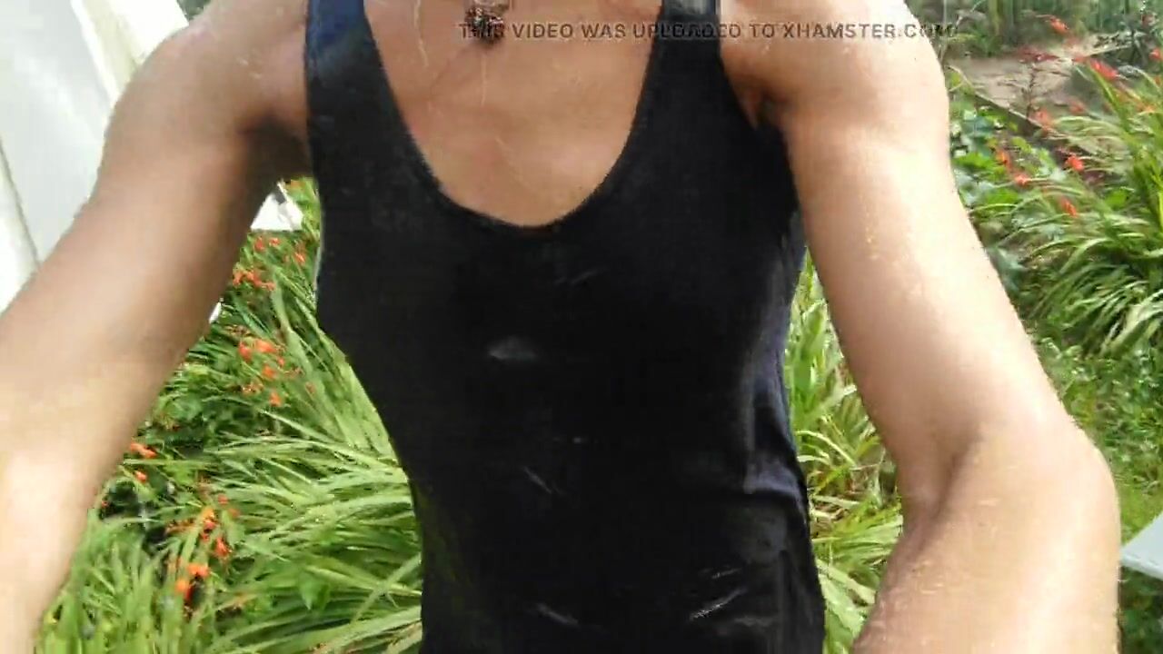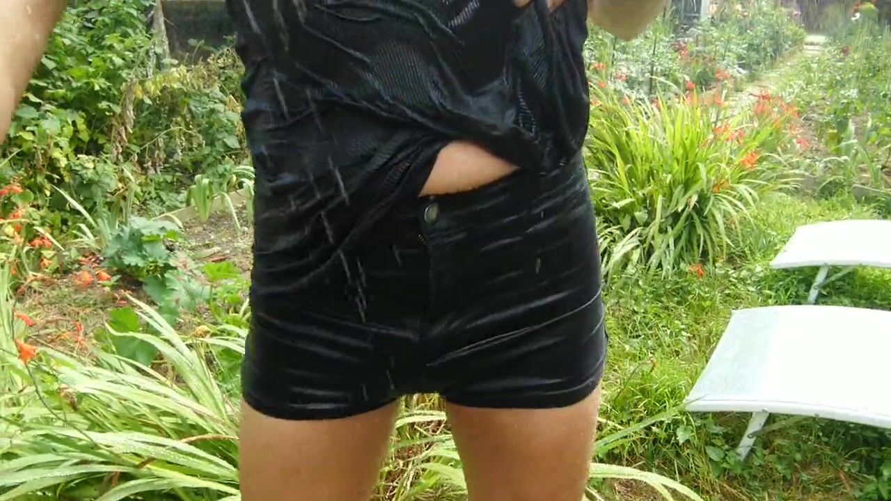 Refreshing & wetting t-shirt and black shorts in hose in the garden...