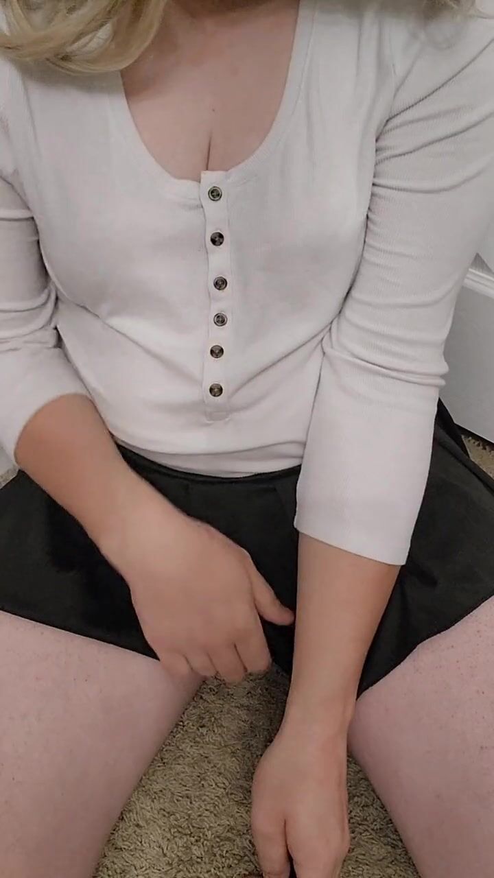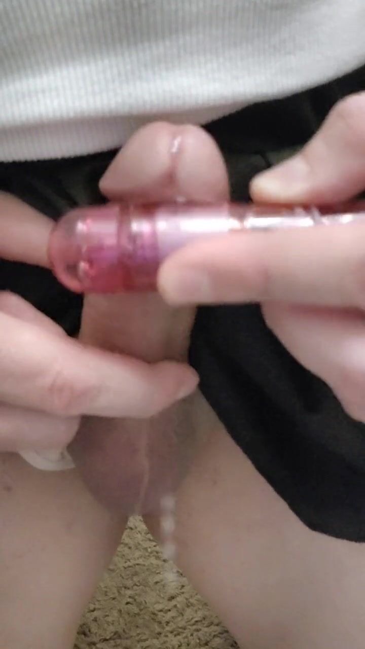 Small dick crossdresser teasing and using vibrator to shoot big load