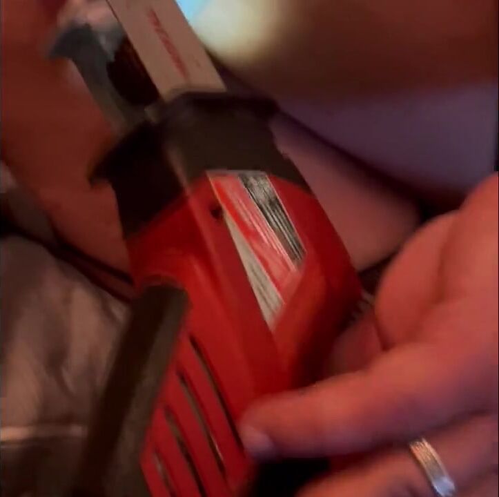 Sissy in lingerie playing with a dildo mounted to a power took.