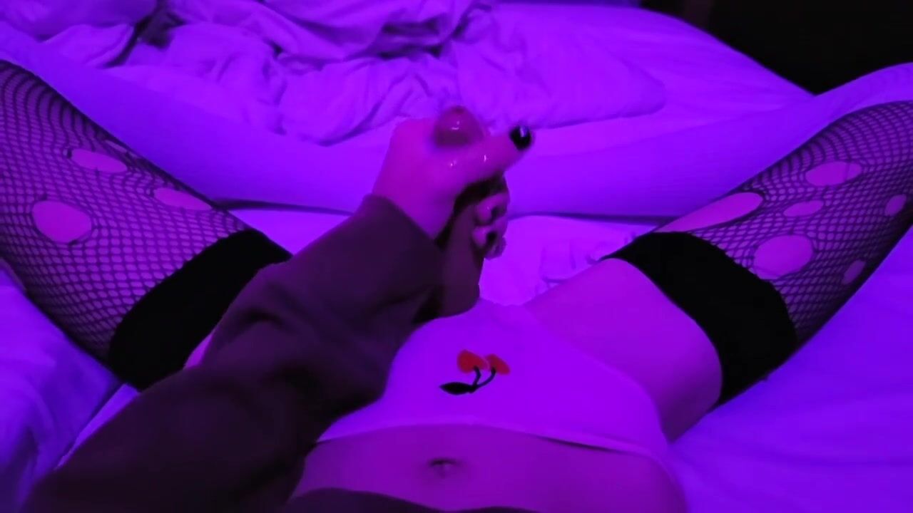 Cute skinny femboy twink cums all over pink panties