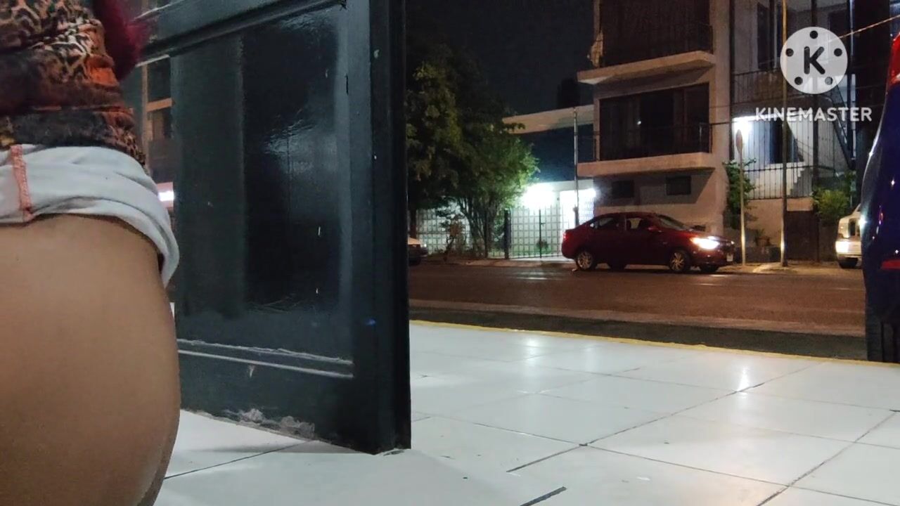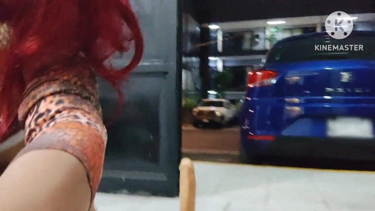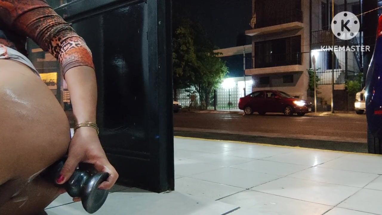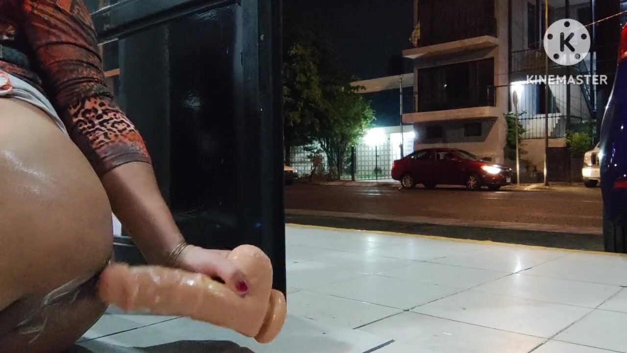 Limp sissy clitty dildoing her ass on the open door while cars pass by