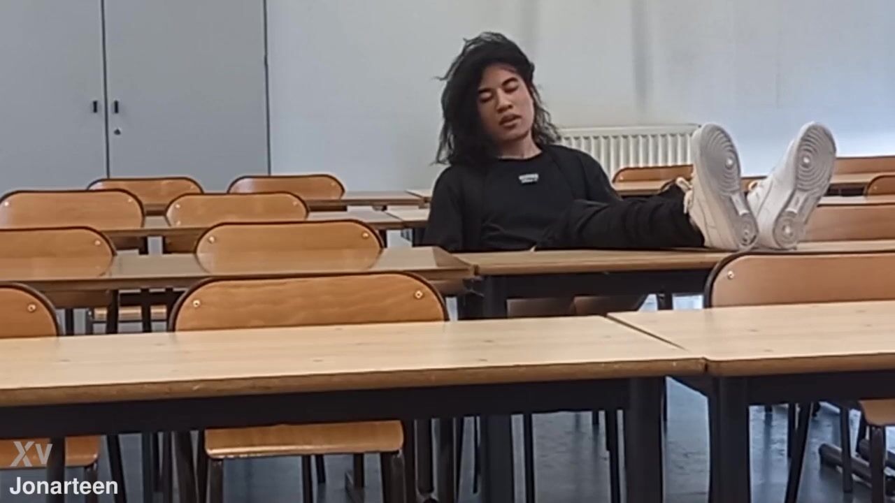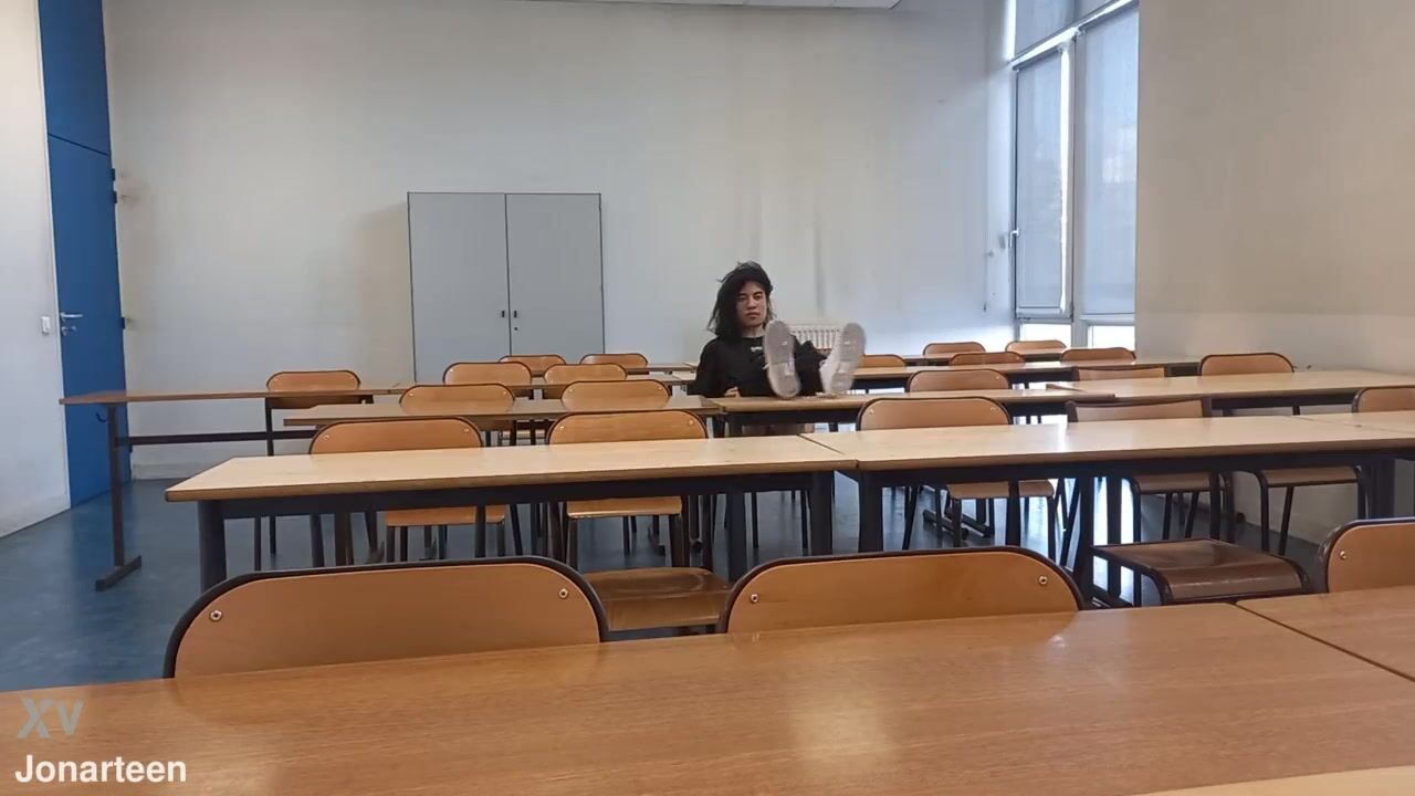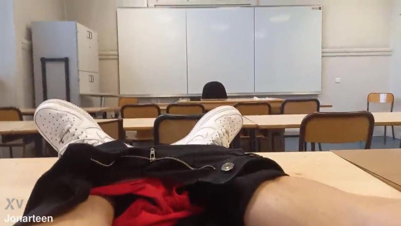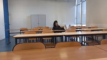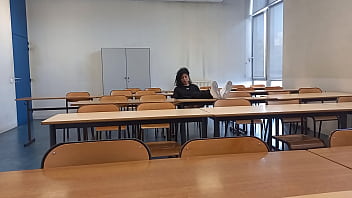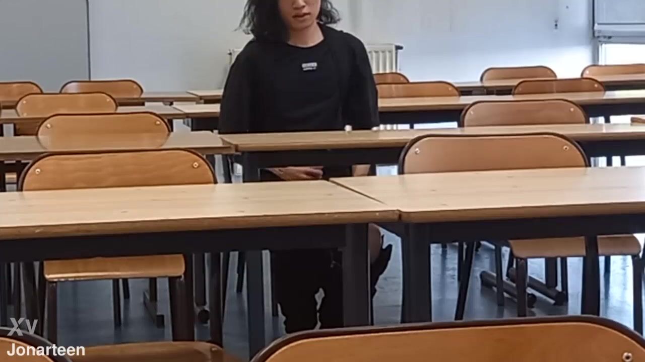 Horny at school during course revision, this French-Asian student takes out his cock in public, jerks off in a risky university classroom