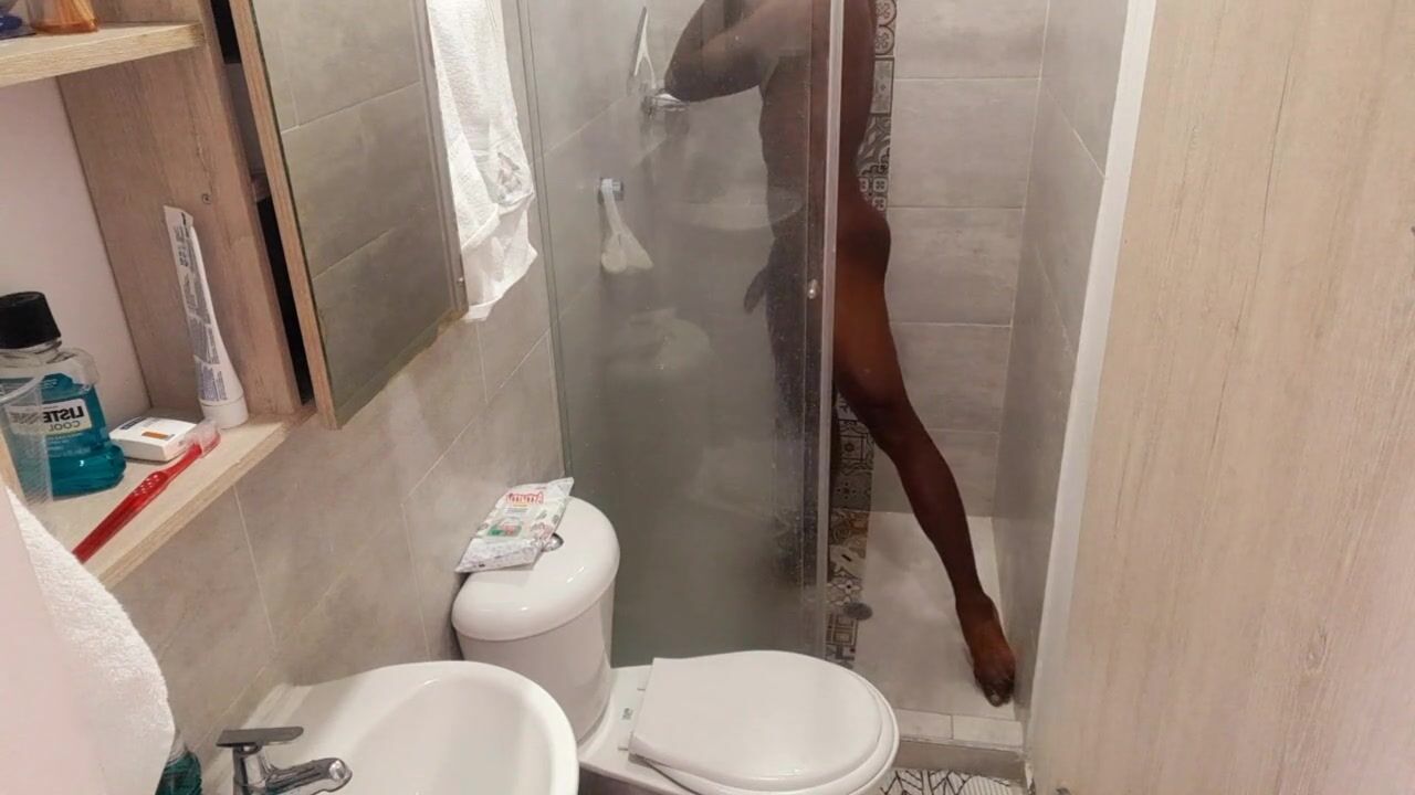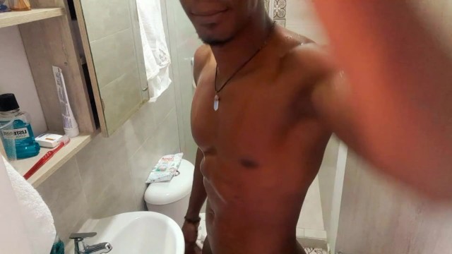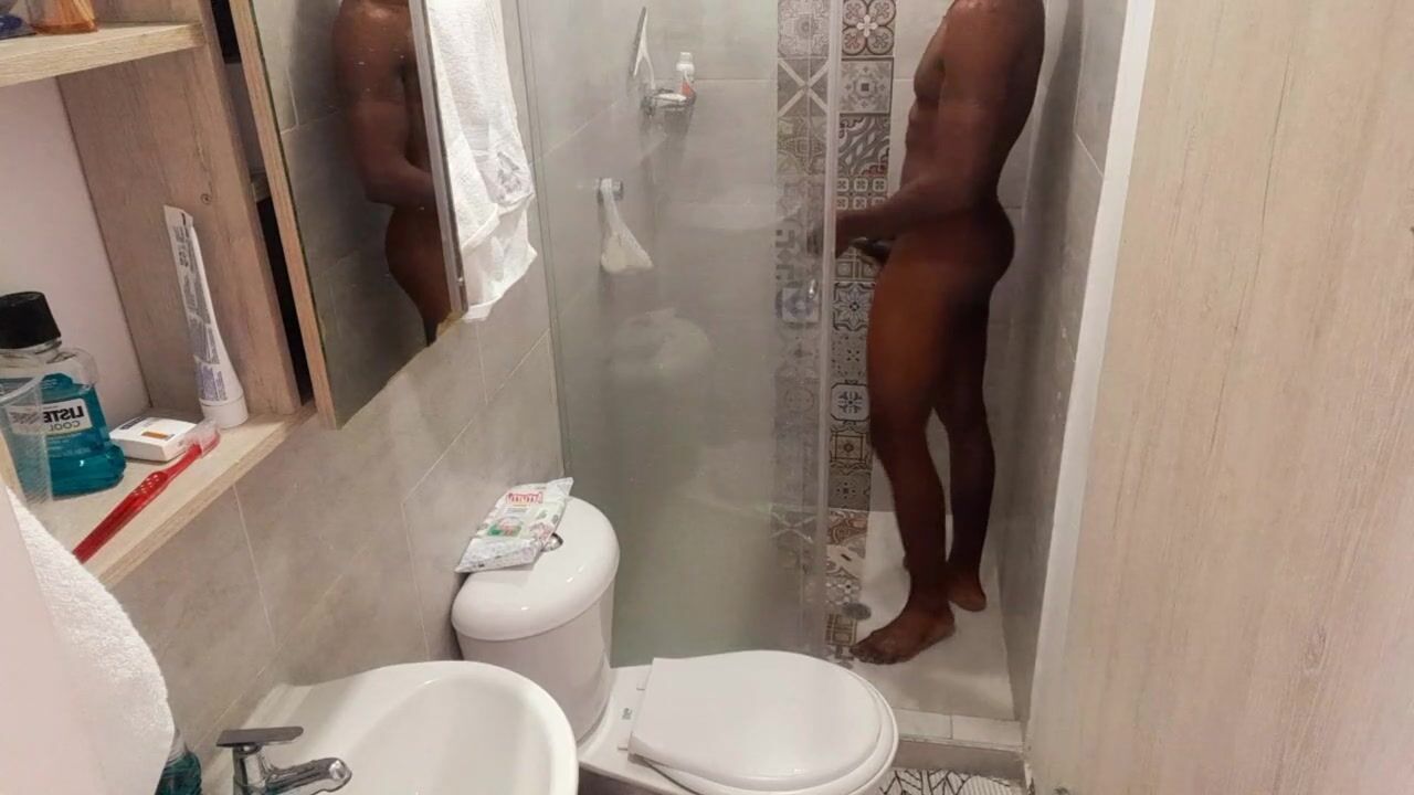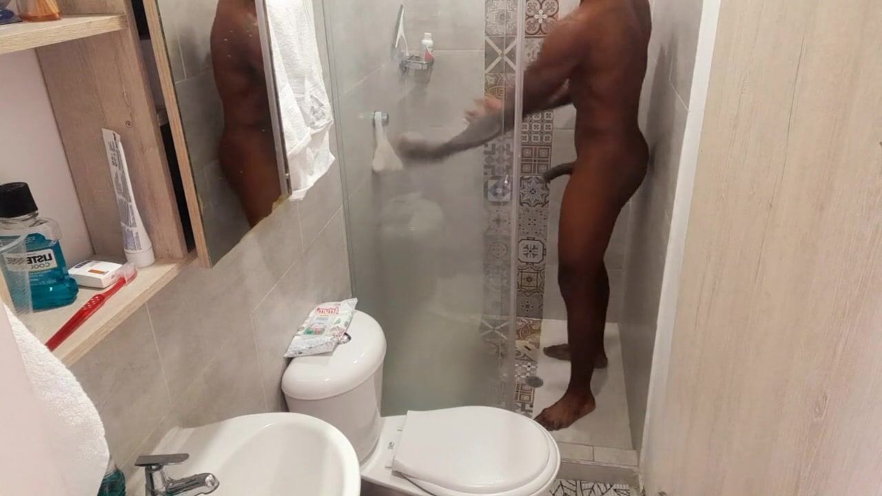 Fit stud bathing after masturbating / Play in the shower Huge dick having fun/huge soft black cock