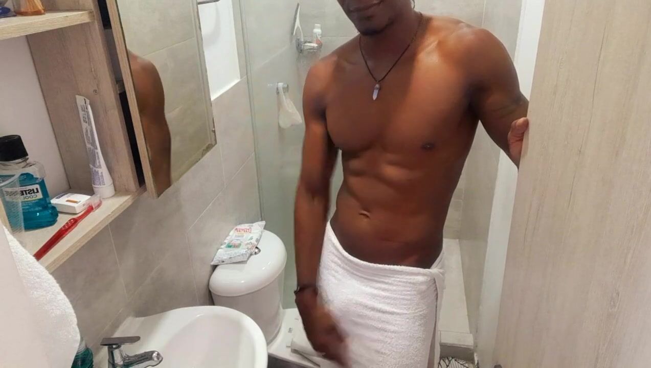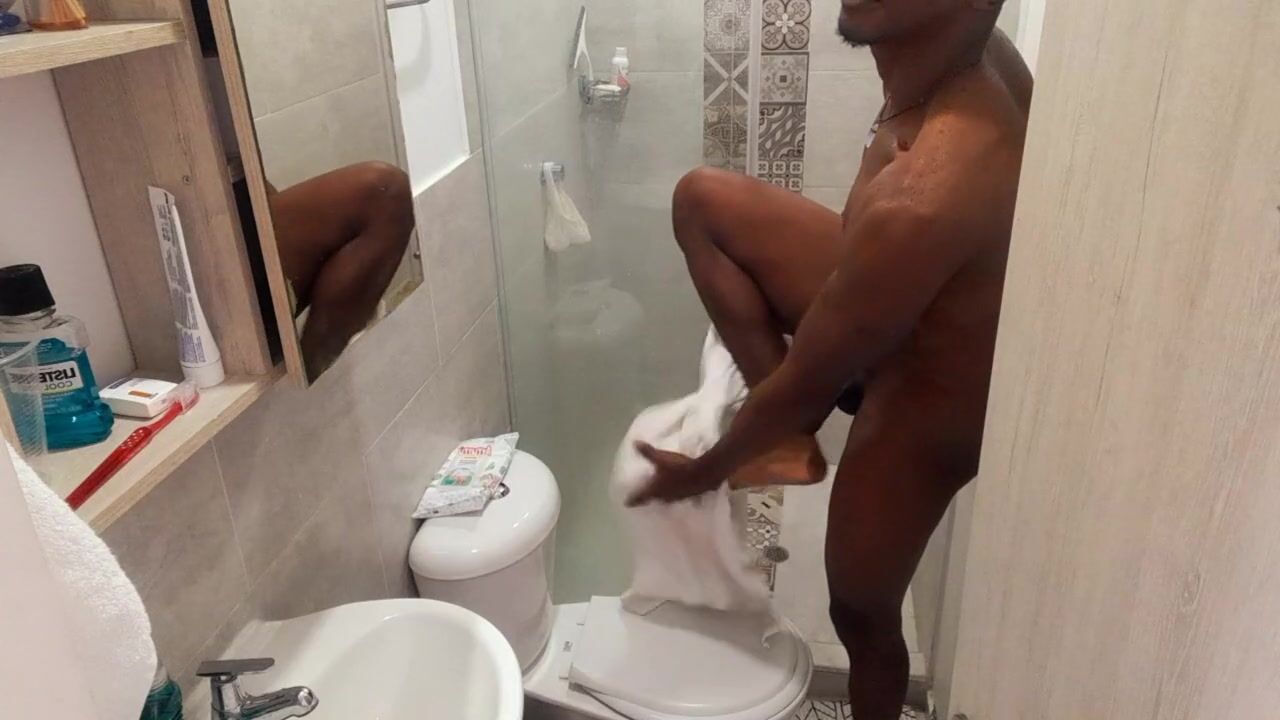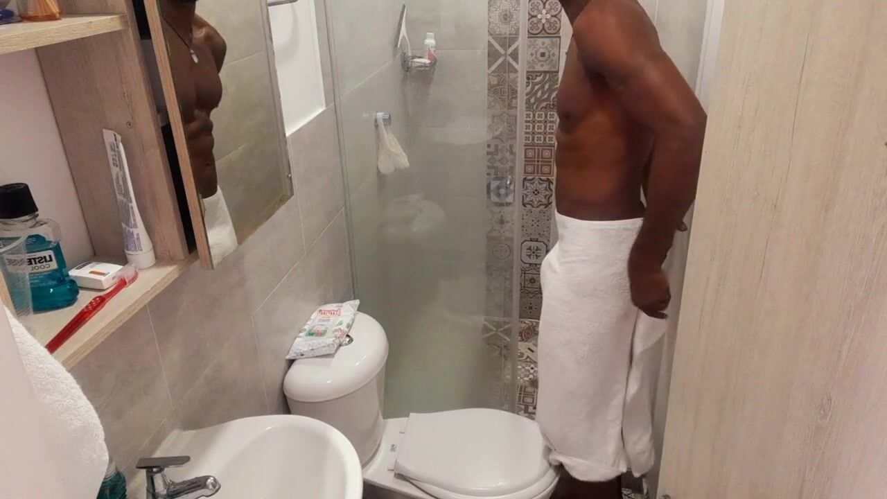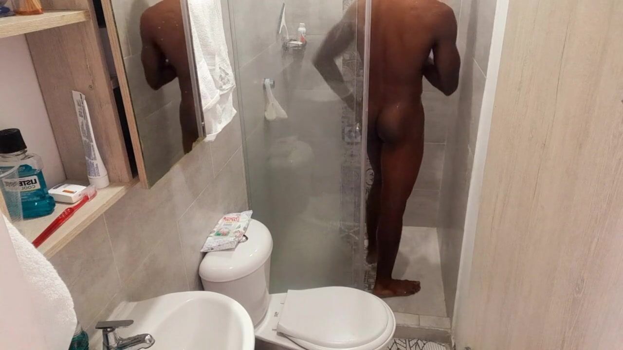 Fit stud bathing after masturbating / Play in the shower Huge dick having fun/huge soft black cock