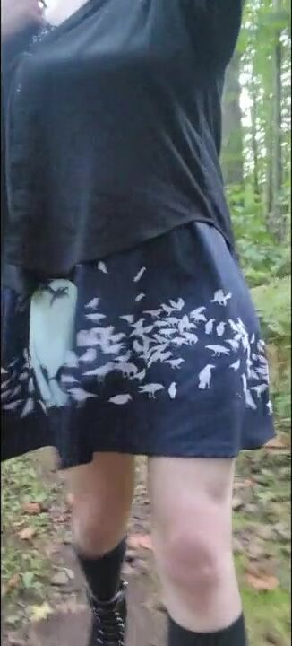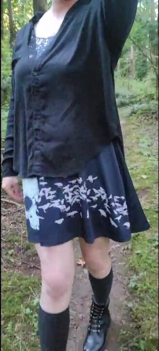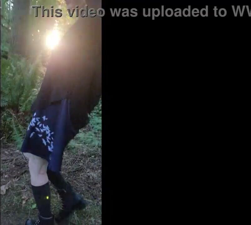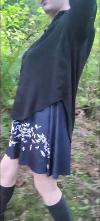 Femboy goes panty-less in public forest! Shemale cock and ass stick out from dress