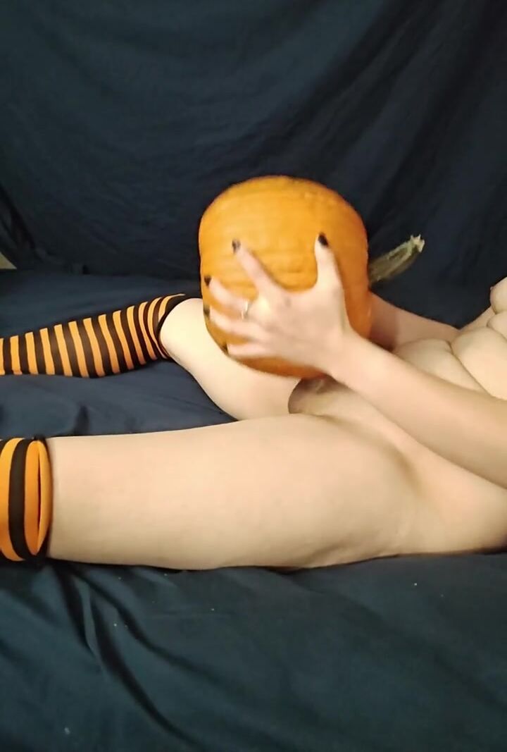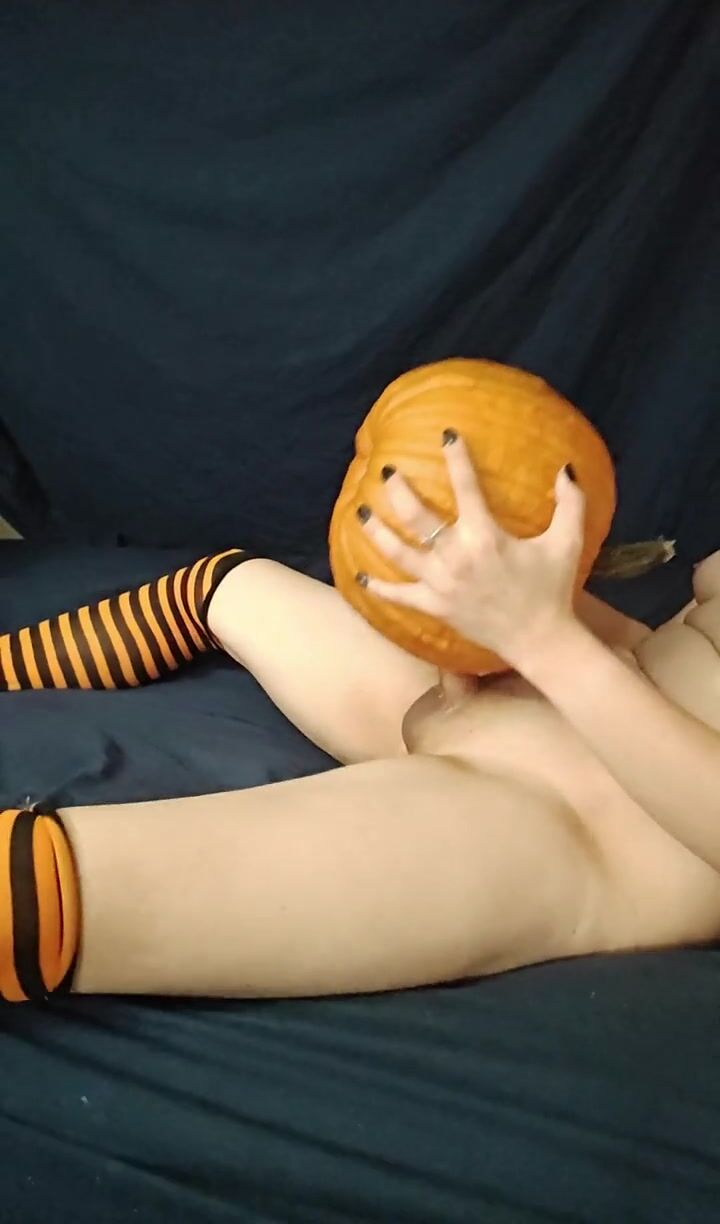 Tran's girl with fangs fucks pumpkin in thigh highs