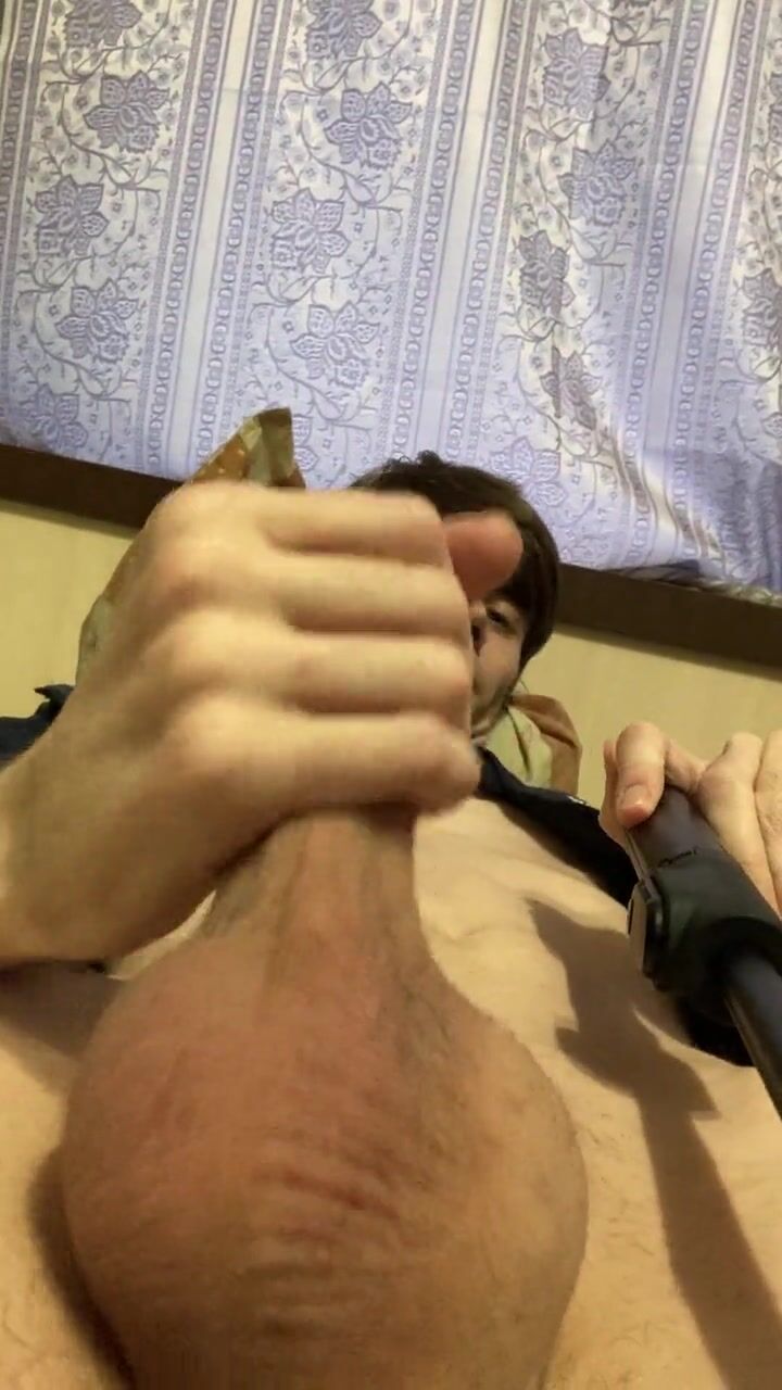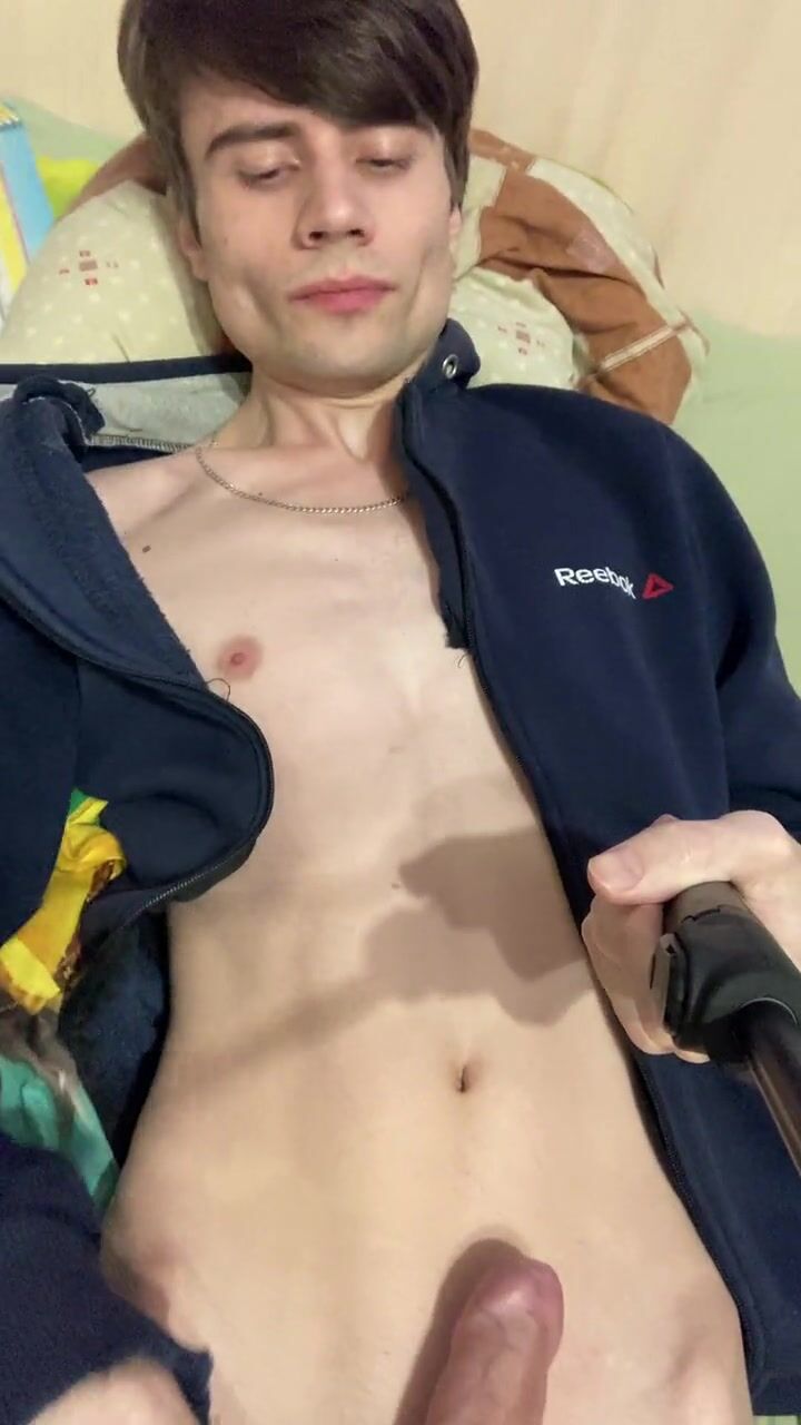 A guy in a blue biker lies on the bed and jerks off his penis and ends with sperm