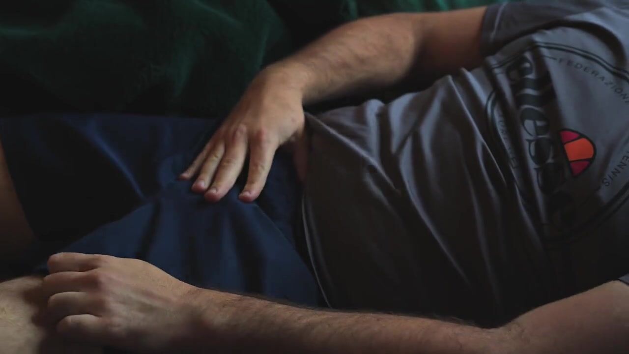 Brit bear wanks on sofa cums over Ellesse sports top