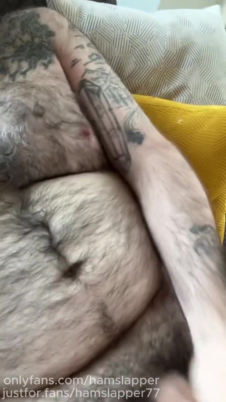Hairy dad sits back and strokes on the couch, grunting, teasing and edging out a big load