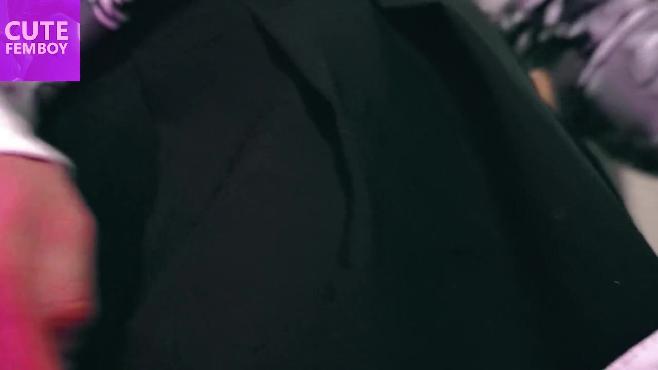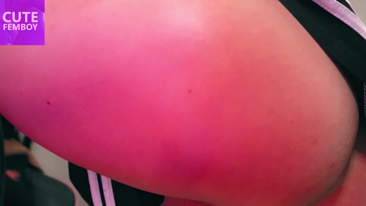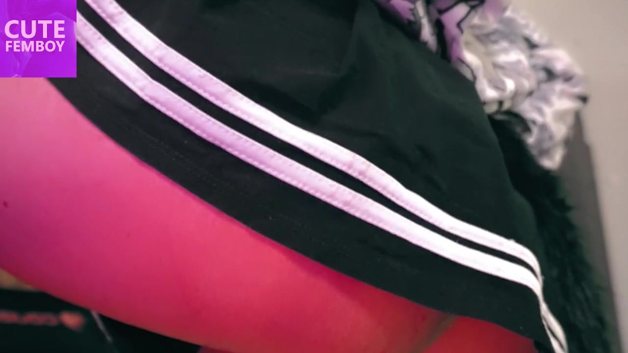 Cute femboy gets on her back, lifts her skirt and stimulates her virgin anus