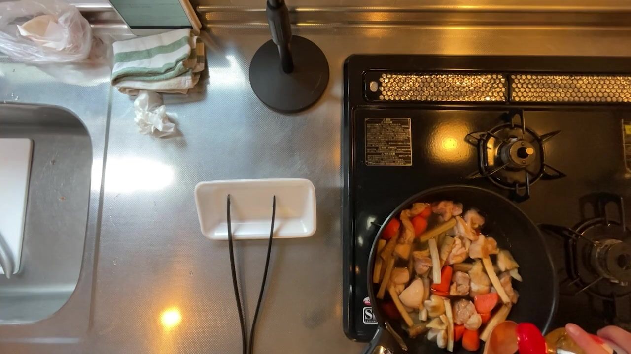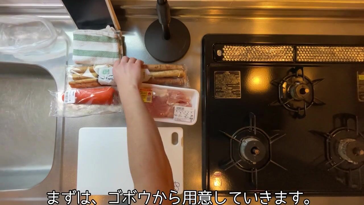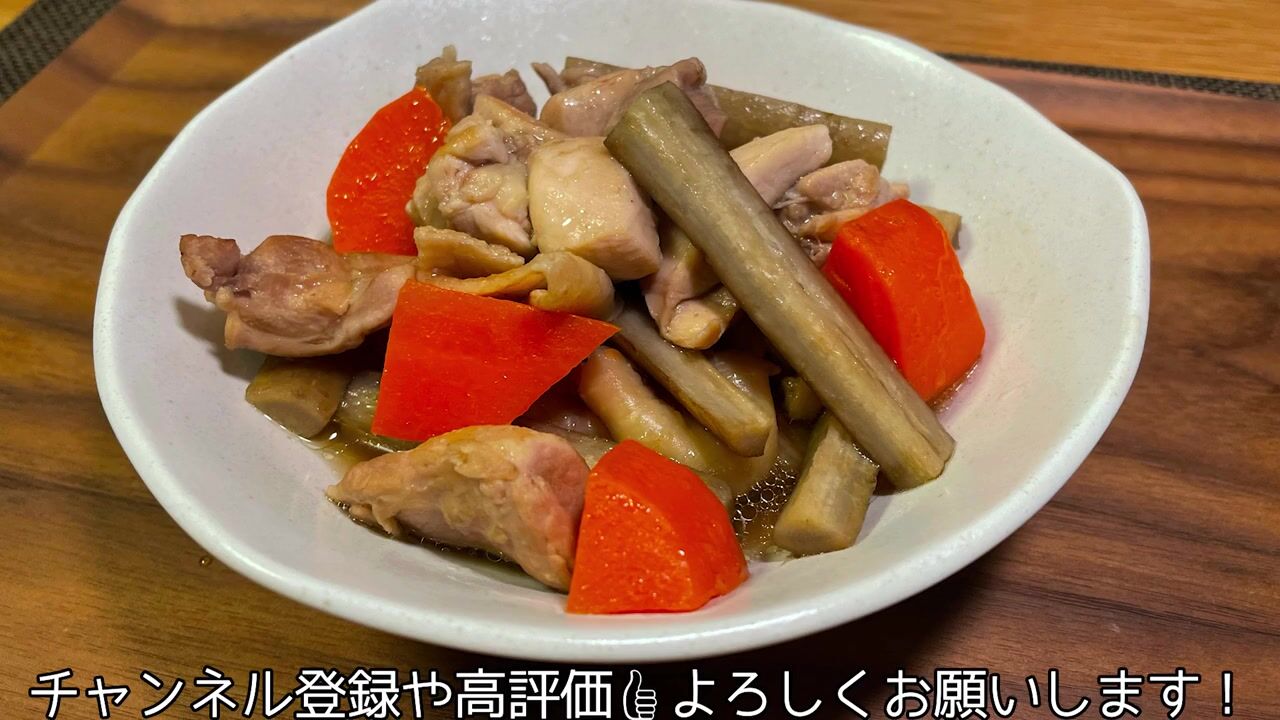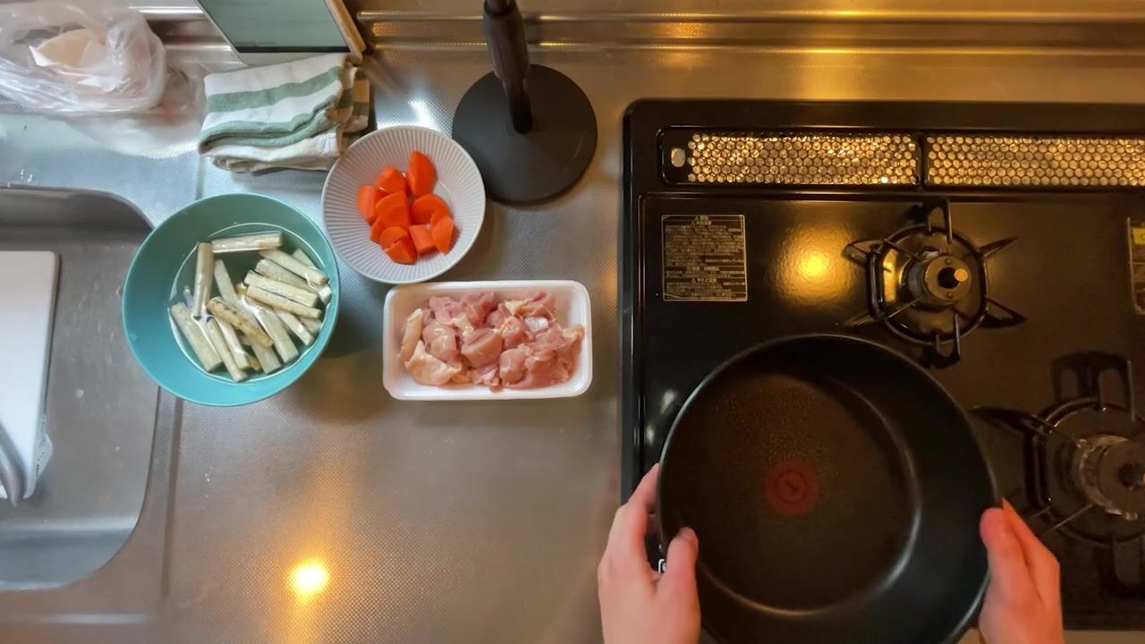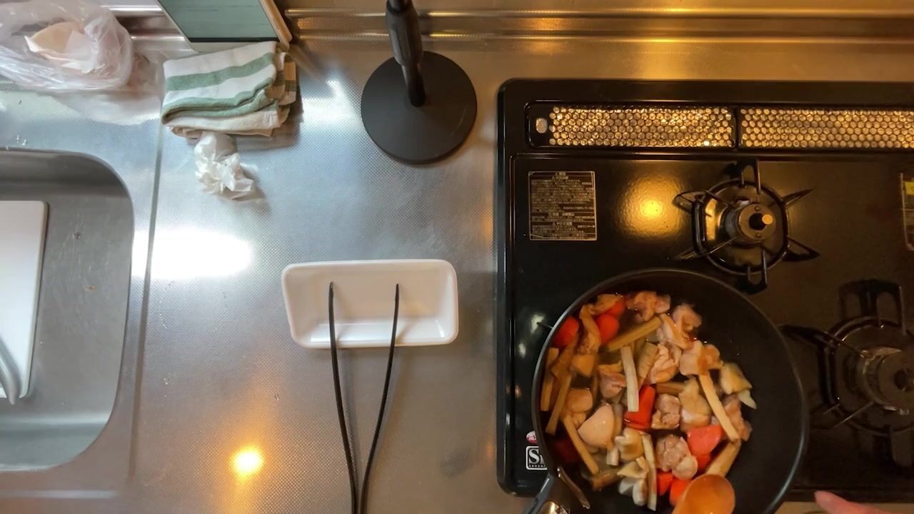A man wearing pants makes sweet and spicy stew of chicken and burdock.