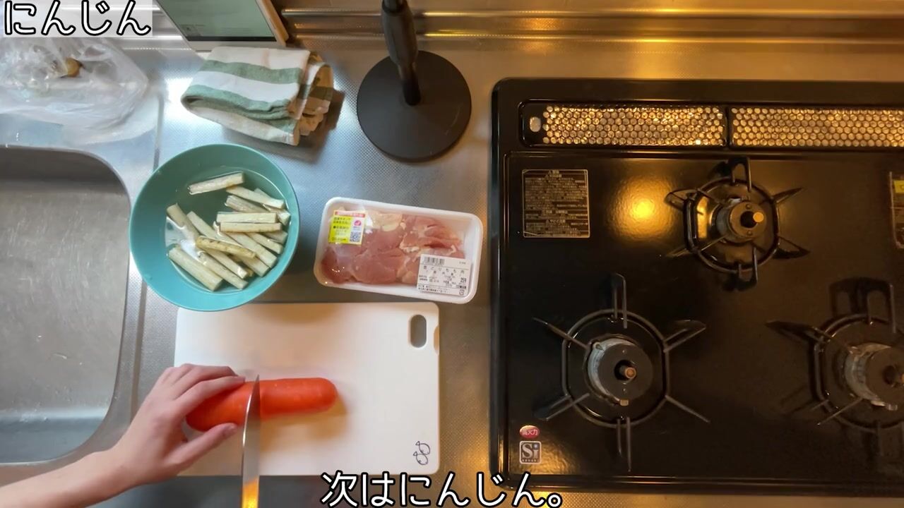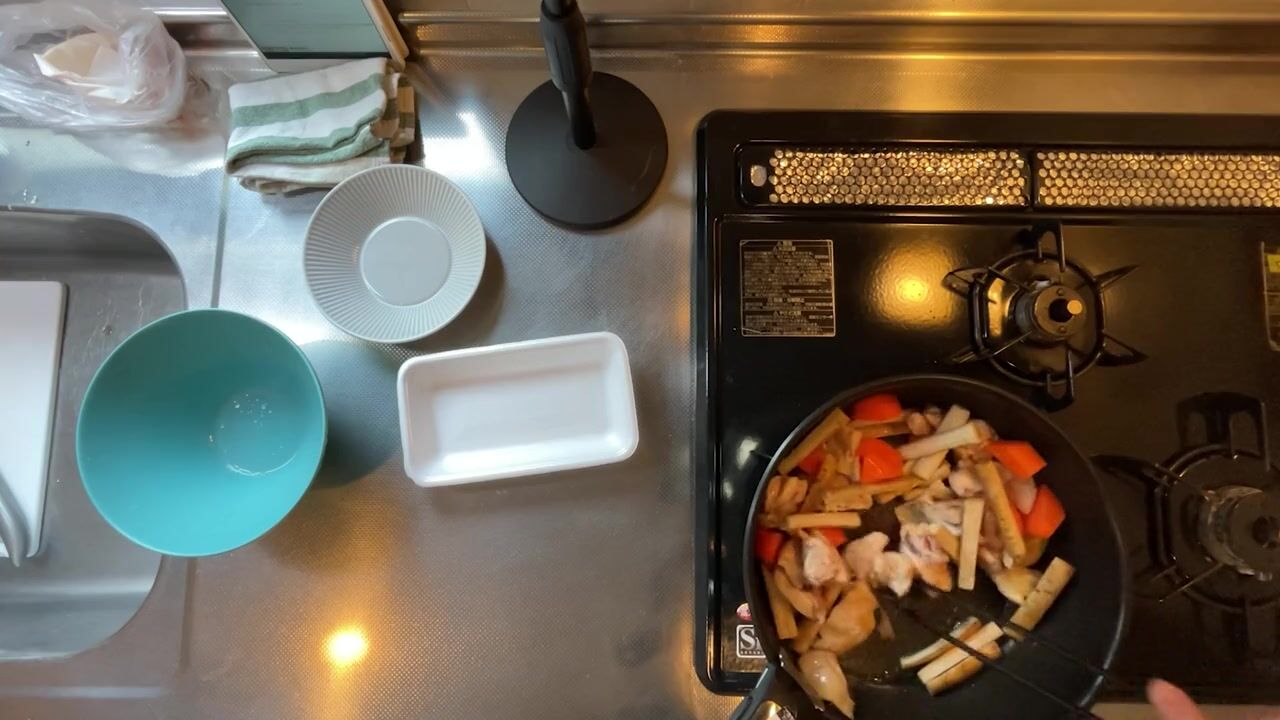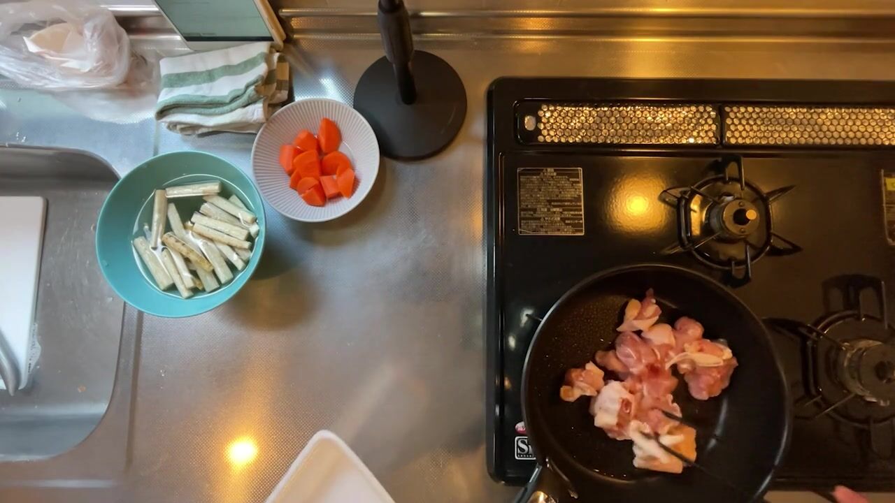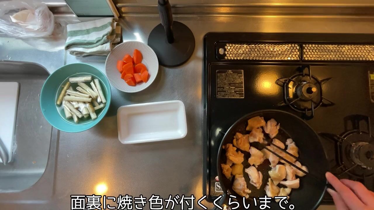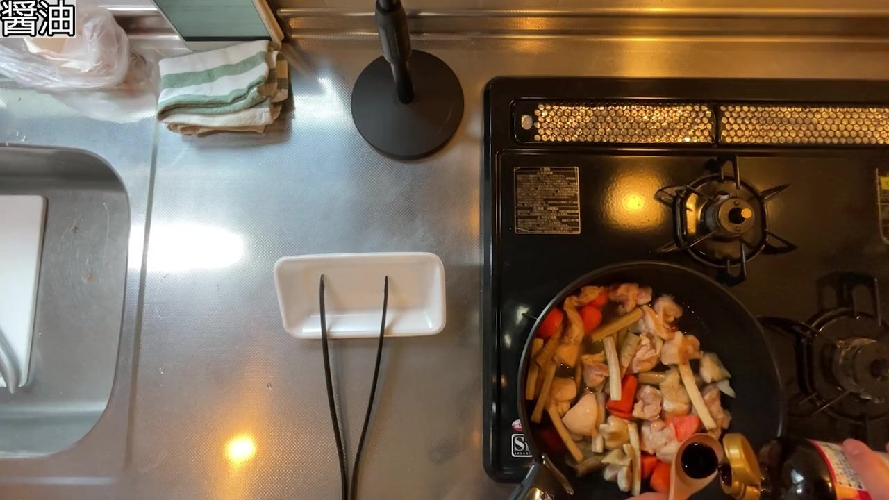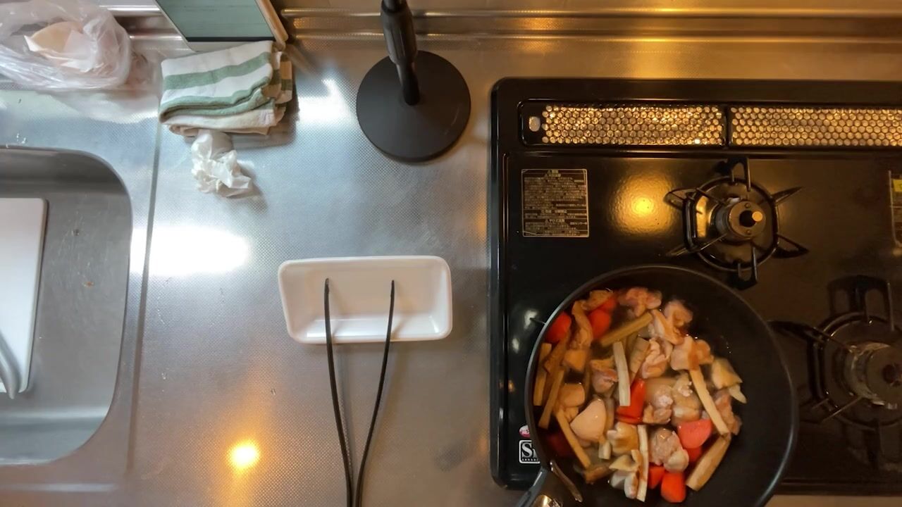A man wearing pants makes sweet and spicy stew of chicken and burdock.