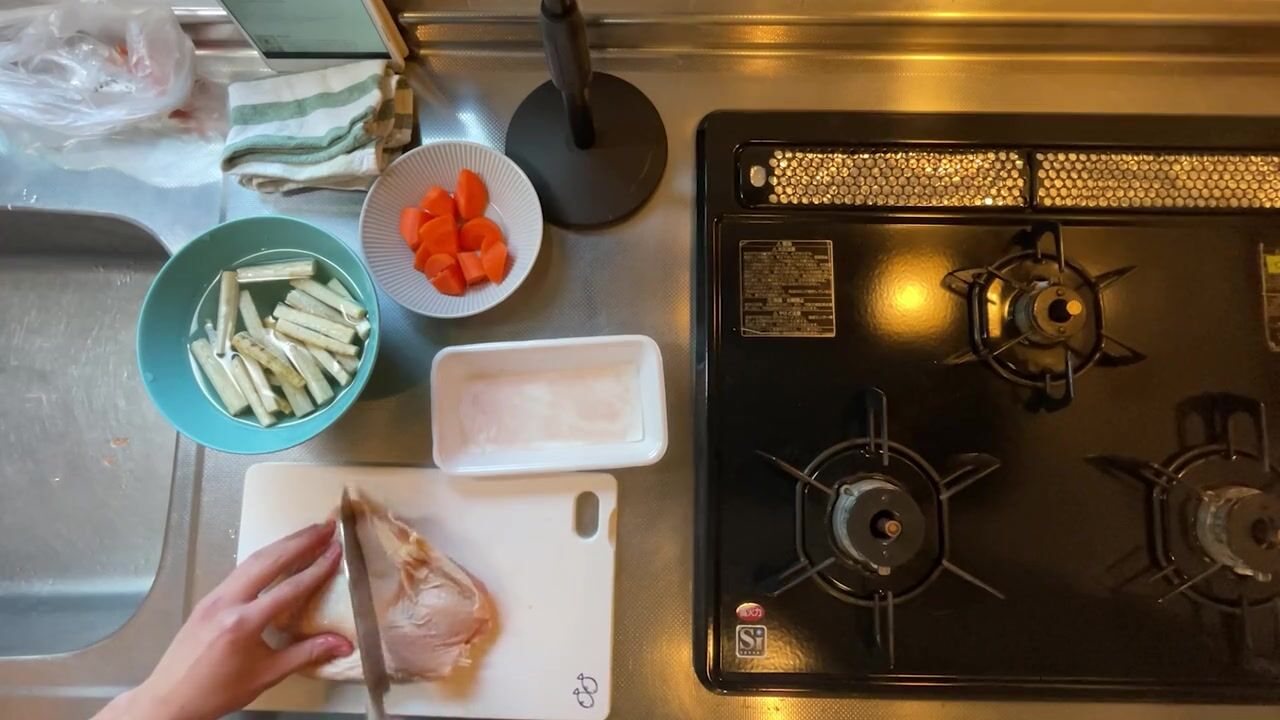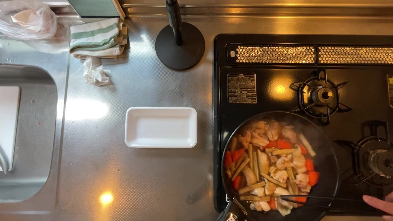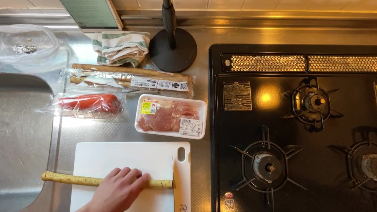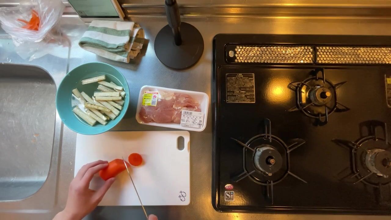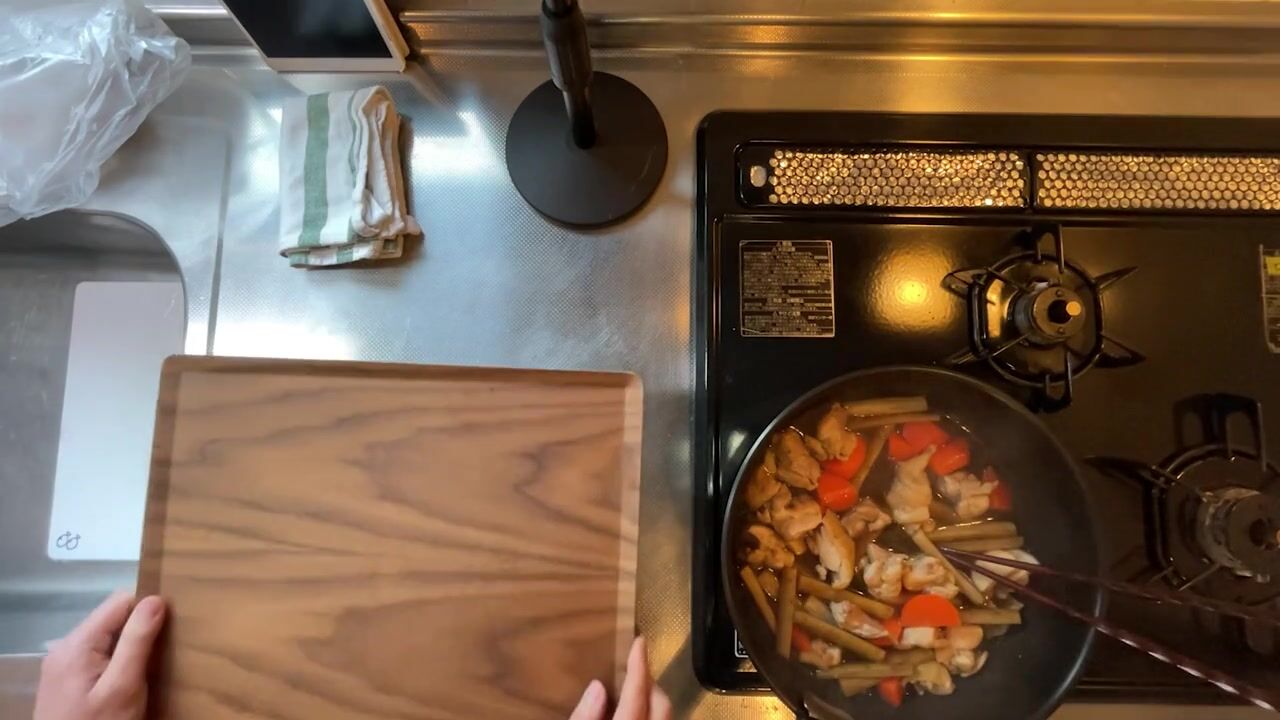 A man wearing pants makes sweet and spicy stew of chicken and burdock.