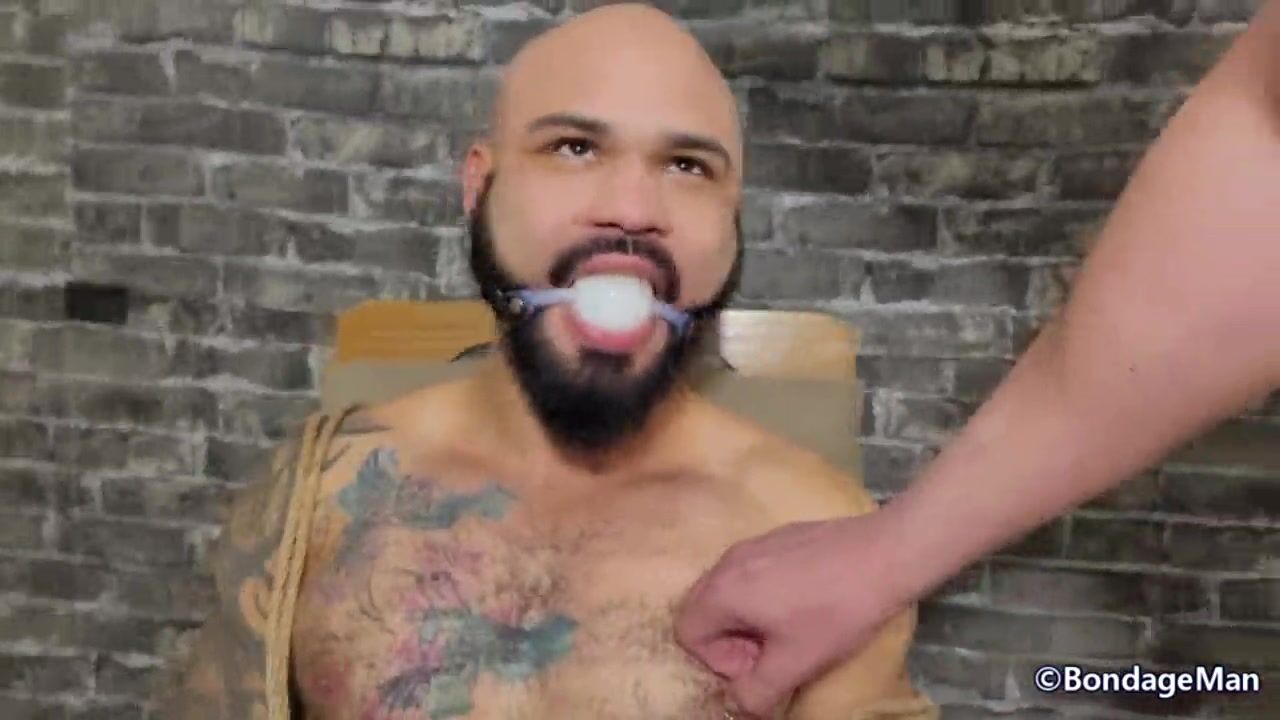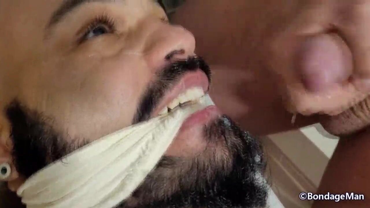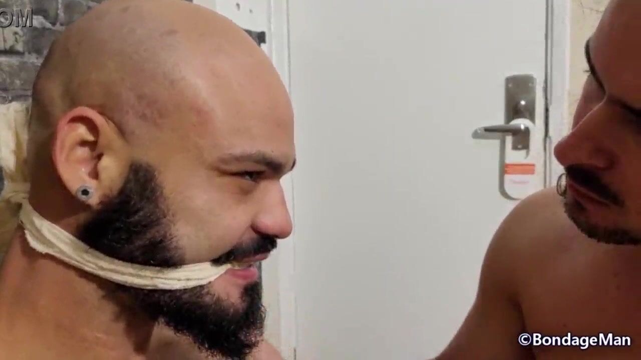 Jeff Carvalho and Leo Ceoli playing with bondage ropes, gags and fucking Jeff tied up and gagged cum over the face | PREVIEW