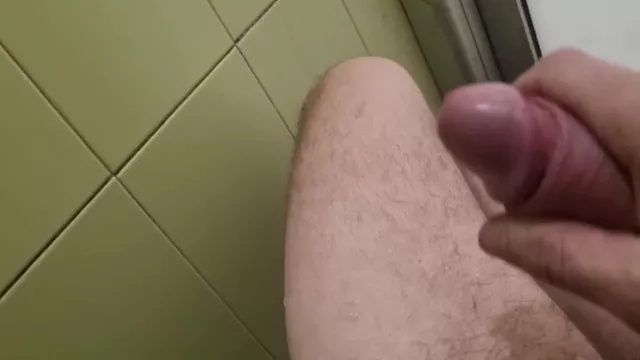 a guy with a big dick jerks off in a public toilet and cums on the wall