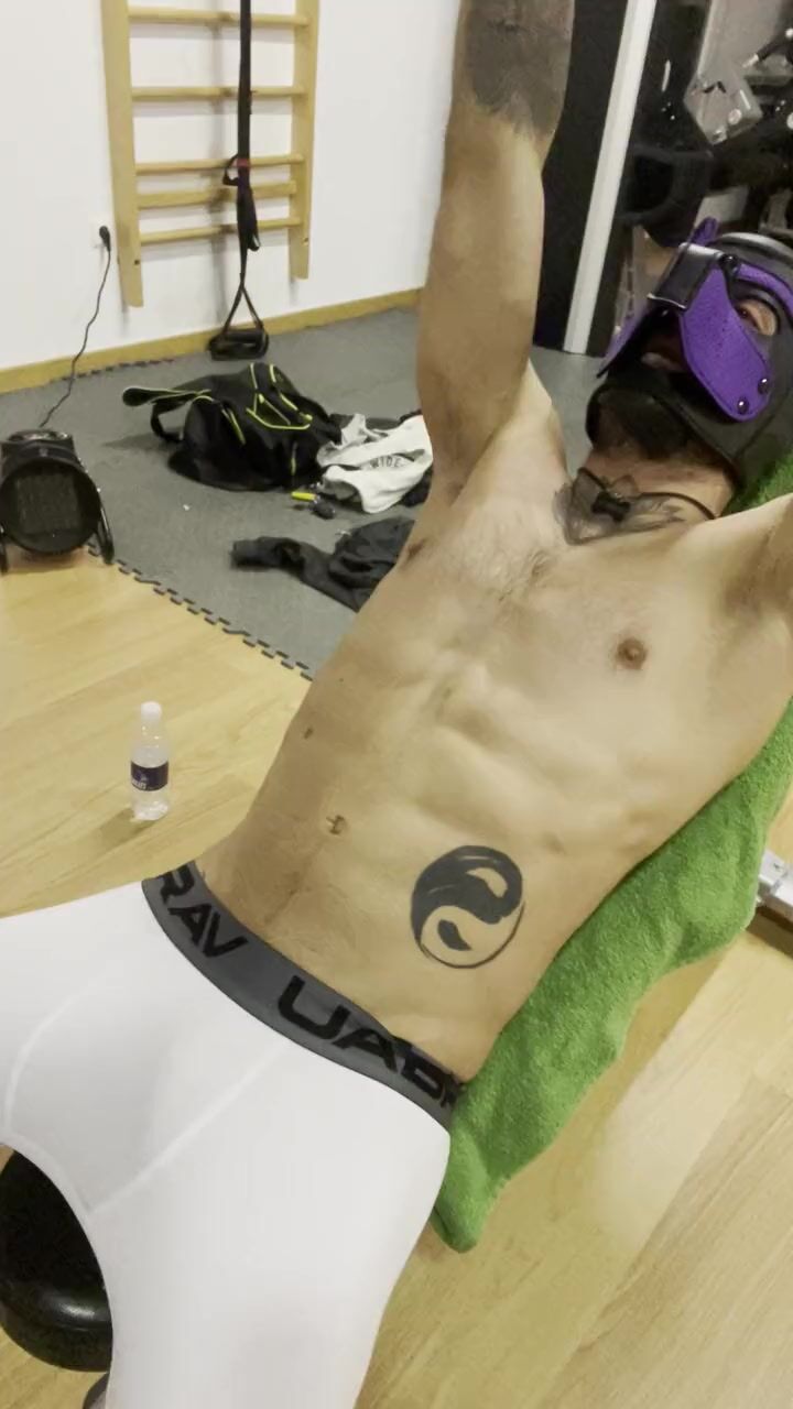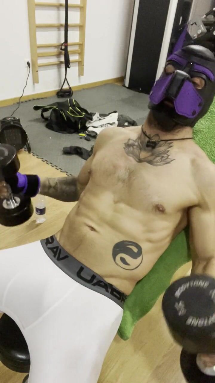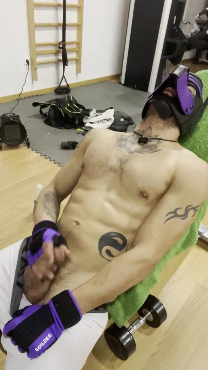 Puppy jerk off on the gym. Masive cum