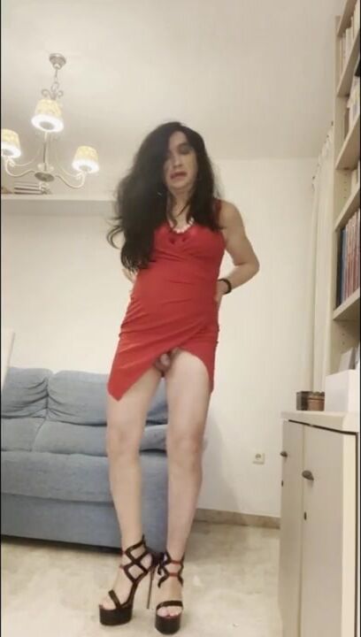 Daniela Monroe TV Spanish shemale, posing, beautiful legs, red dress, colorful platform high heels