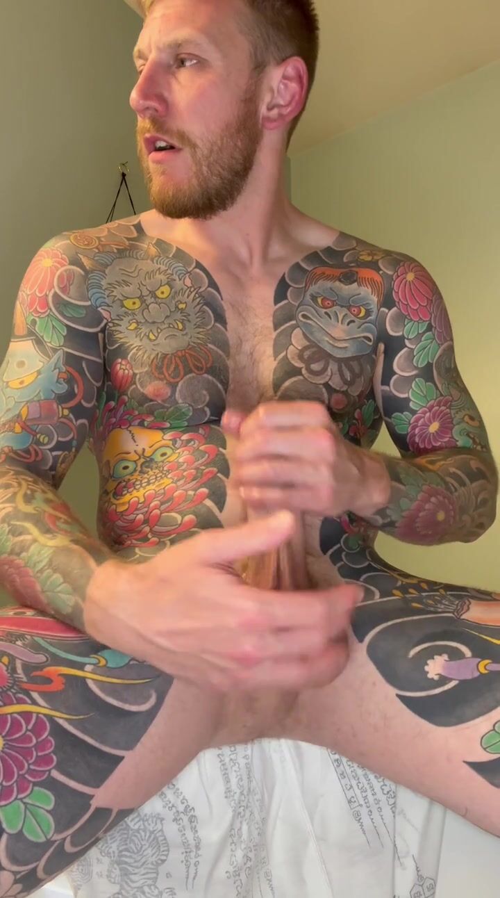 Tattooed stud jerks and blows huge load