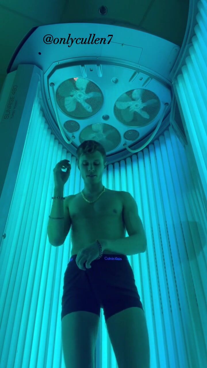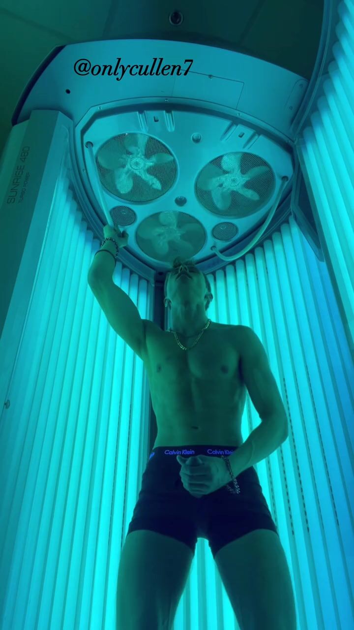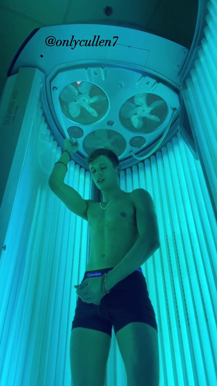 Fit guy enjoys a tense tanning session working out his ???? at the gym