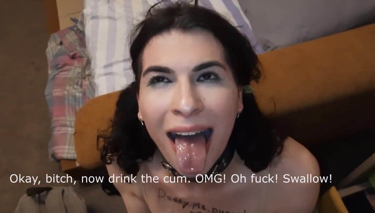 Stupid sissy girl Alina suck dick, take dick in ass, and swallow cum from condom like a whore