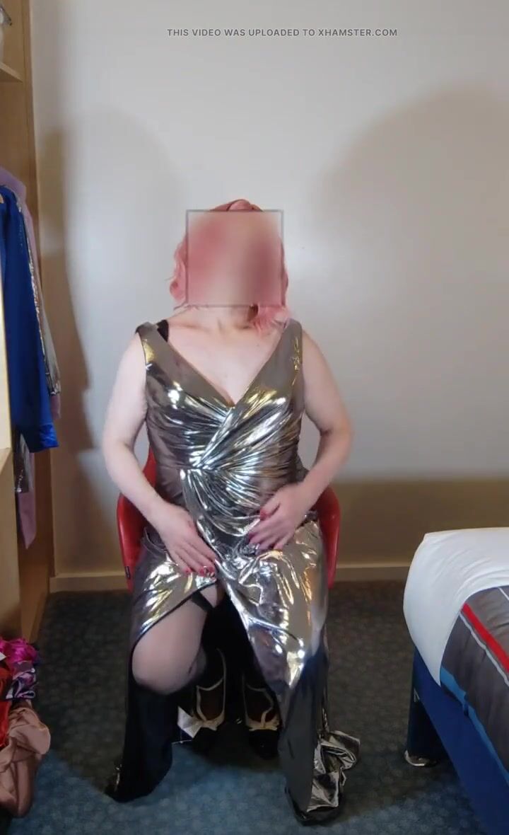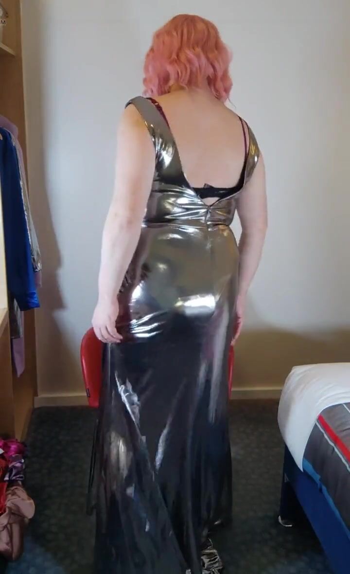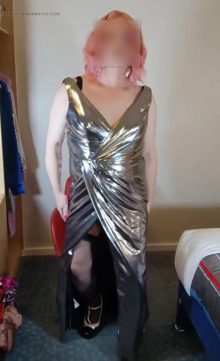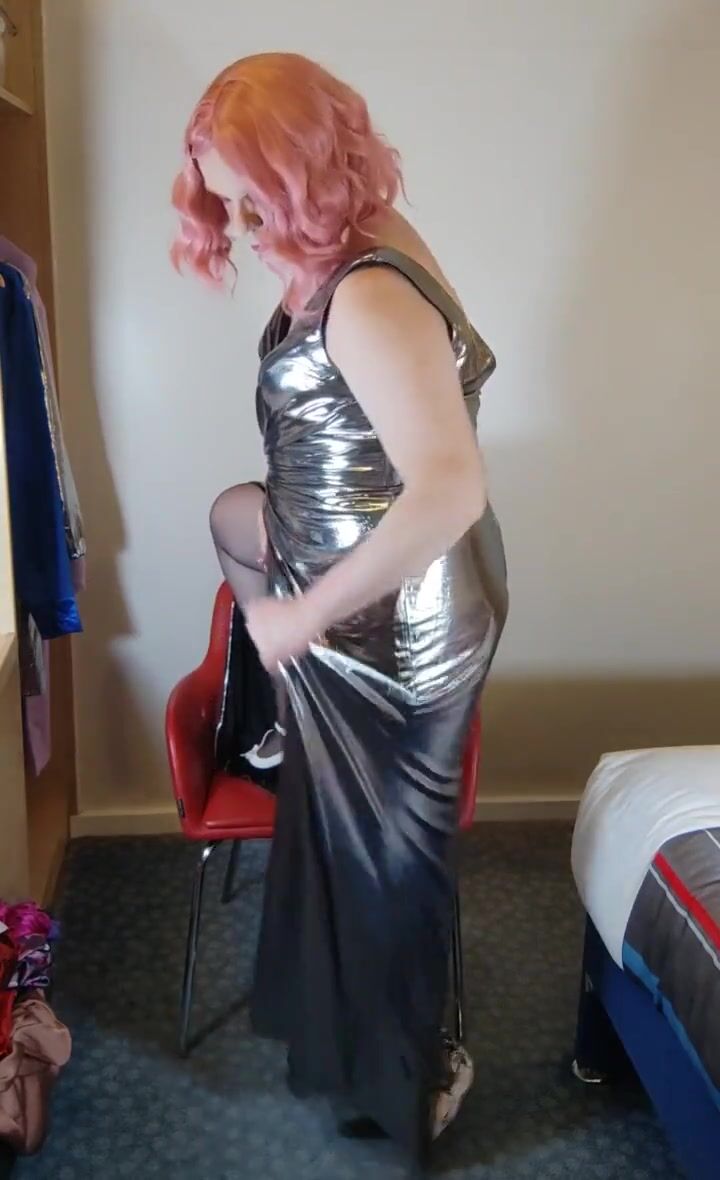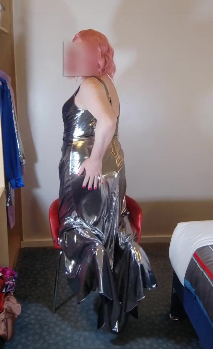 Sexy crossdresser in hot super shiny metallic evening dress