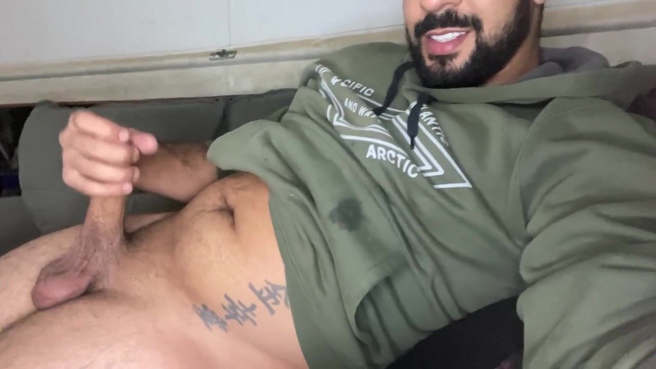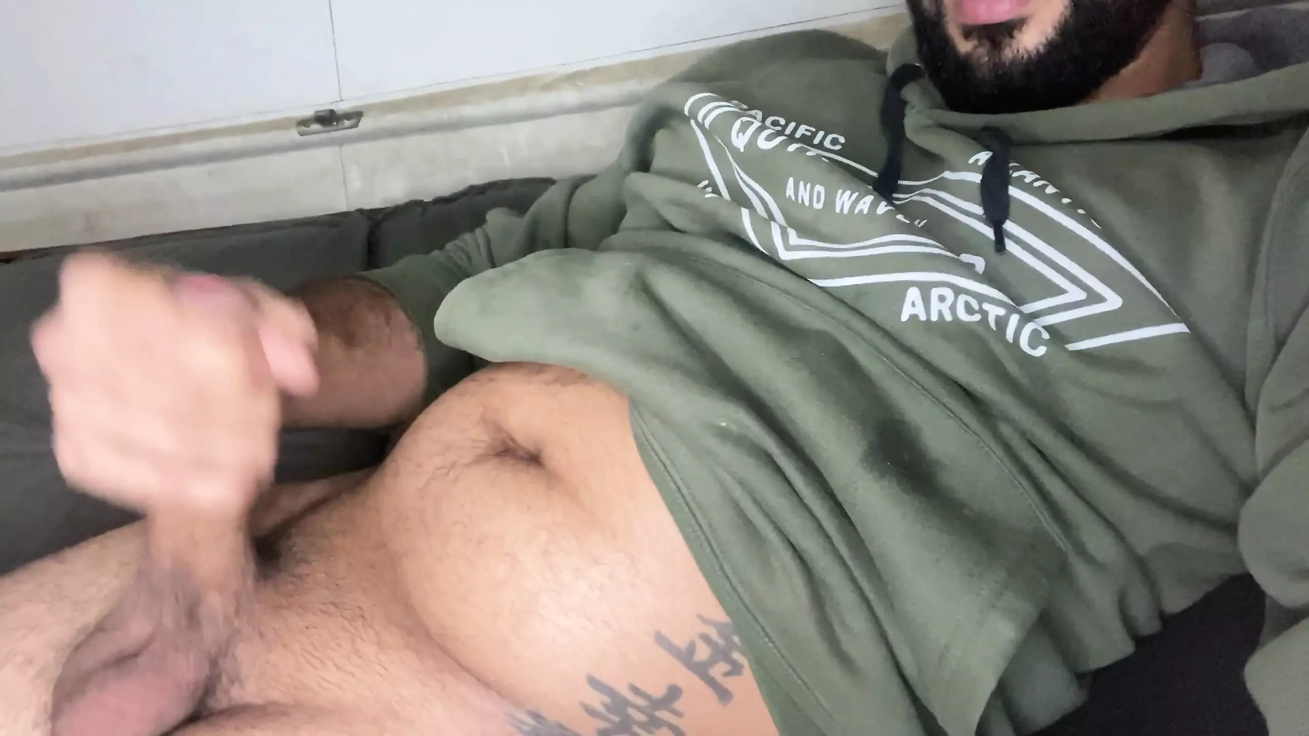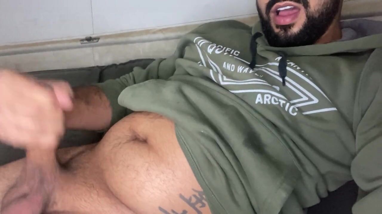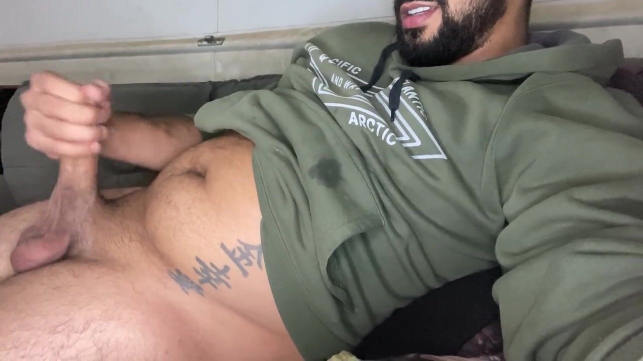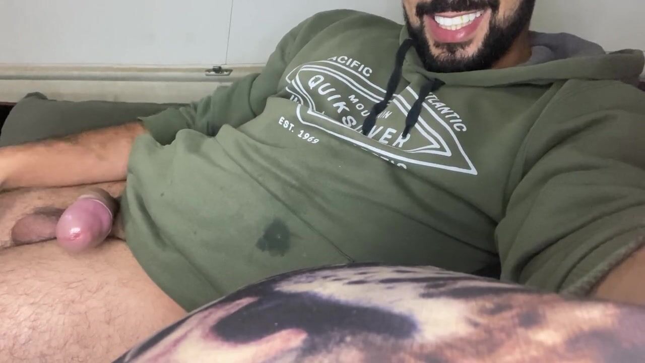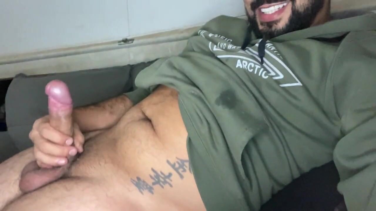 Bearded big cock jerking off and smearing himself with cum