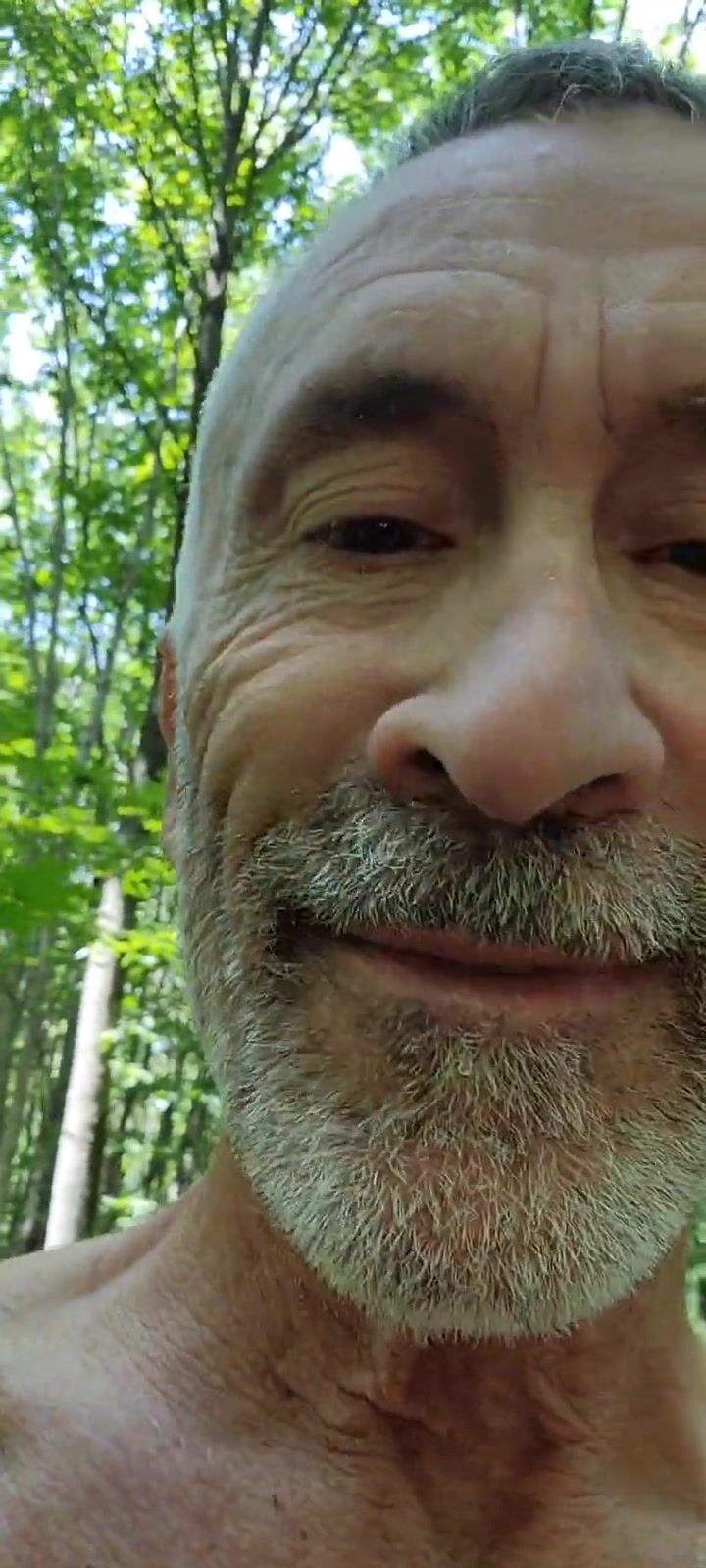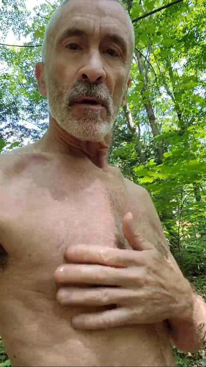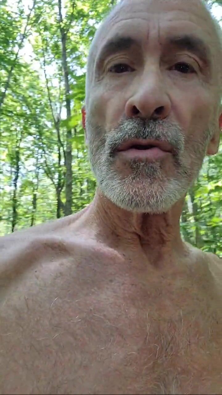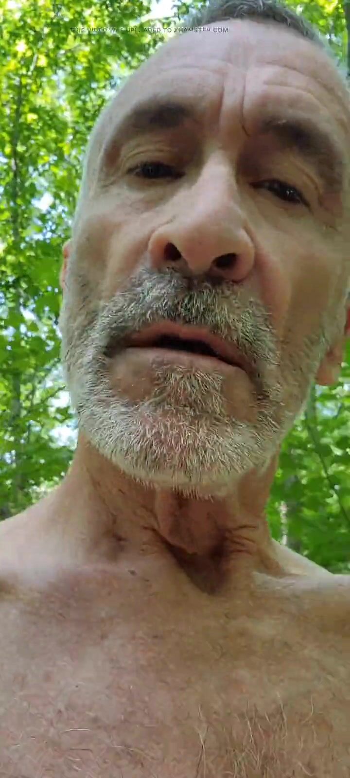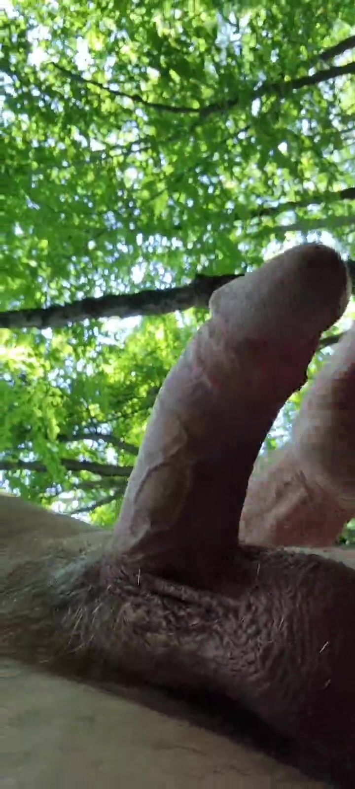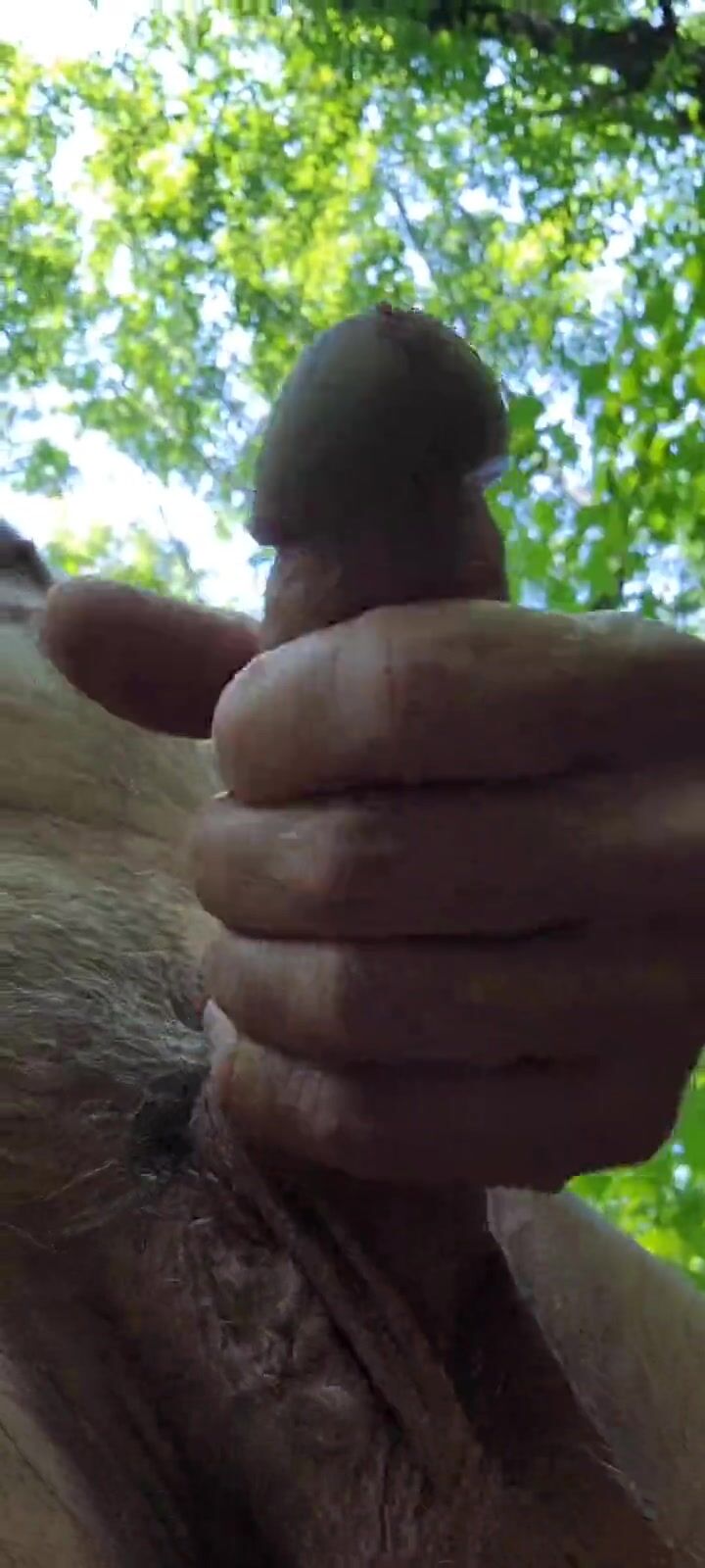 Daddy take a walk in the Wood, stroking his dick, and have his balls bouncing in the outdoors
