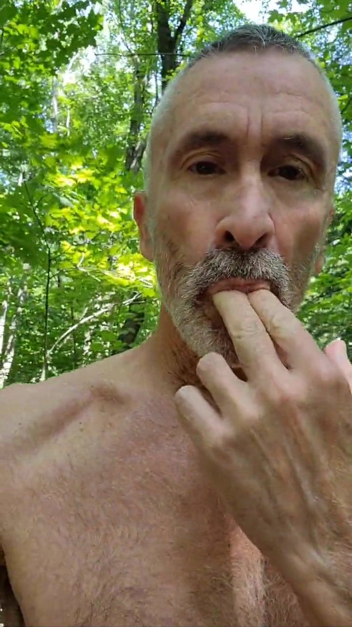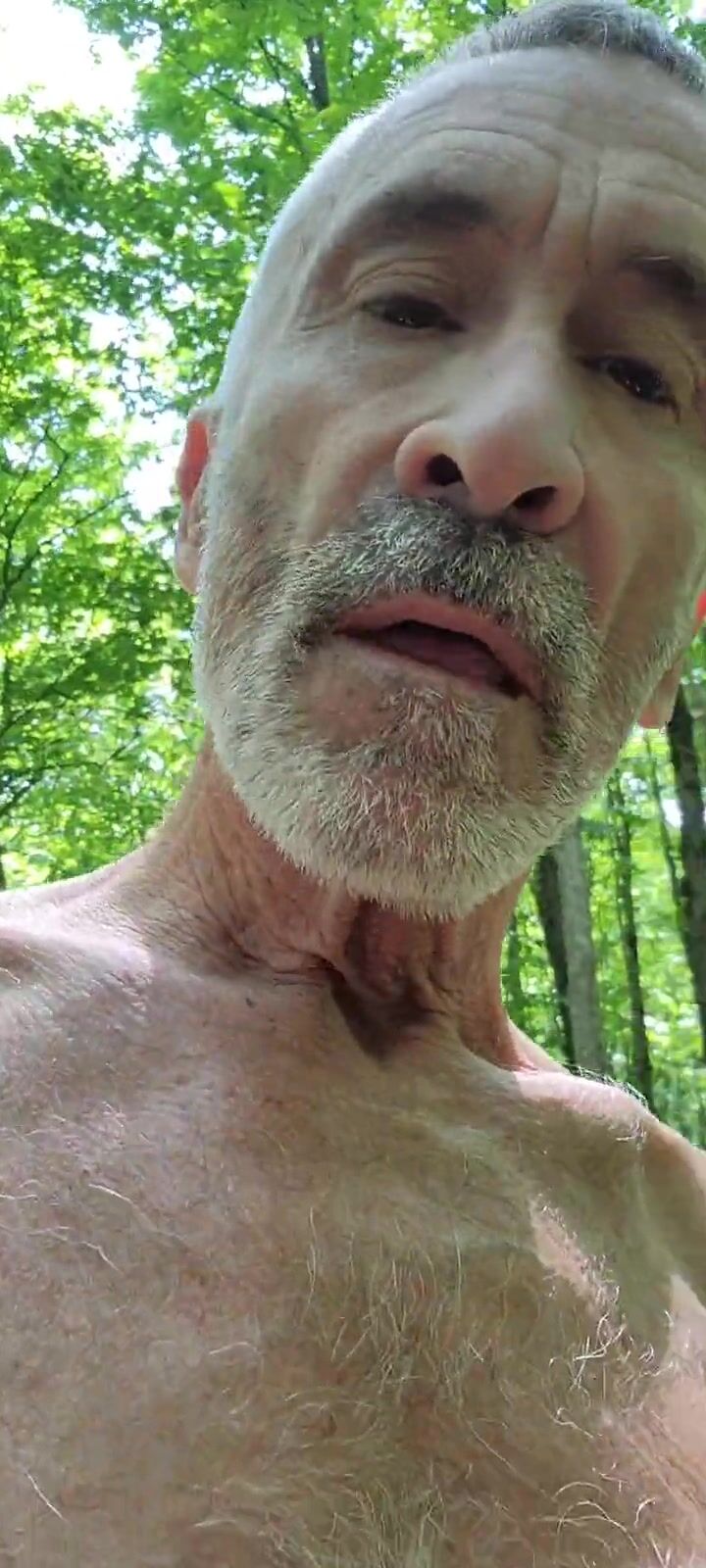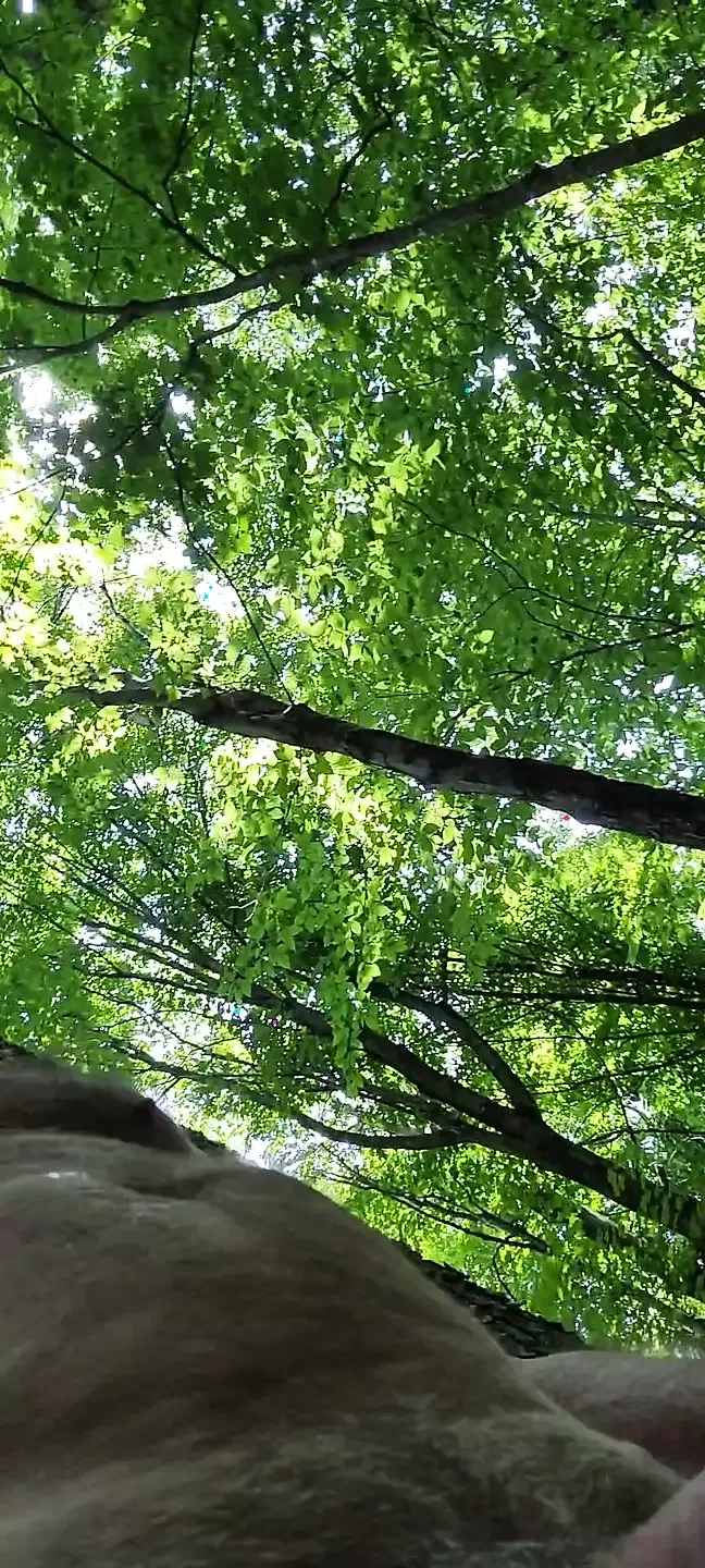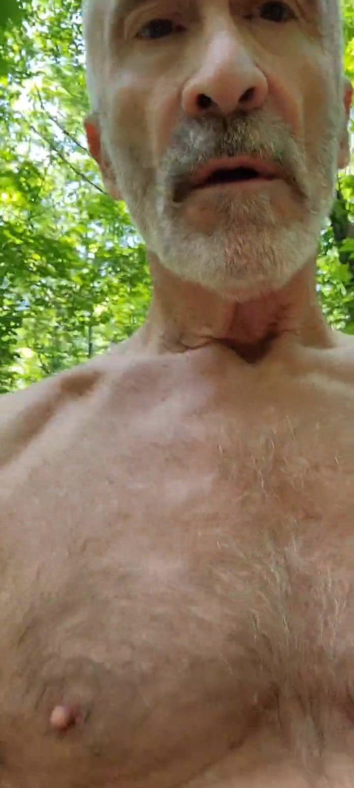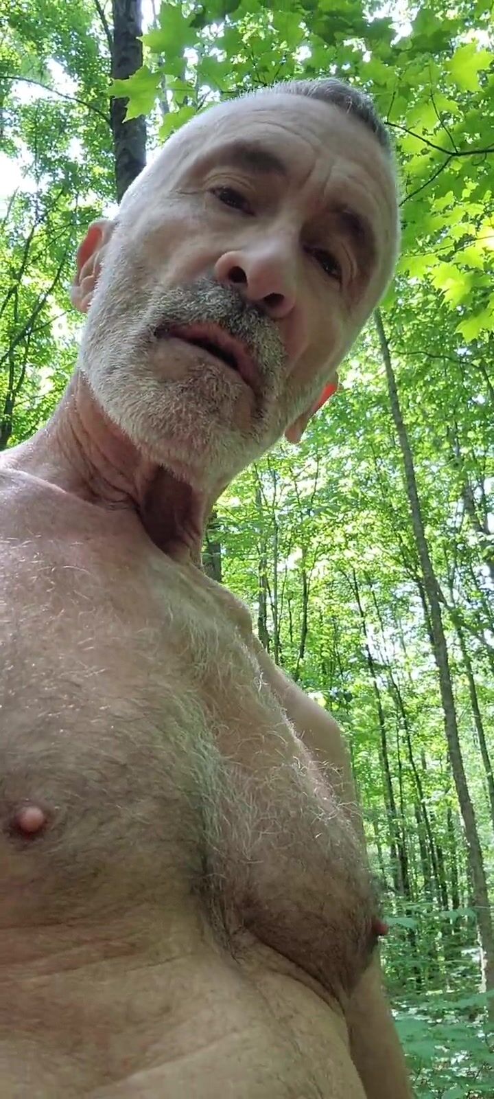 Daddy take a walk in the Wood, stroking his dick, and have his balls bouncing in the outdoors