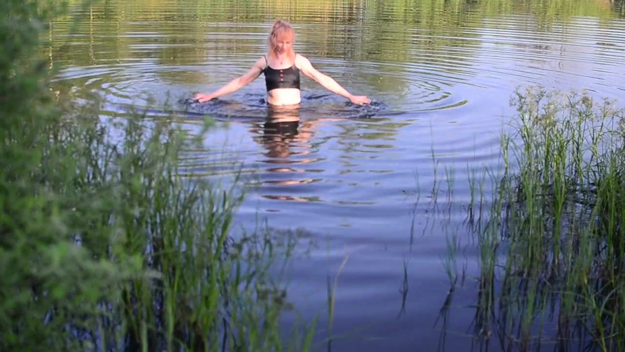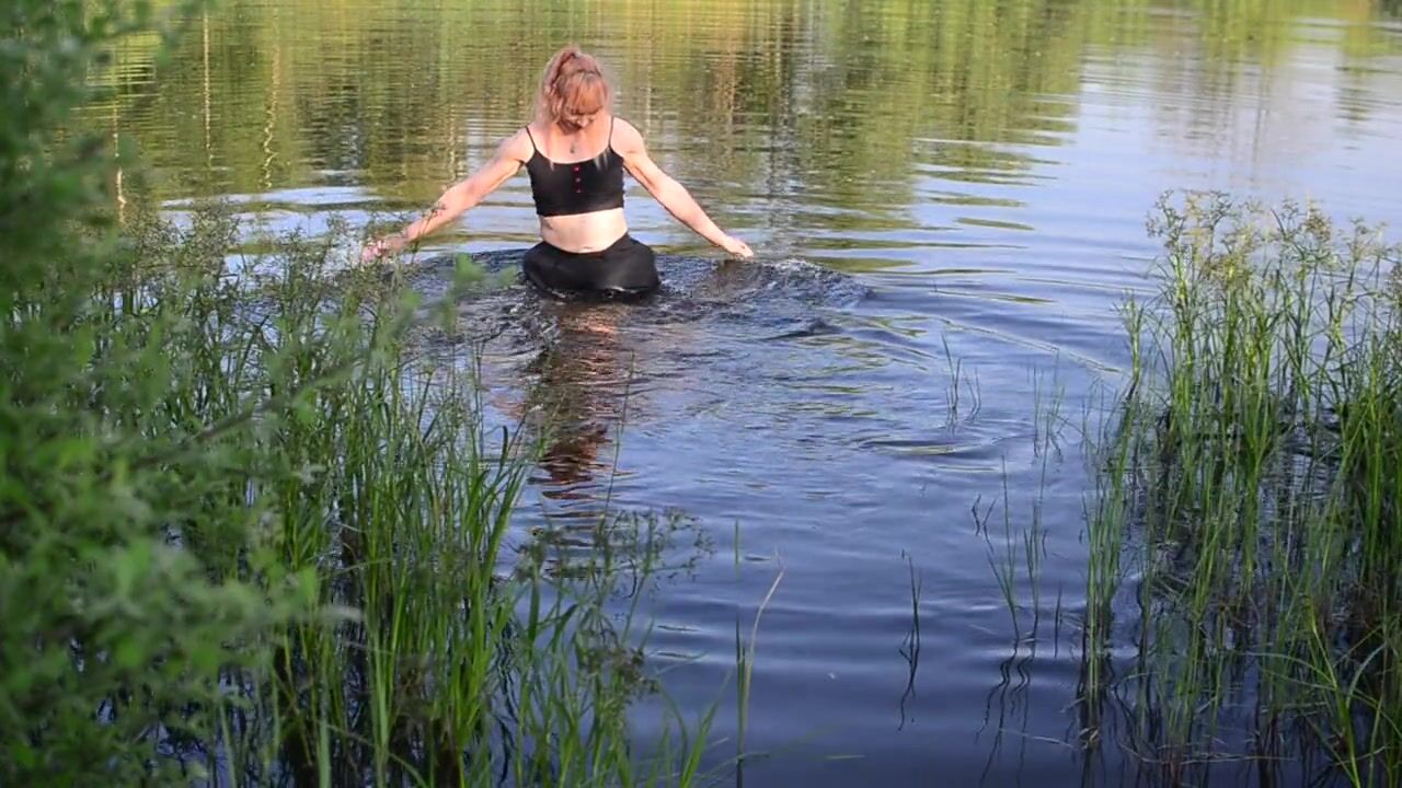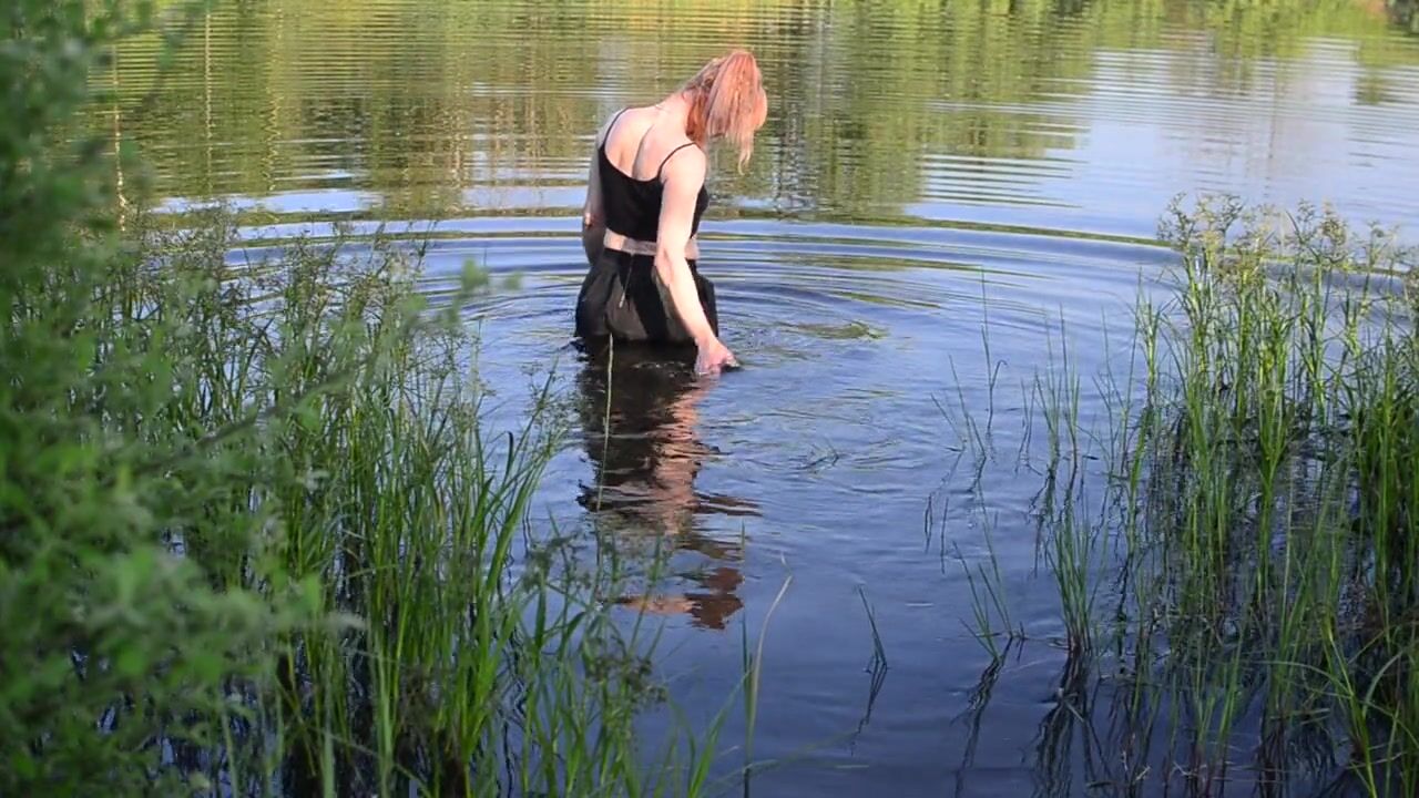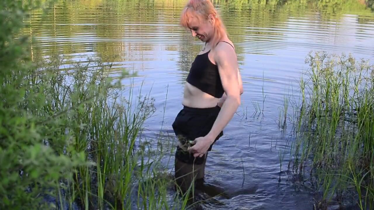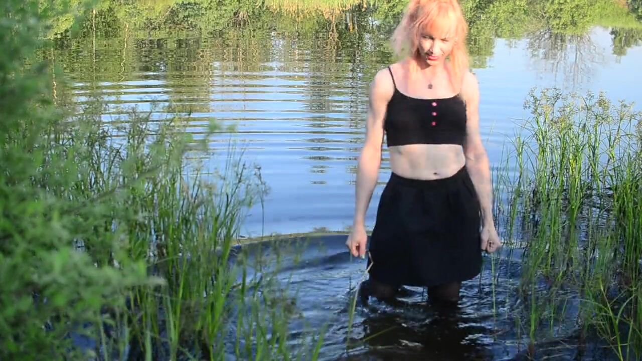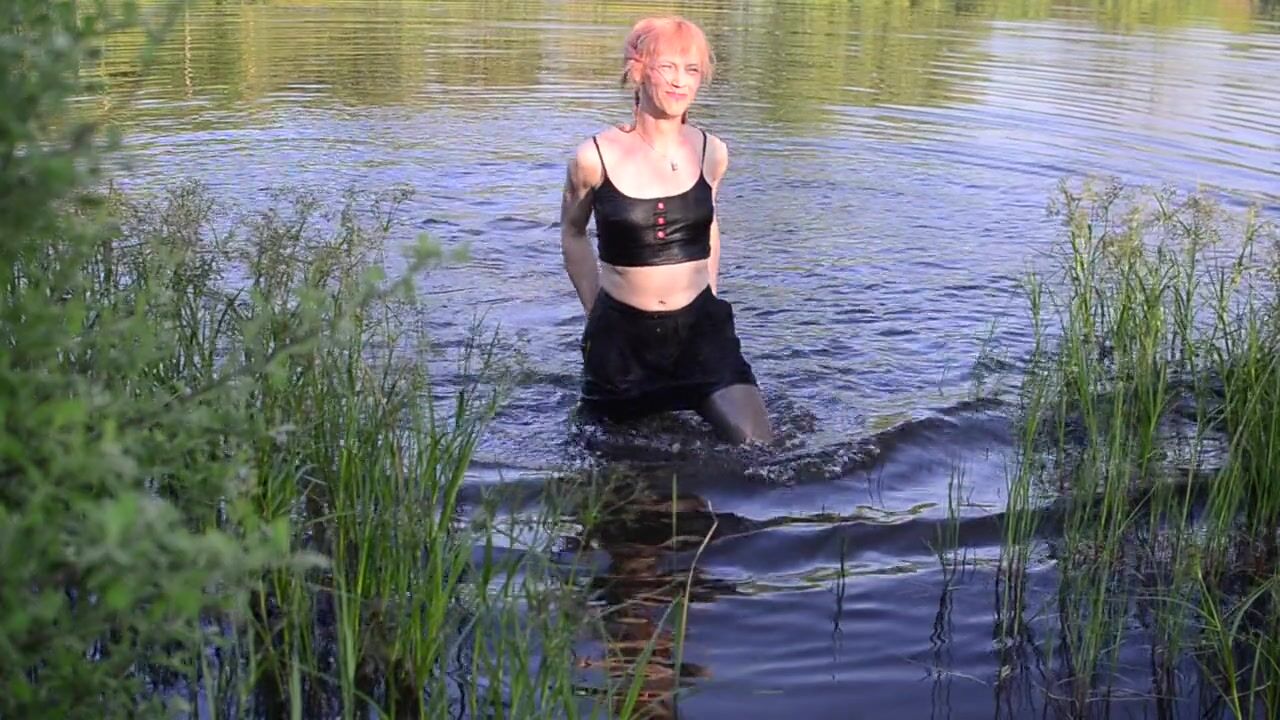 Swimming in lake in clothes. Black Wet skirt, wet stockings and tank top. Wetlook transgirl in lake.