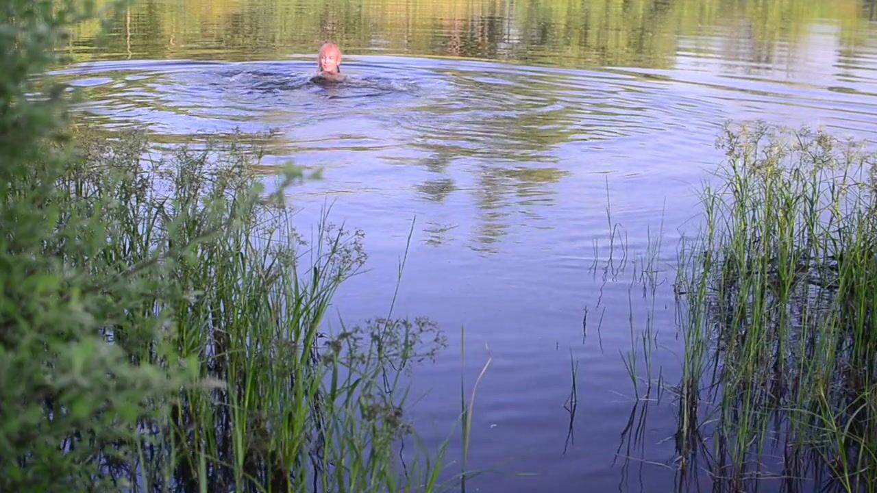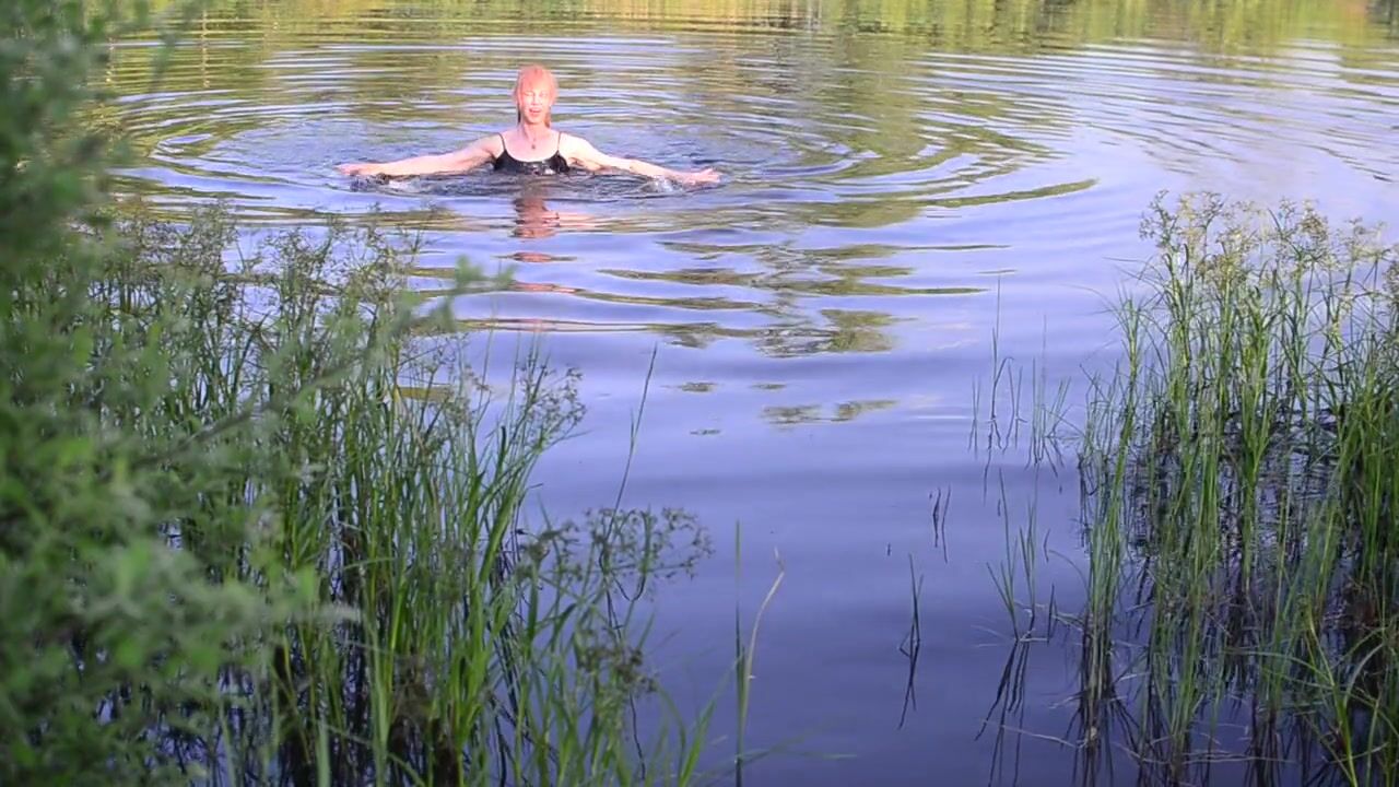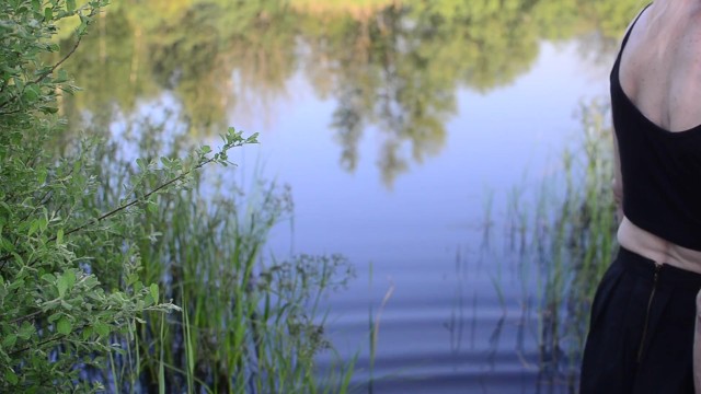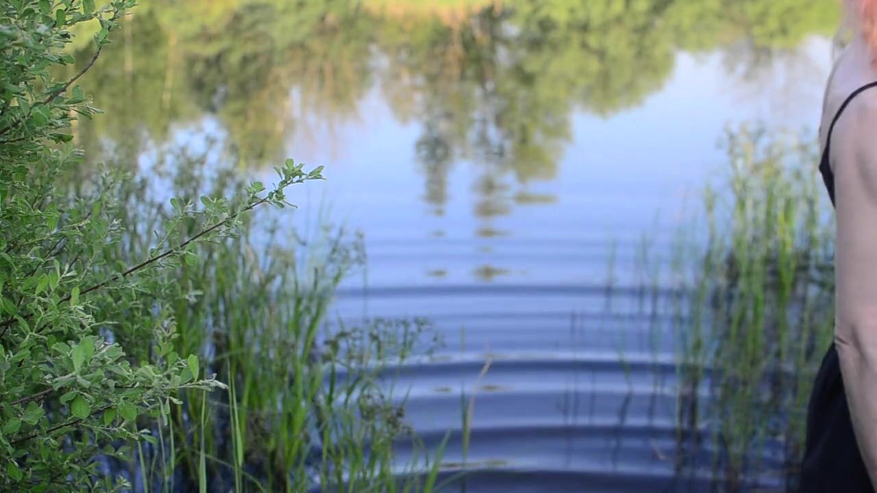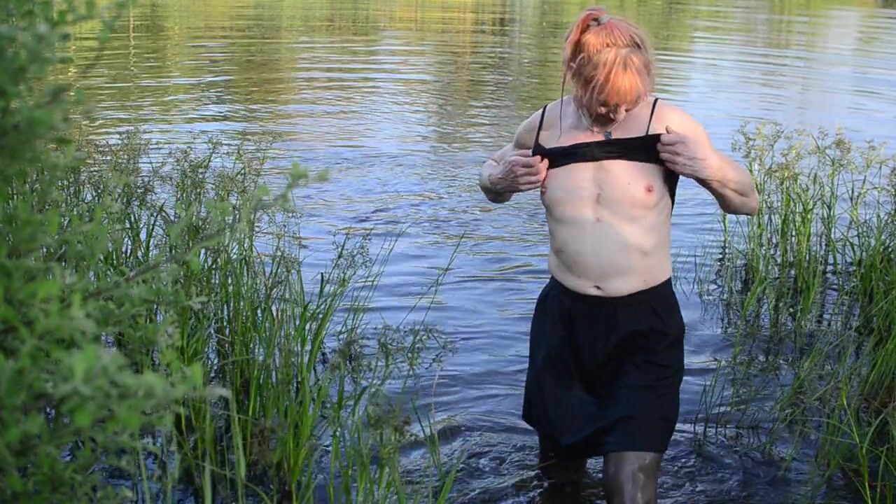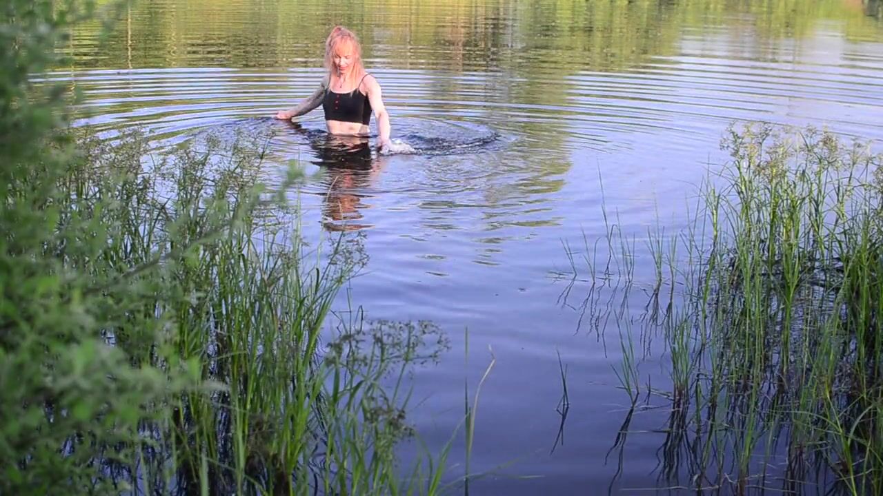 Swimming in lake in clothes. Black Wet skirt, wet stockings and tank top. Wetlook transgirl in lake.