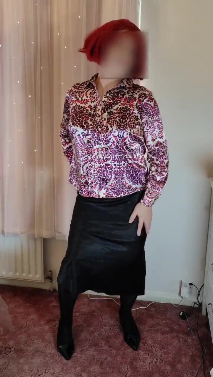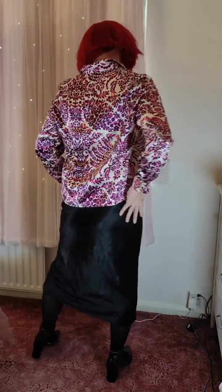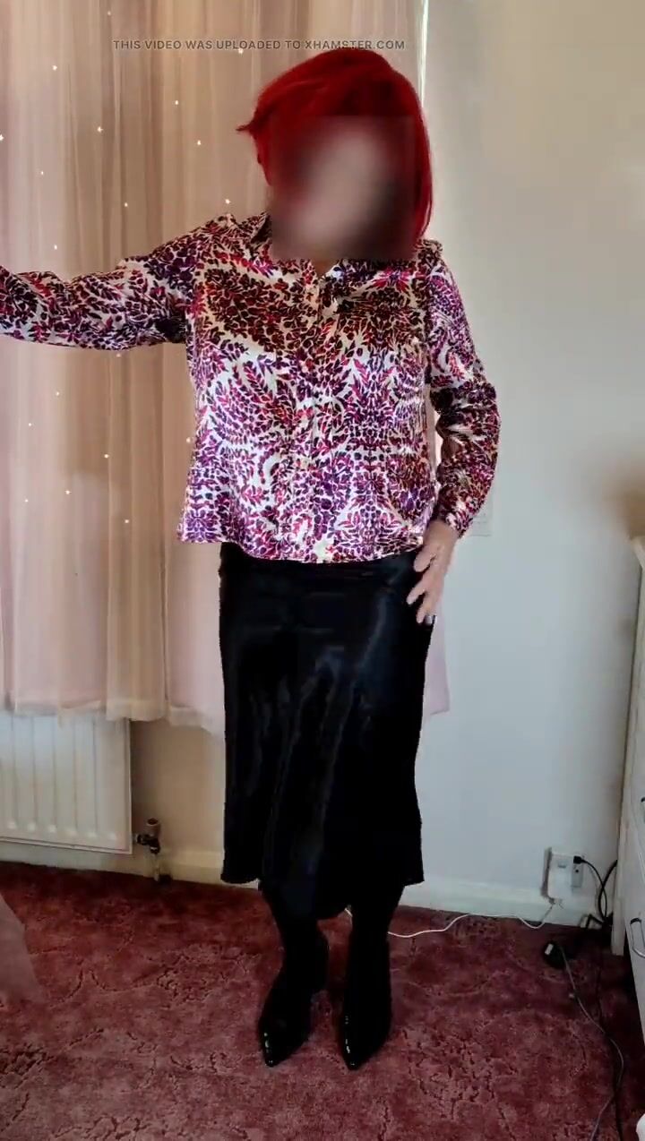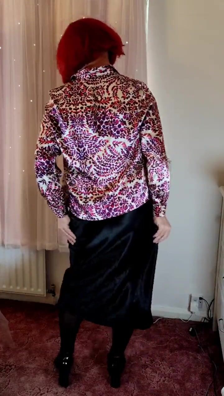 Crossdresser in satin blouse and skirt