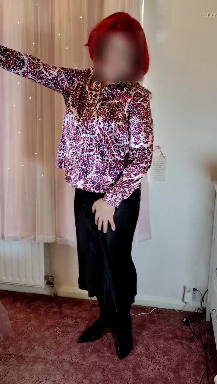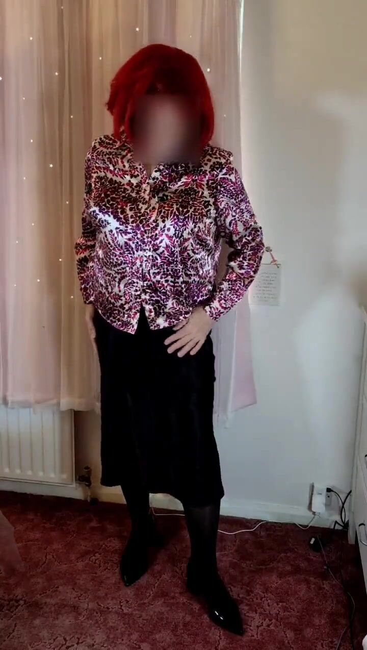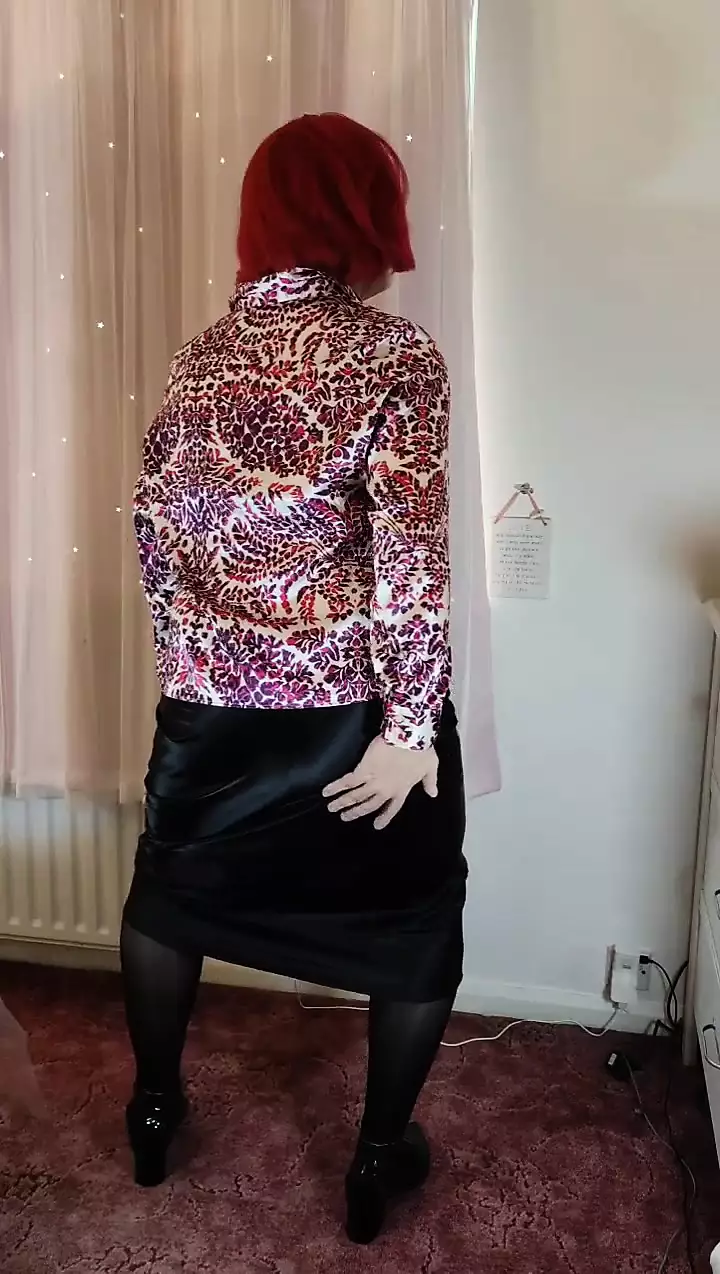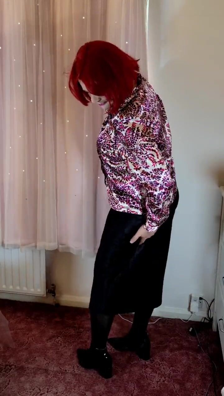 Crossdresser in satin blouse and skirt