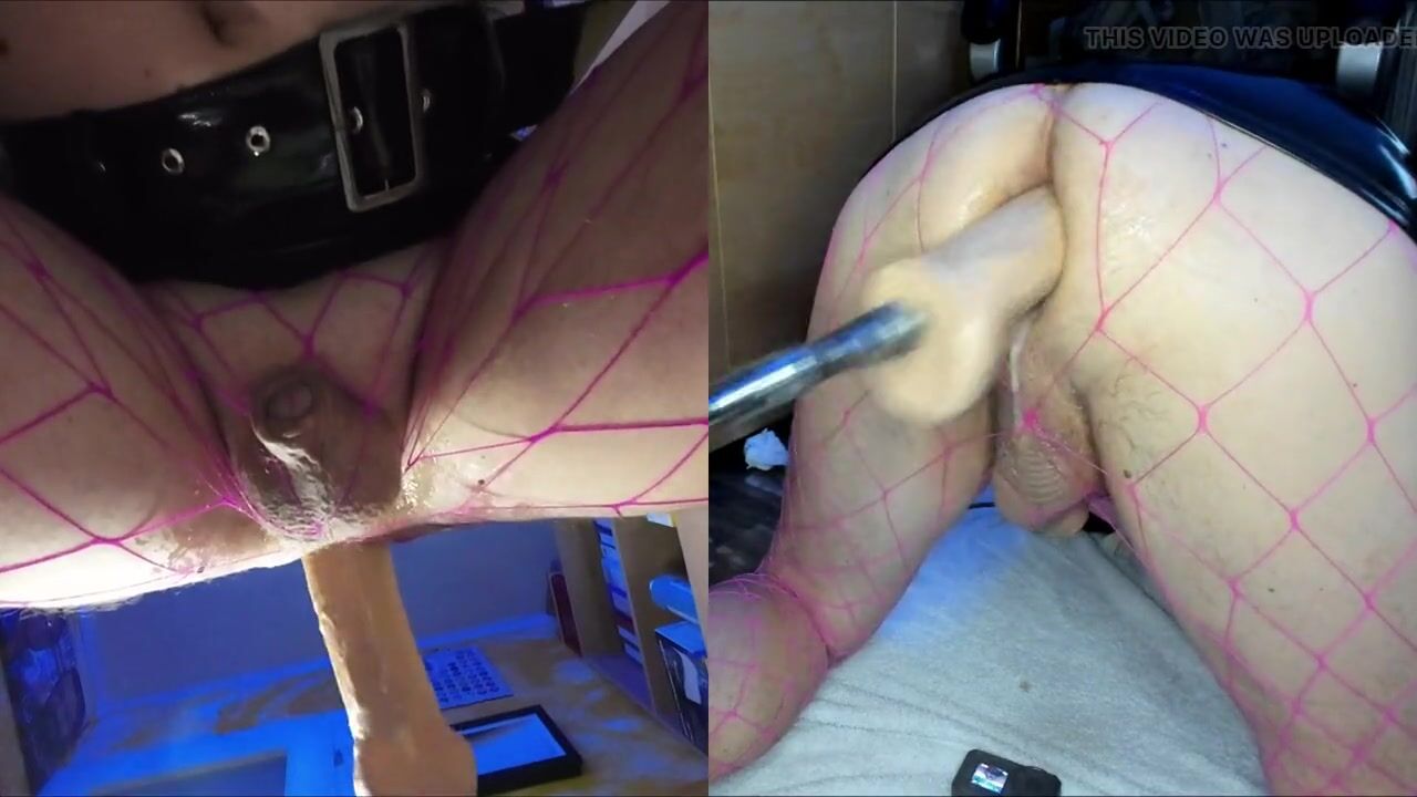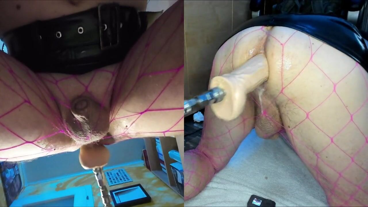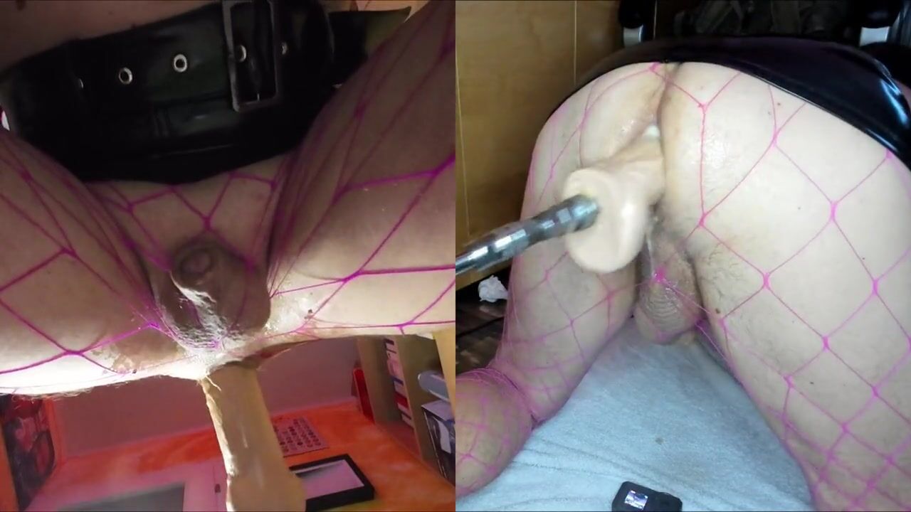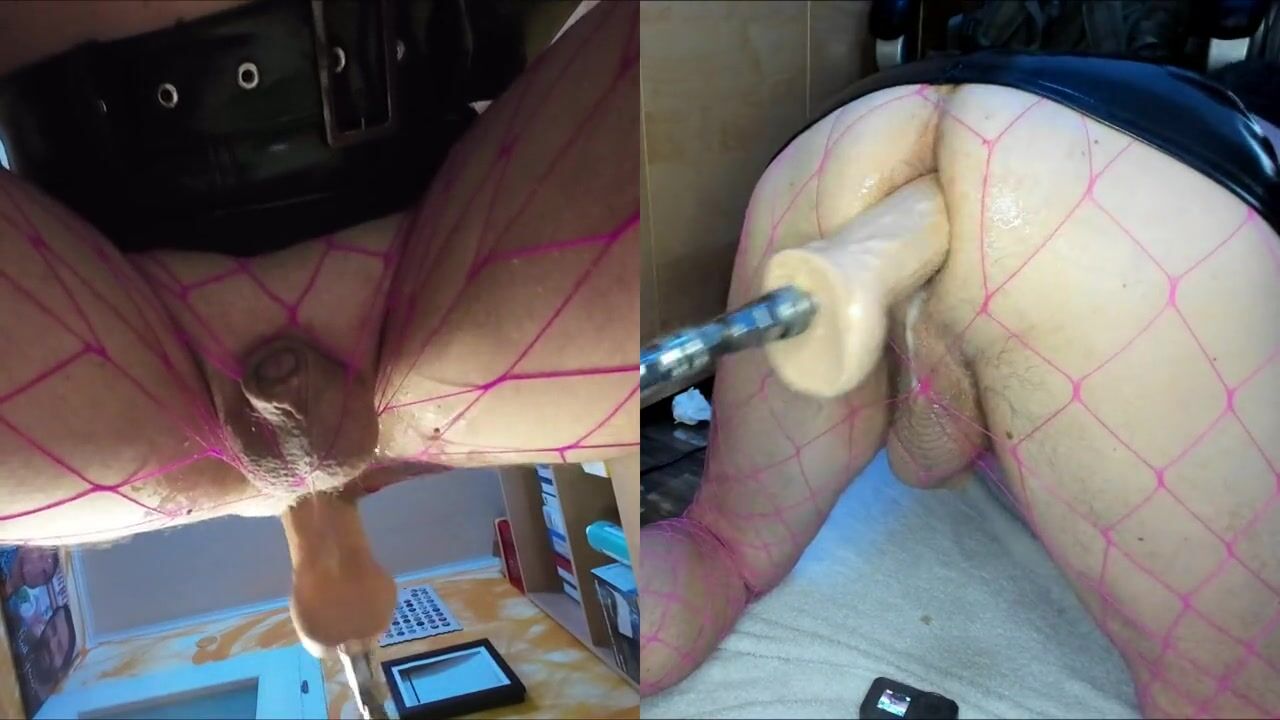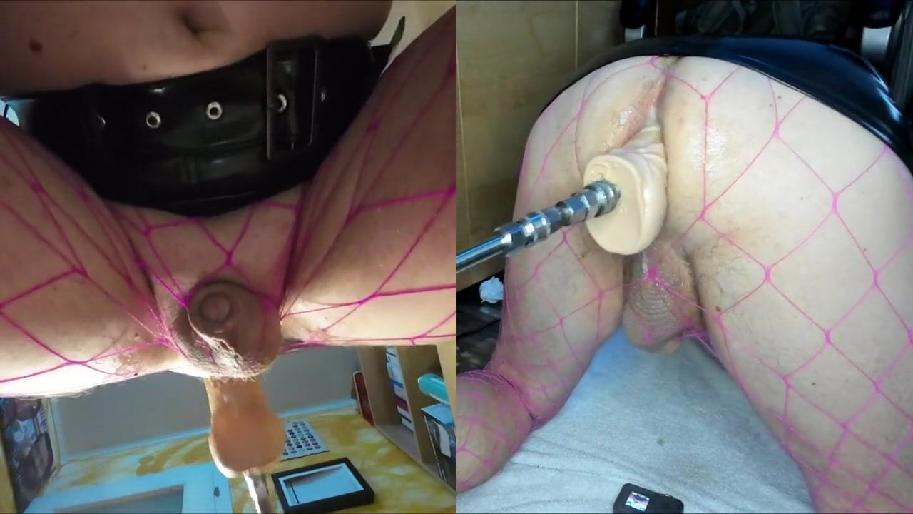 Dual View Crossdresser in shiny skirt and fishnet gets his anal pussy fucked by fucking machine, cock leaks