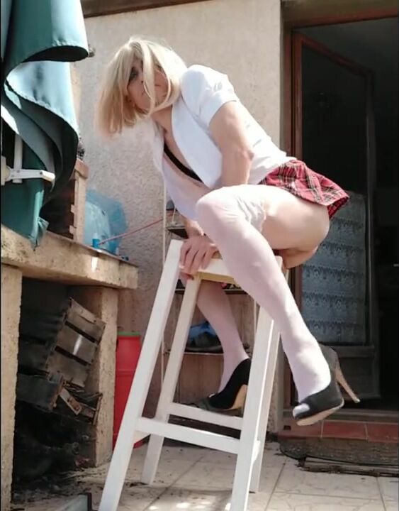 Sexy Blonde Crossdresser Shemale High Heels Stockings Mini Skirt show her ass and cock on high chair in the garden.
