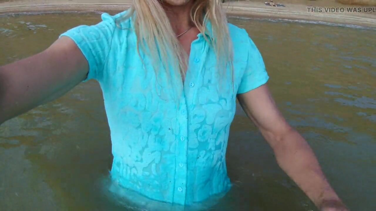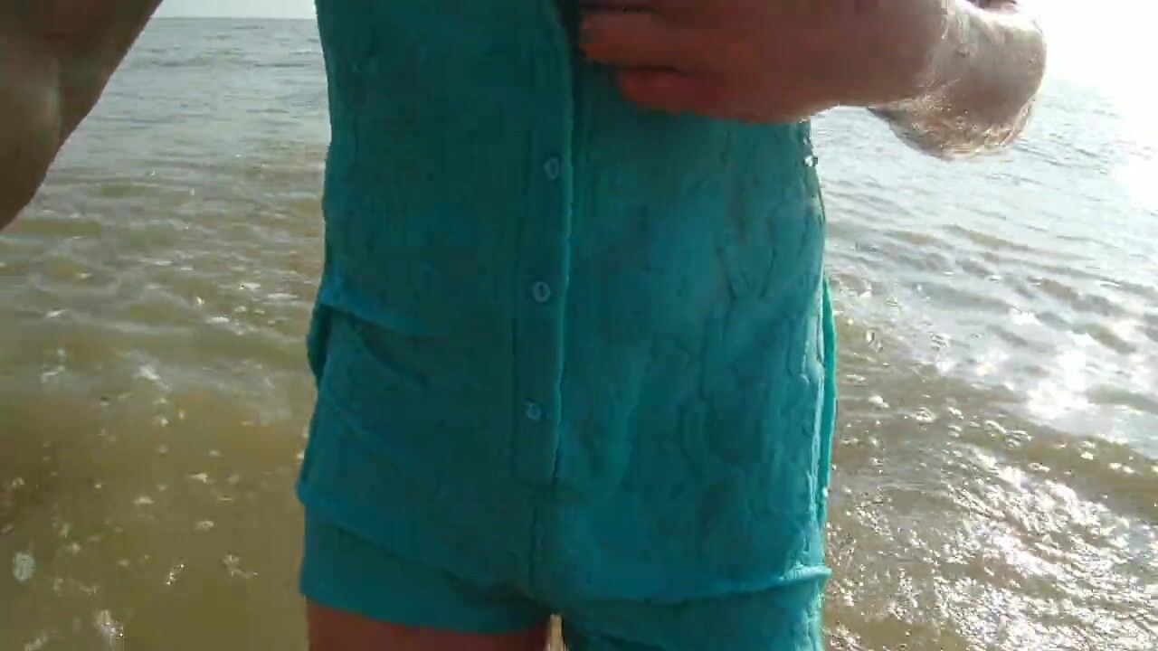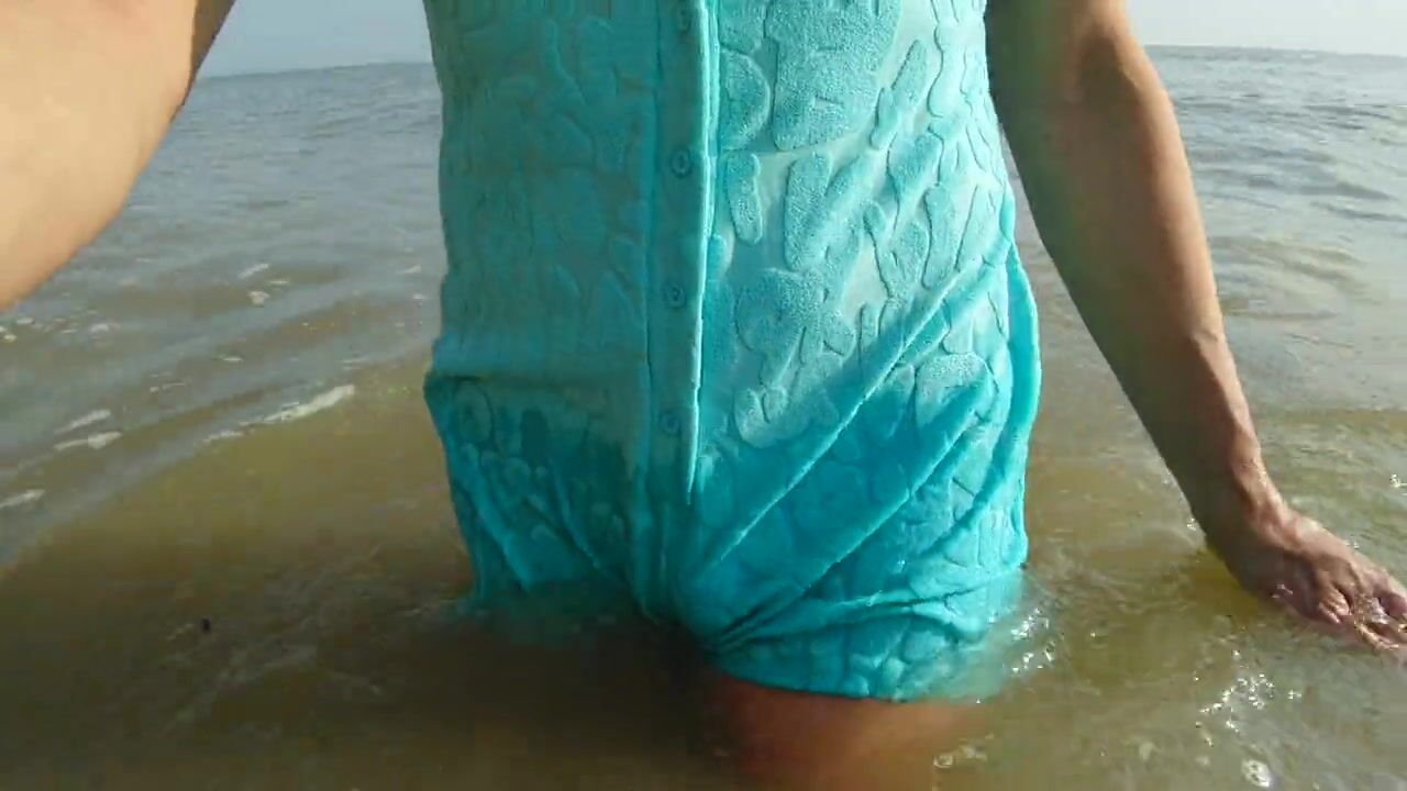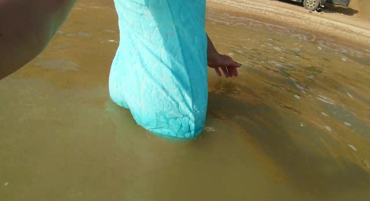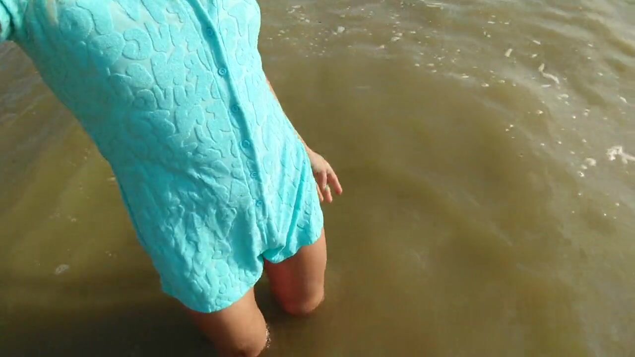 Alexa Cosmic transgirl swimming in the sea first time in teal combi dress