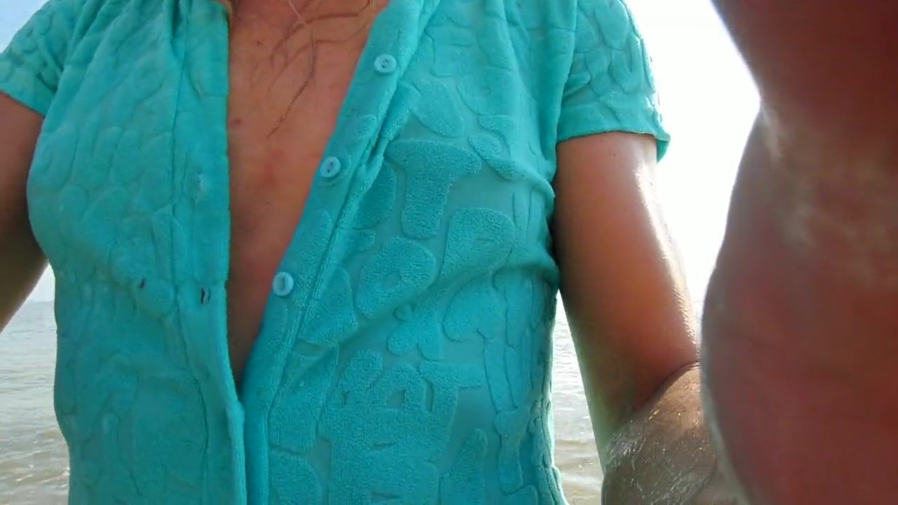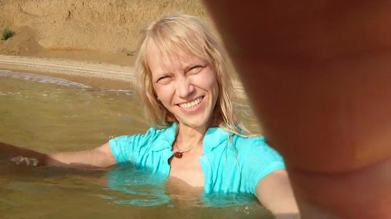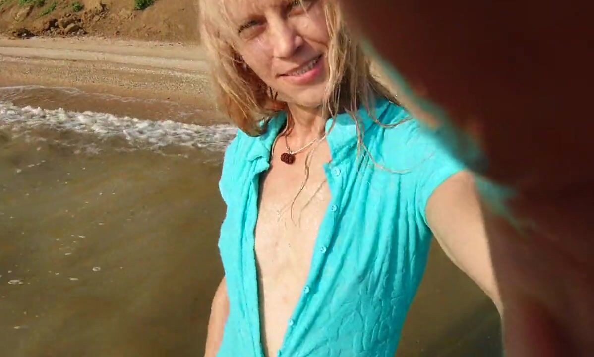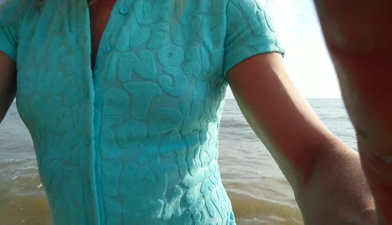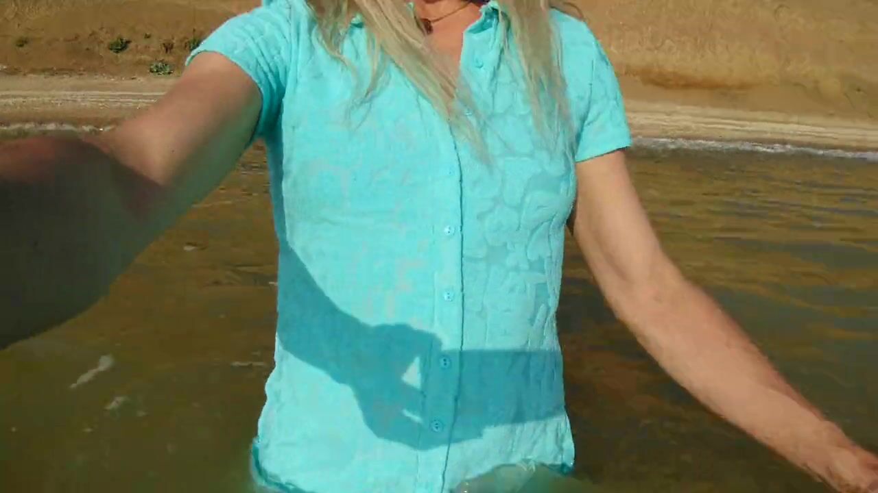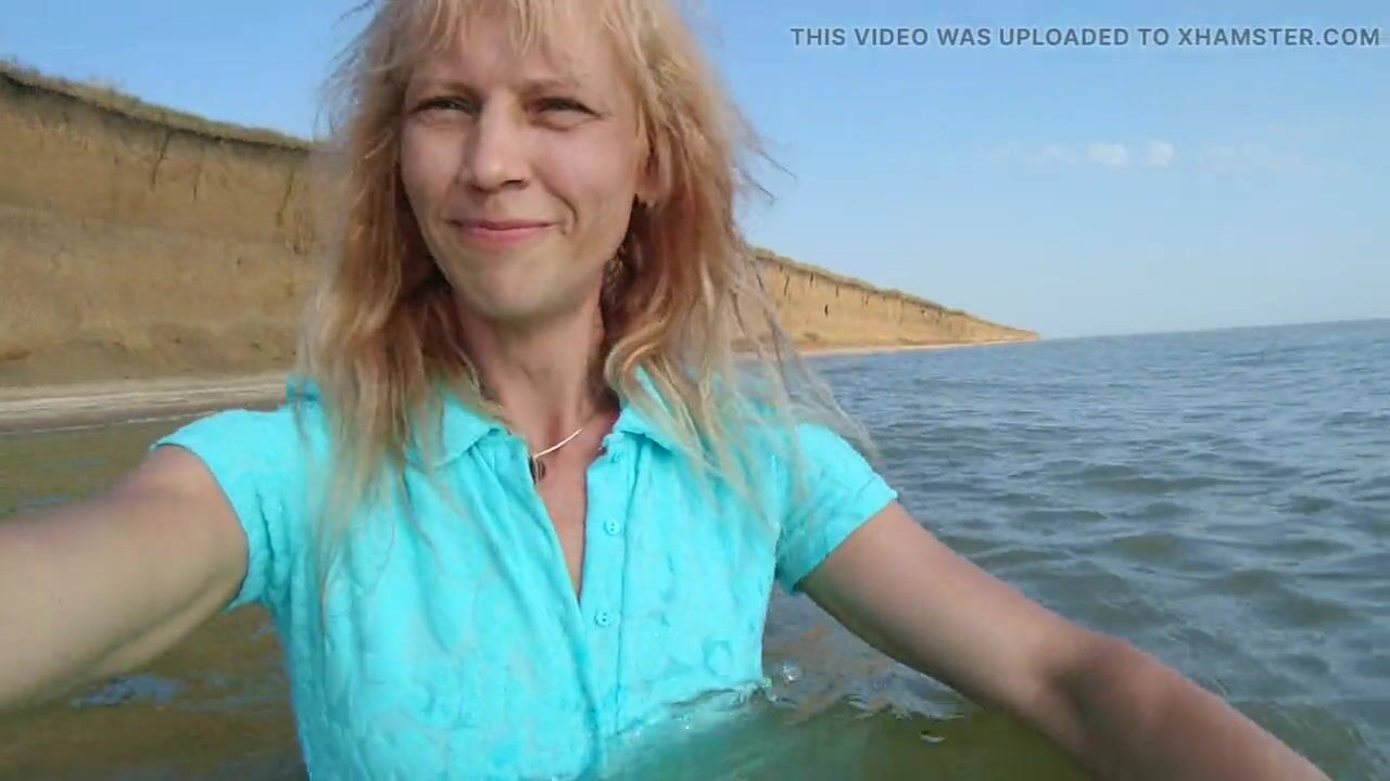 Alexa Cosmic transgirl swimming in the sea first time in teal combi dress