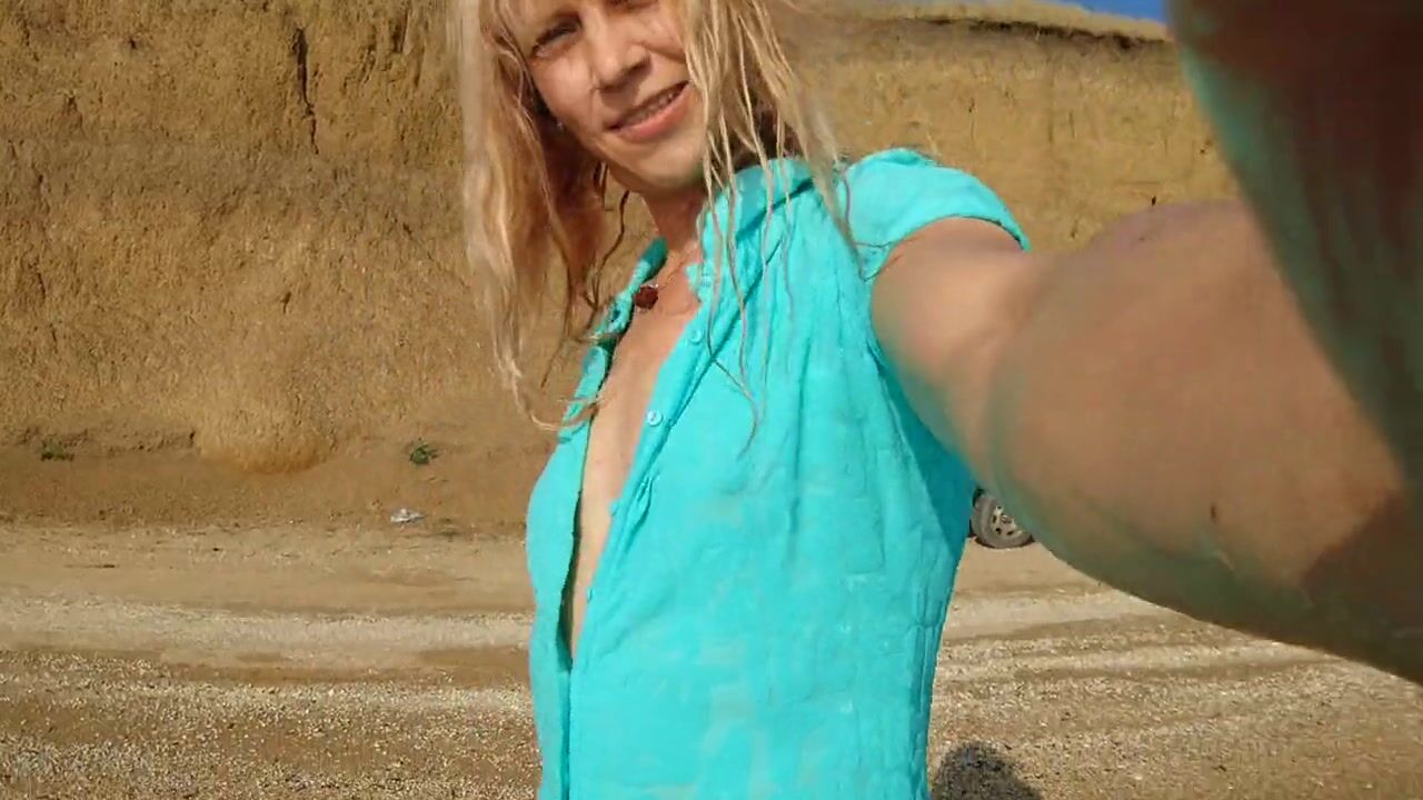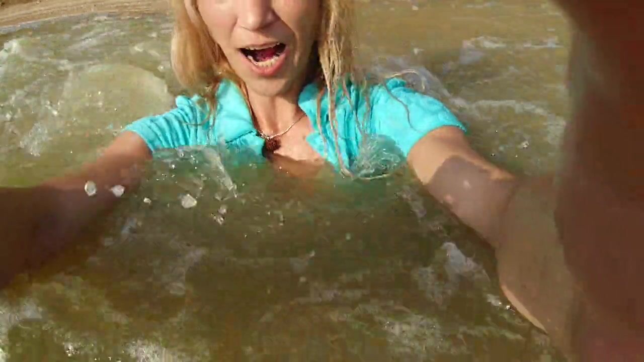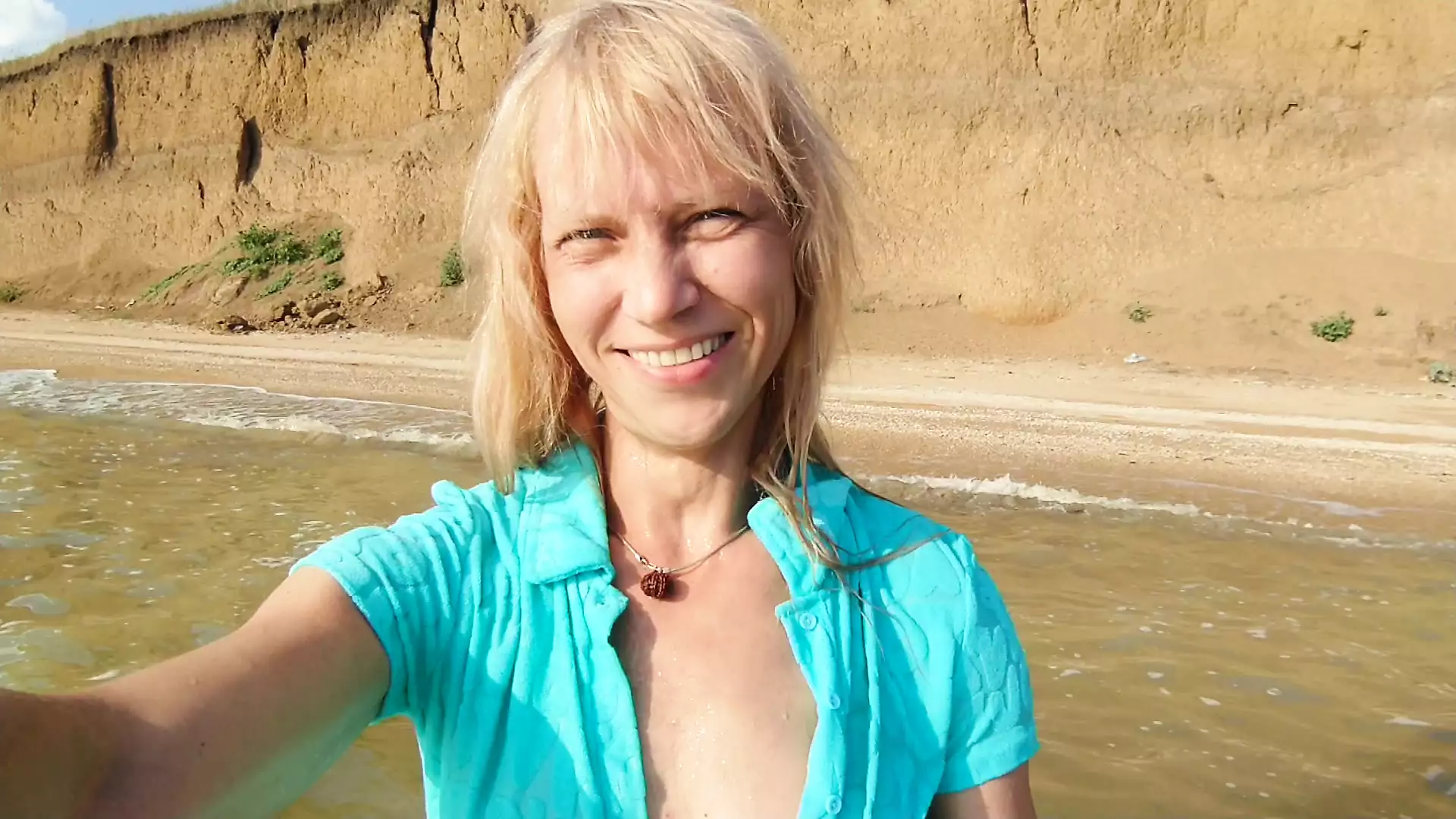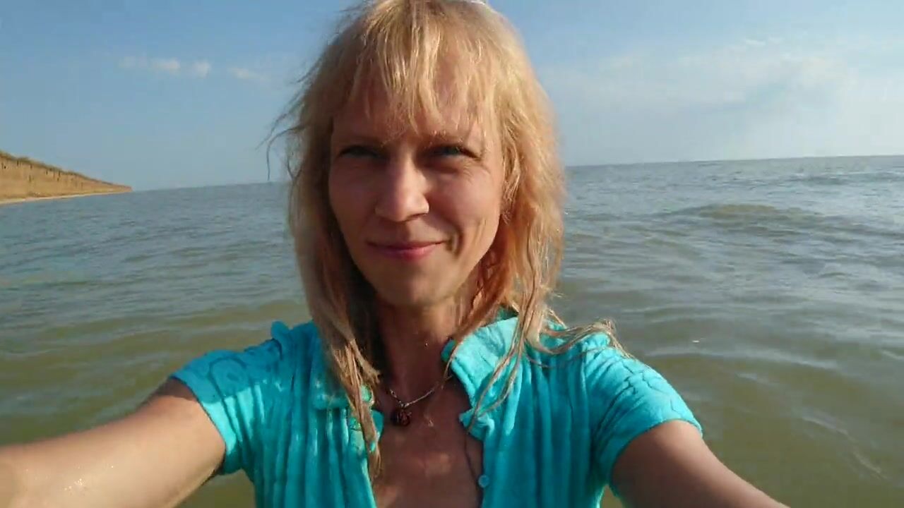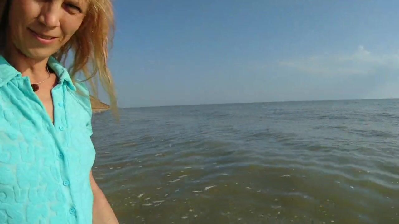 Alexa Cosmic transgirl swimming in the sea first time in teal combi dress