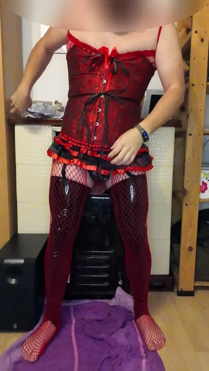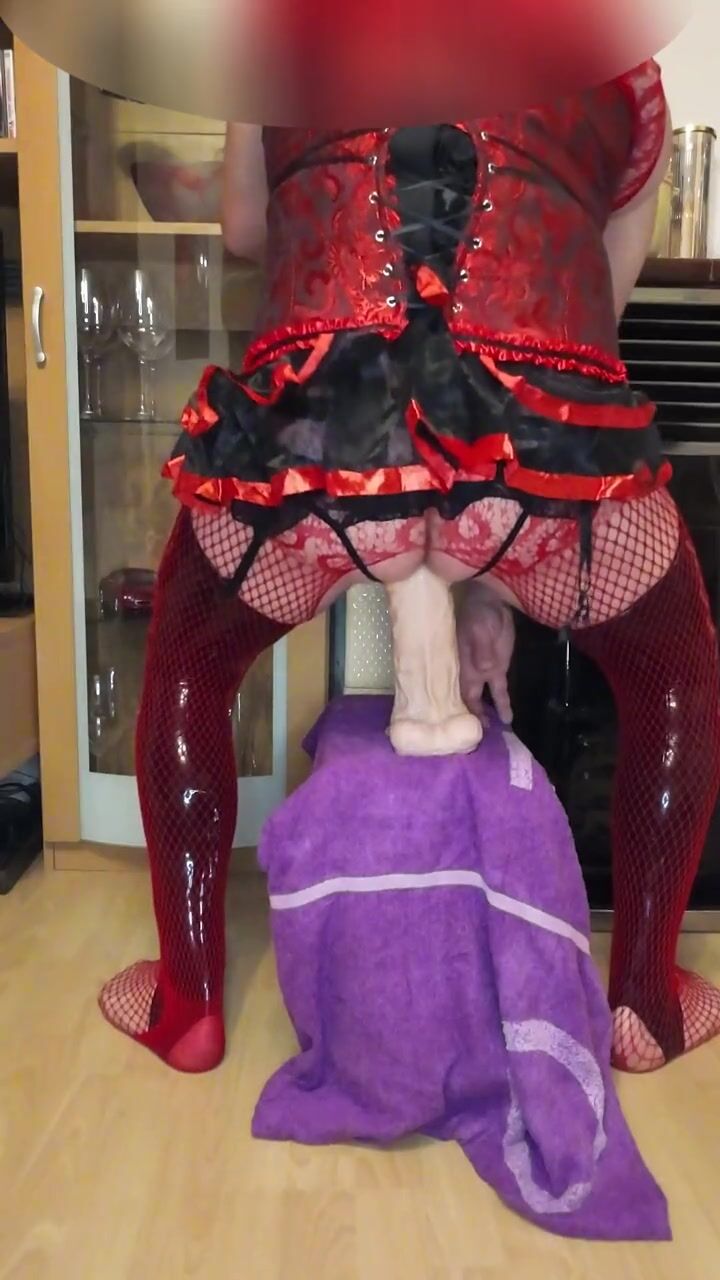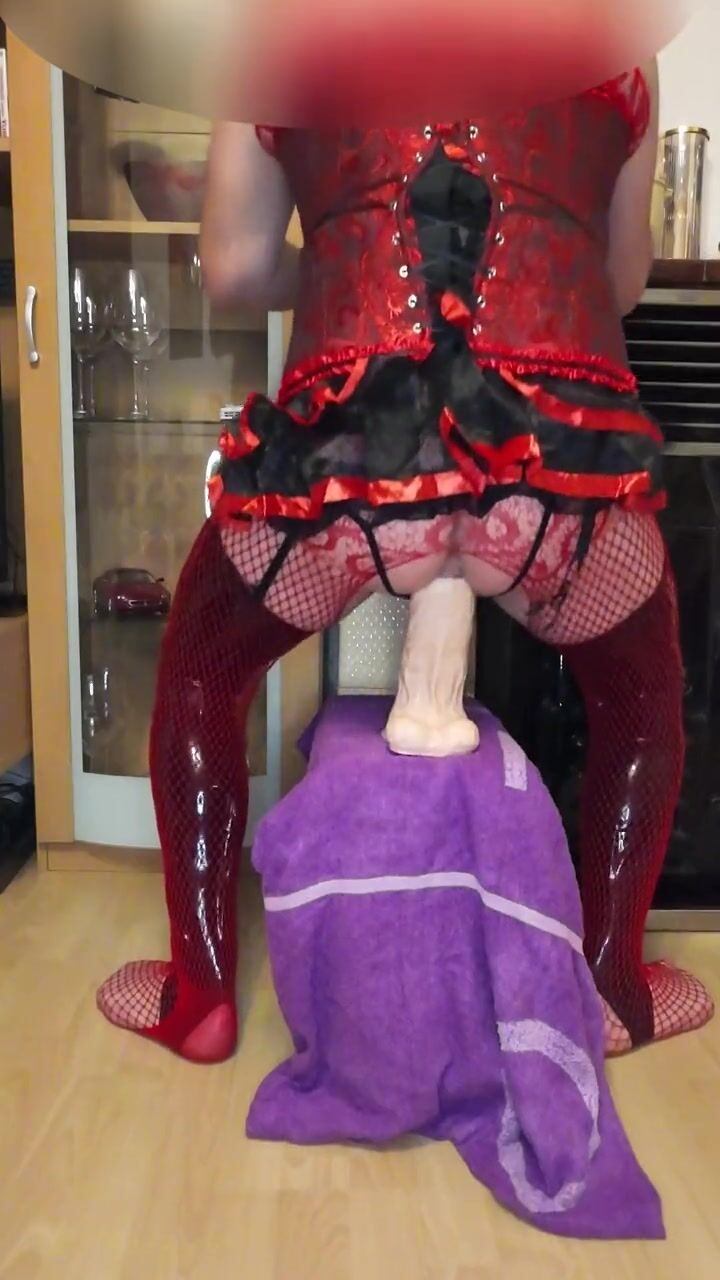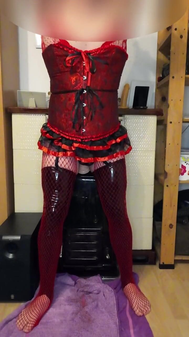 Crossdresser in corsage with mini skirt and latex stockings + fishnet warms up the anal pussy with huge dildos