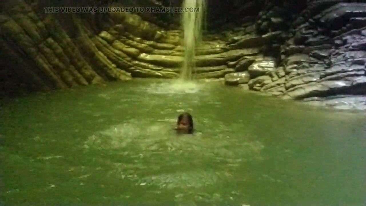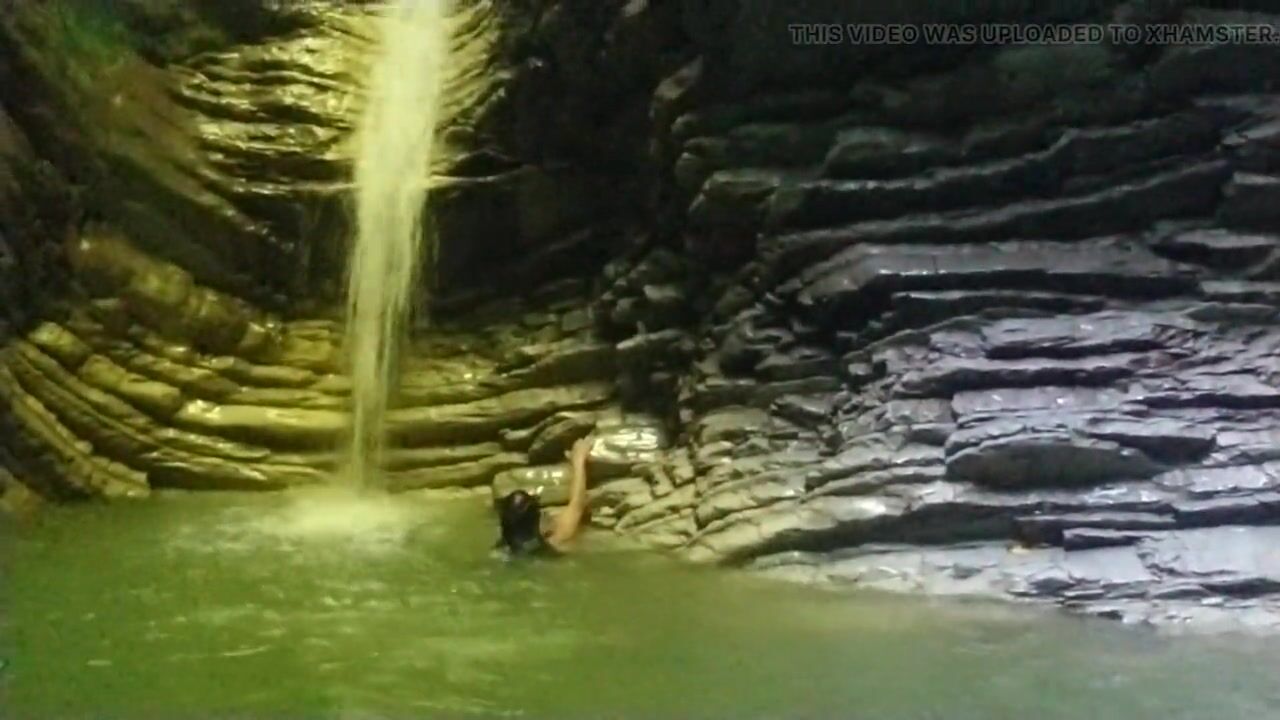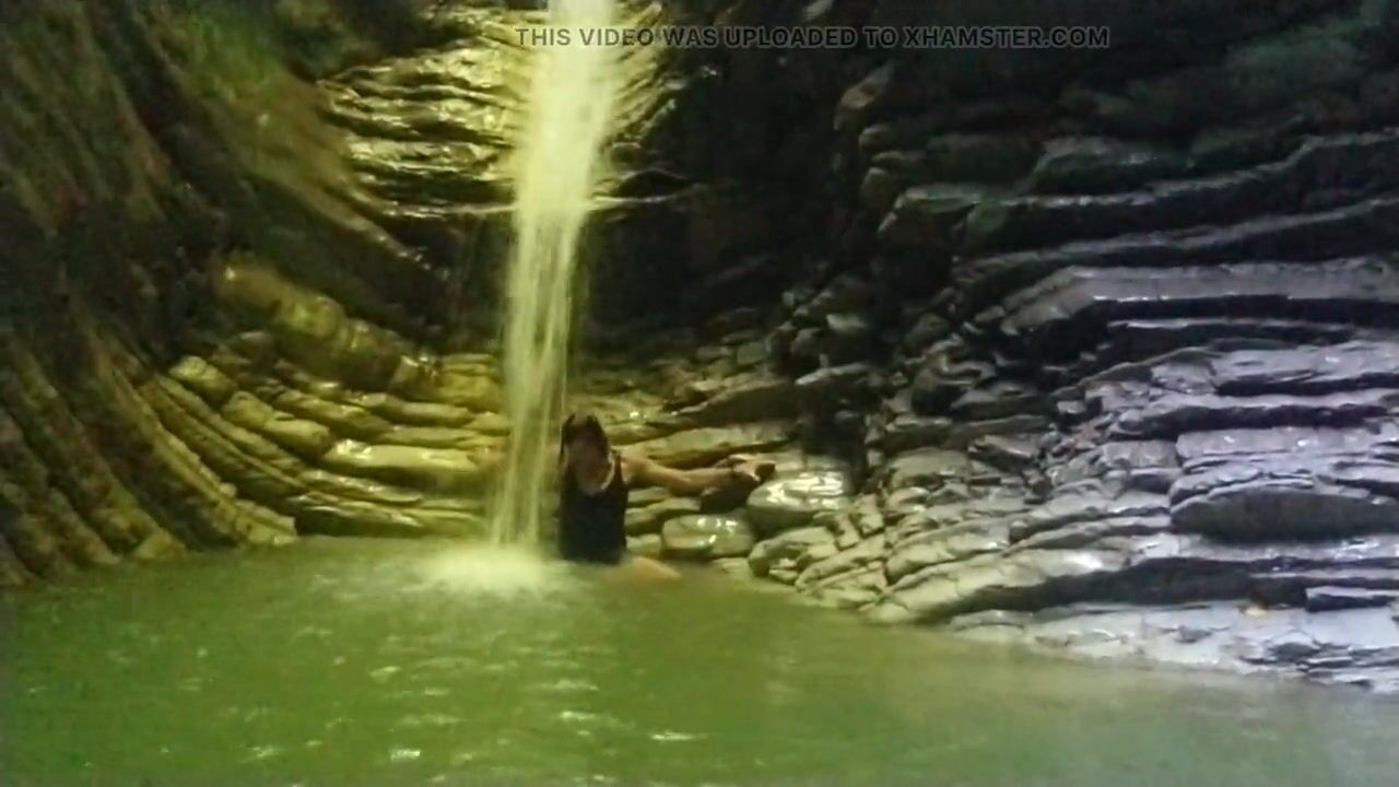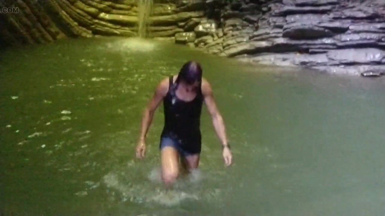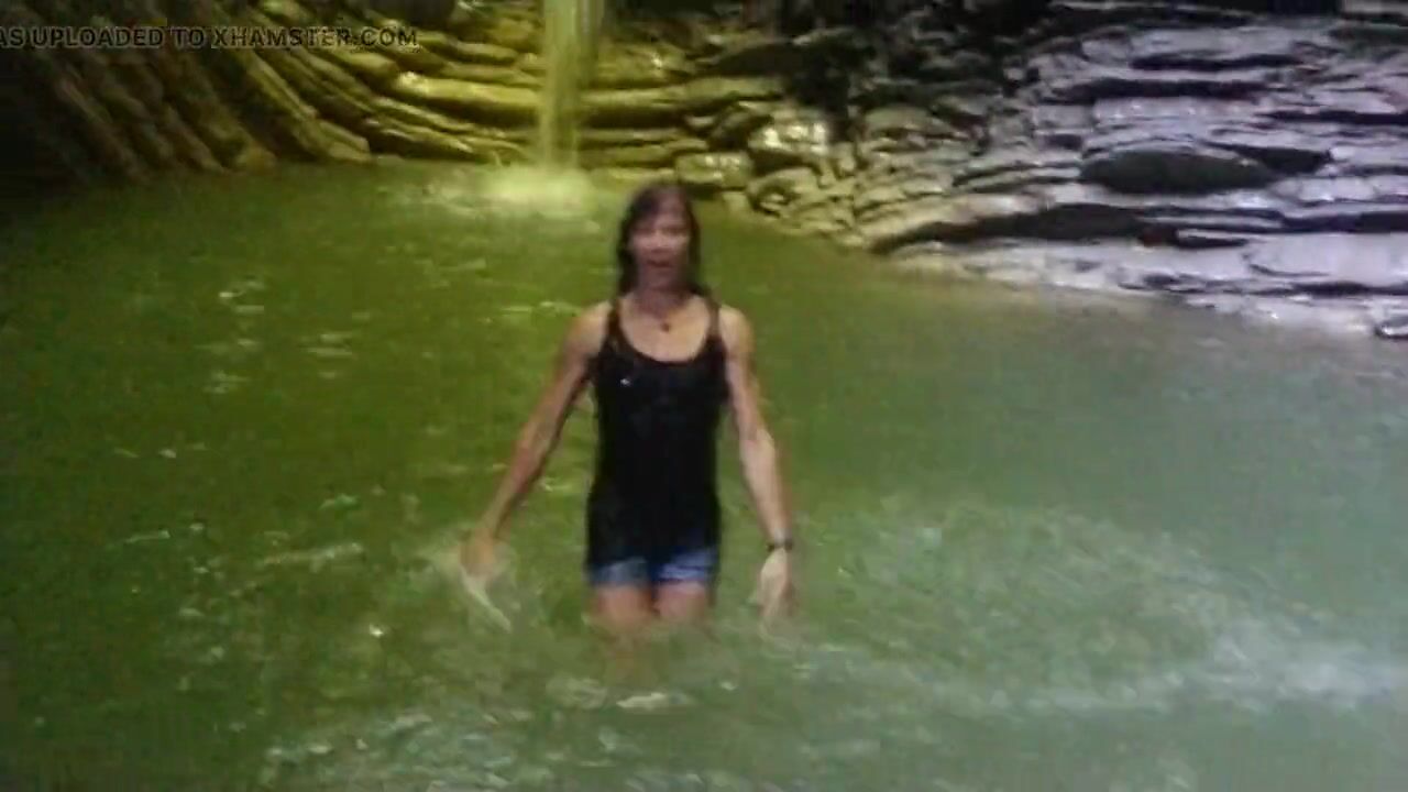 Alexa Cosmic transgirl swimming at waterfall in shirt and t-shirt... 1st waterfall